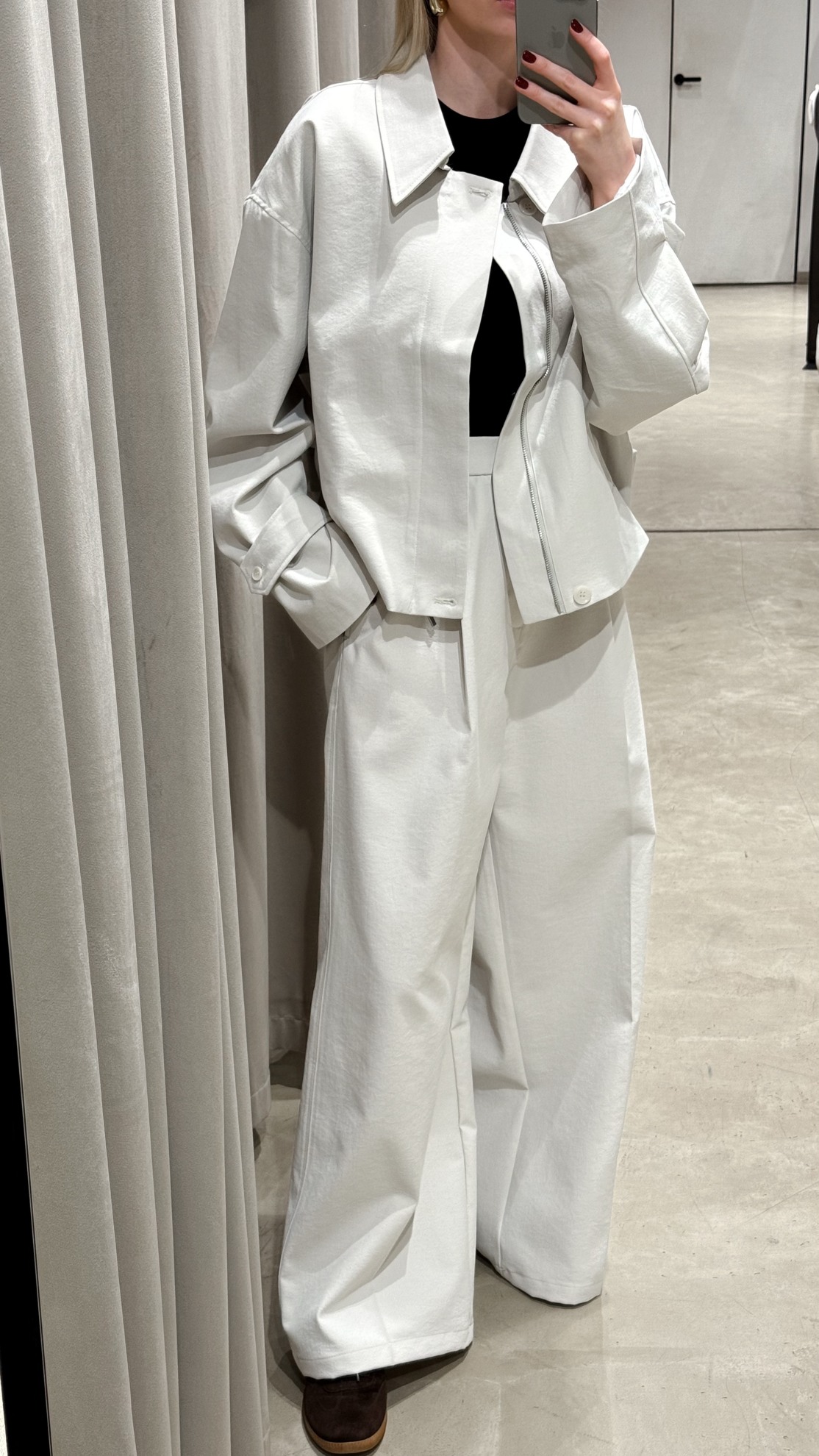 Комплект из свободной куртки и широких брюк. Куртка прямого кроя с крупным воротником и скрытой застежкой на пуговицы. Брюки с заниженной талией и просторными штанинами. Изготовлено из легкой ткани.