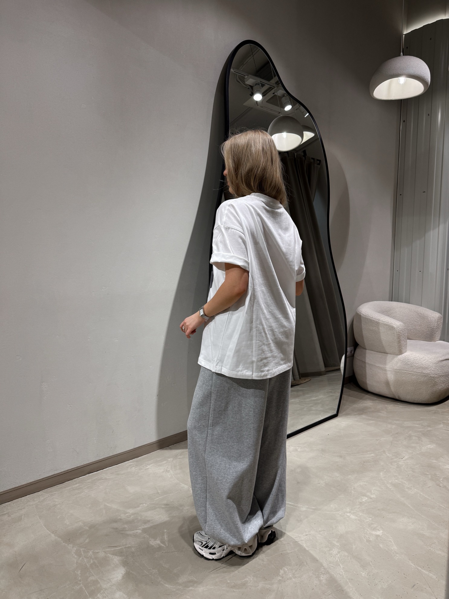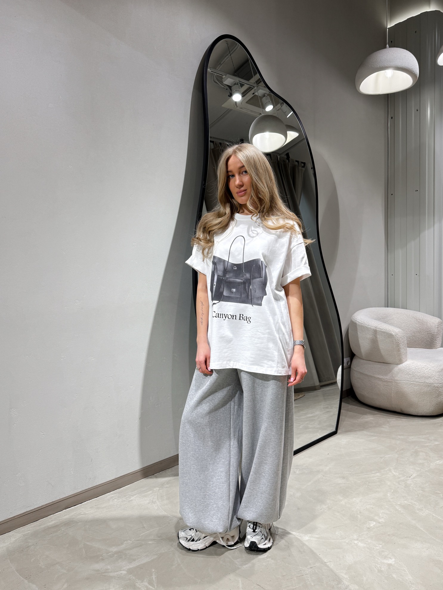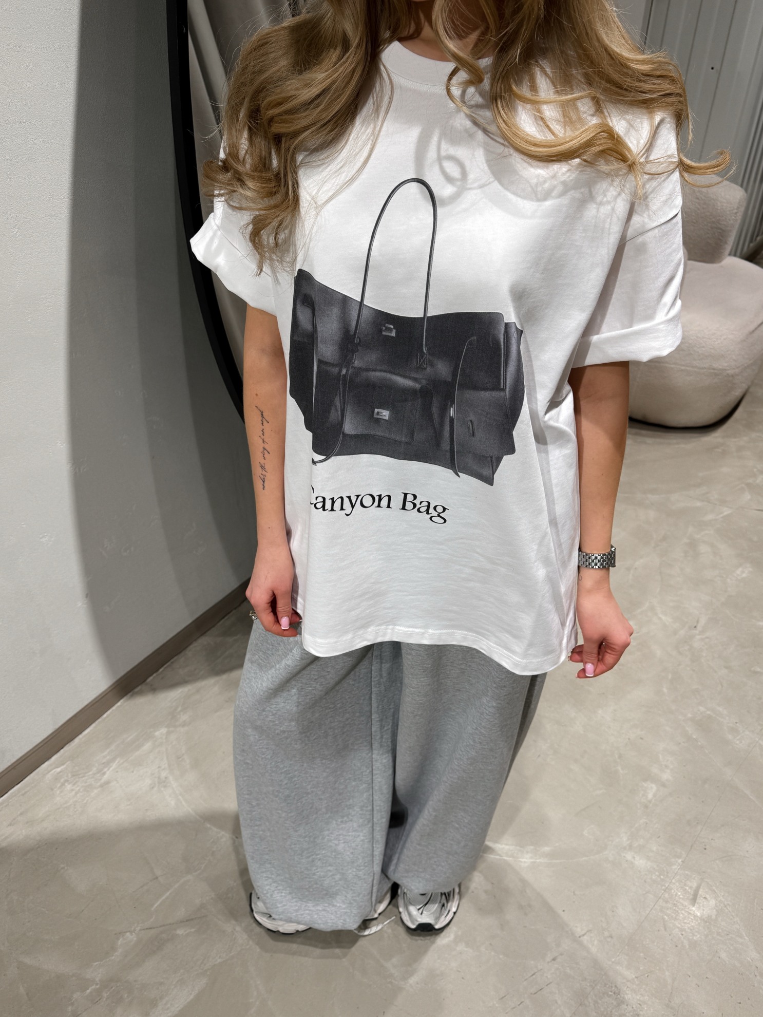Футболка свободного кроя с принтом в виде большого сумочного мотива и надписью на передней части. Модель с круглым вырезом и короткими рукавами.