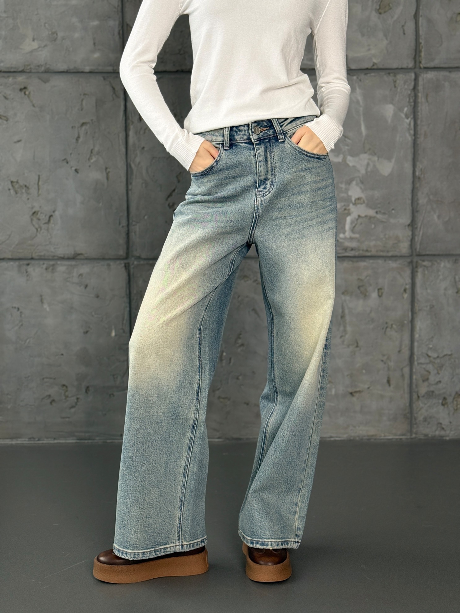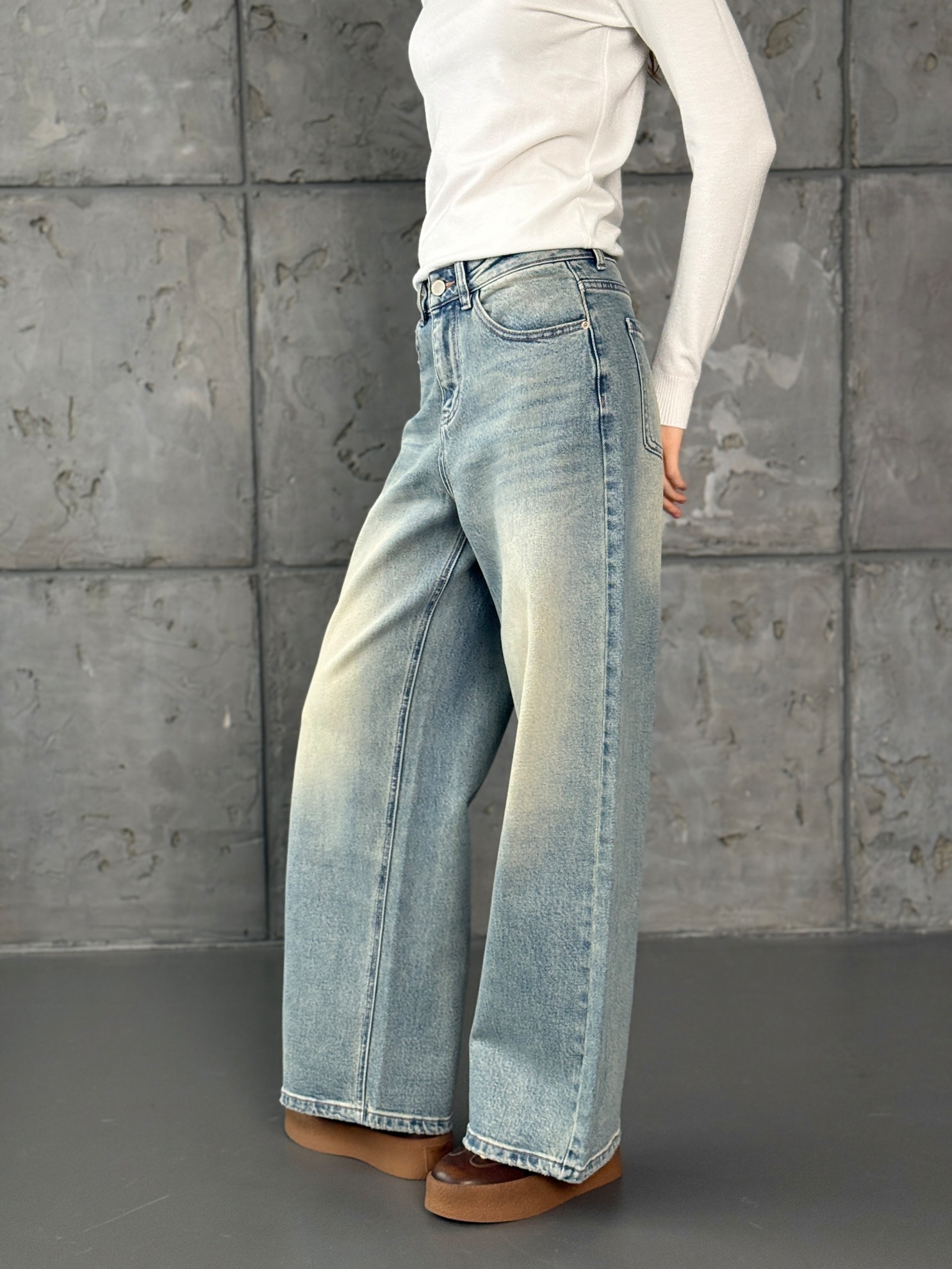 Джинсы из хлопкового денима с эффектом потертости. Свободный крой и высокая посадка. Пять карманов и традиционная застежка на молнии с пуговицей.
