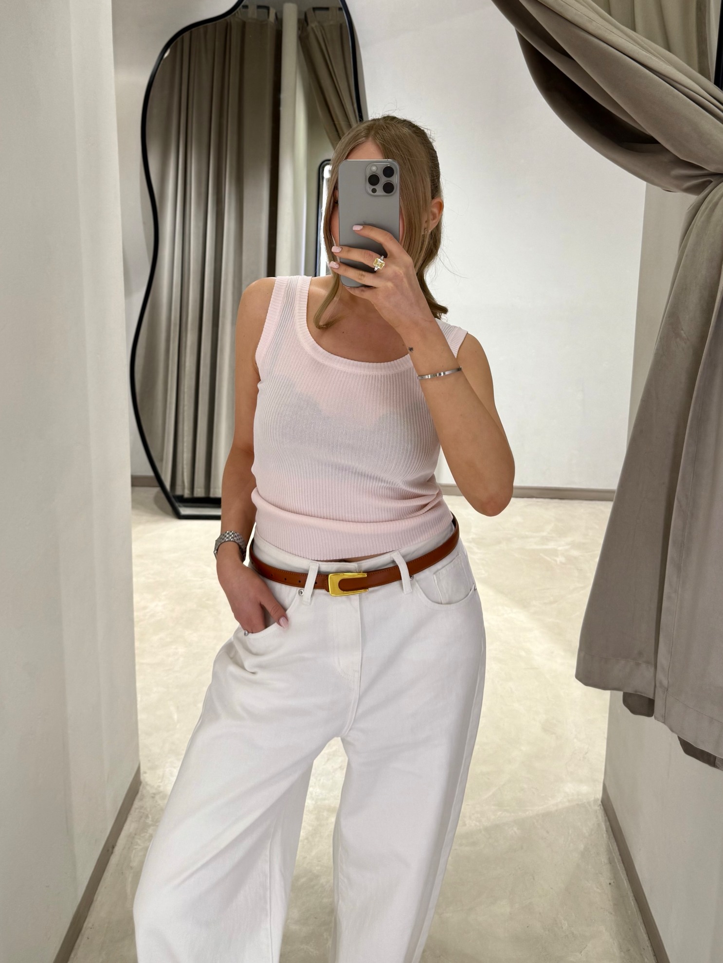 Майка без рукавов с круглым вырезом и фактурой в рубчик. Трикотажное полотно с прилегающей посадкой по фигуре.
