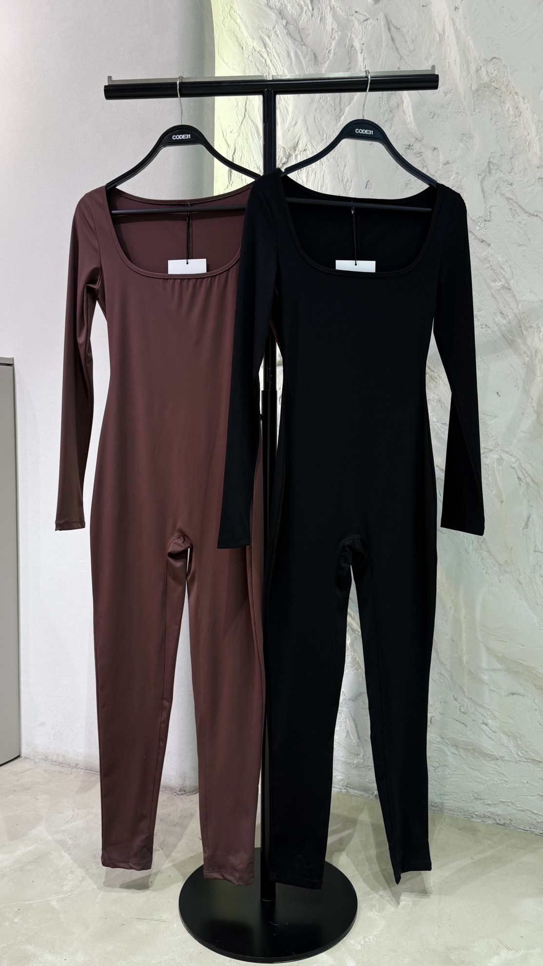 Приталенный комбинезон с длинными рукавами и квадратным вырезом горловины. Облегающий крой по фигуре. Узкие брючины в полный рост. Выполнен из эластичного трикотажа.