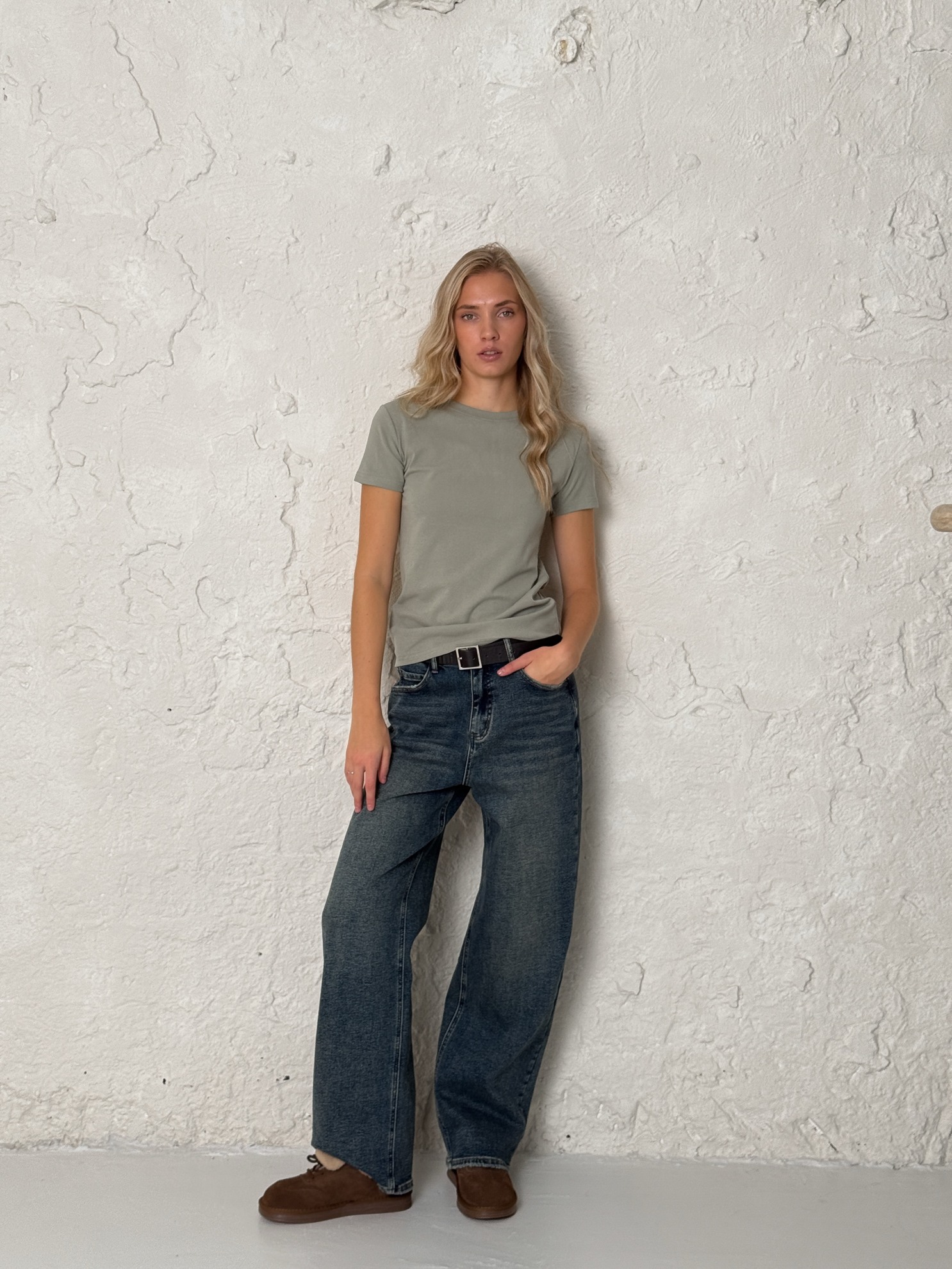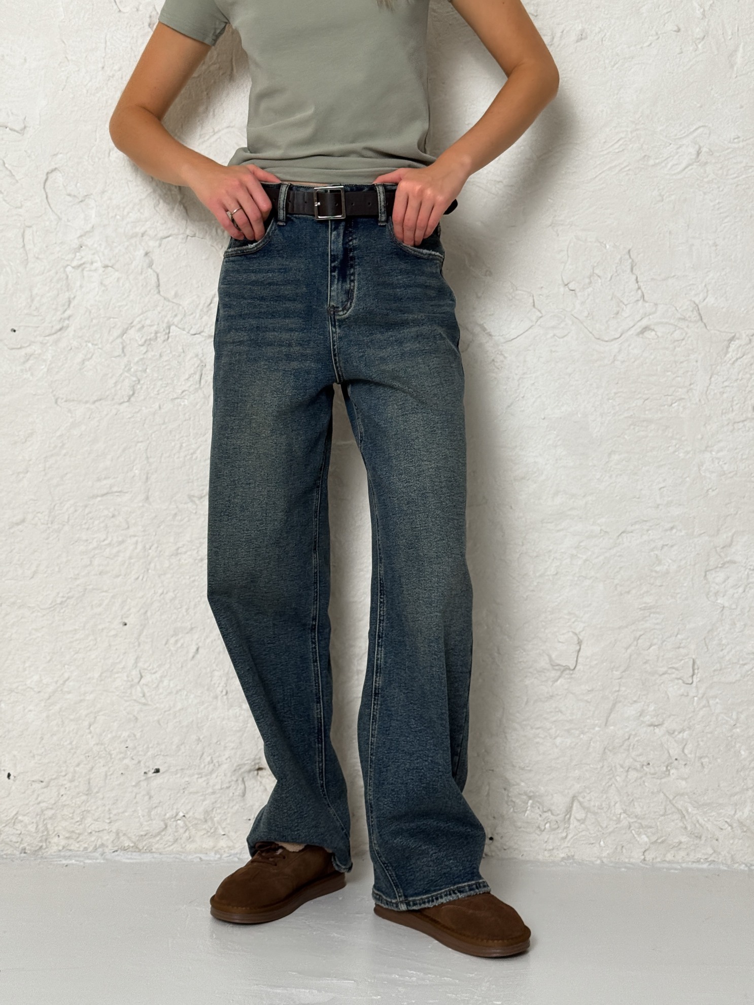 Джинсы прямого широкого кроя с высокой посадкой и полной длиной. Пять карманов, шлевки для ремня. Хлопковый деним с эффектом потертости. Застежка на молнию и пуговицу спереди.