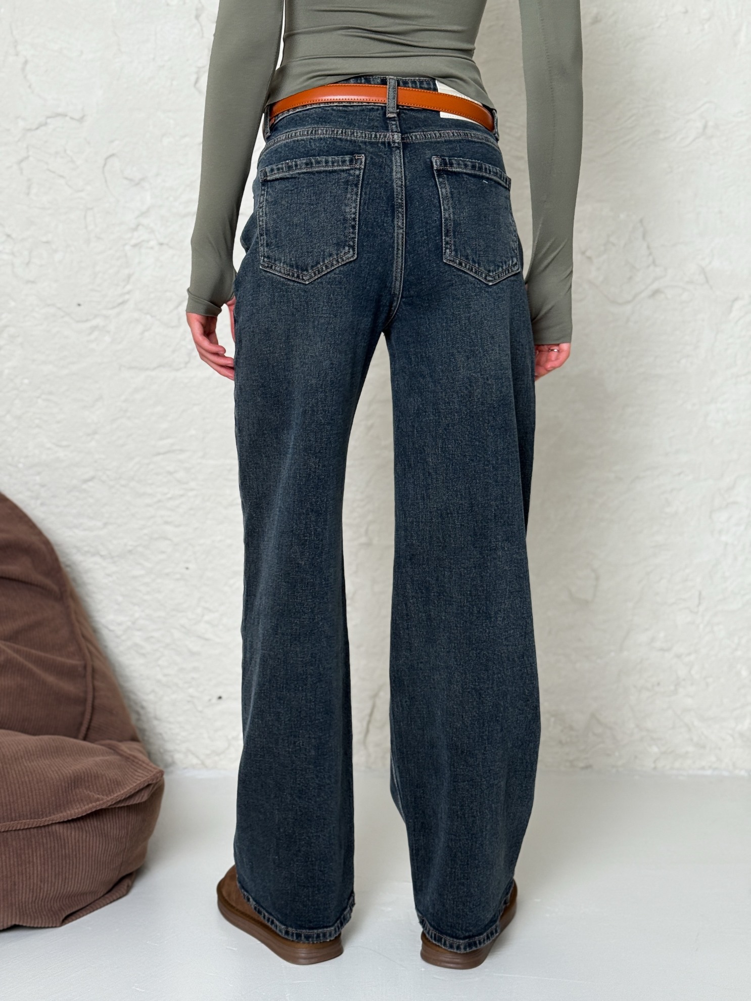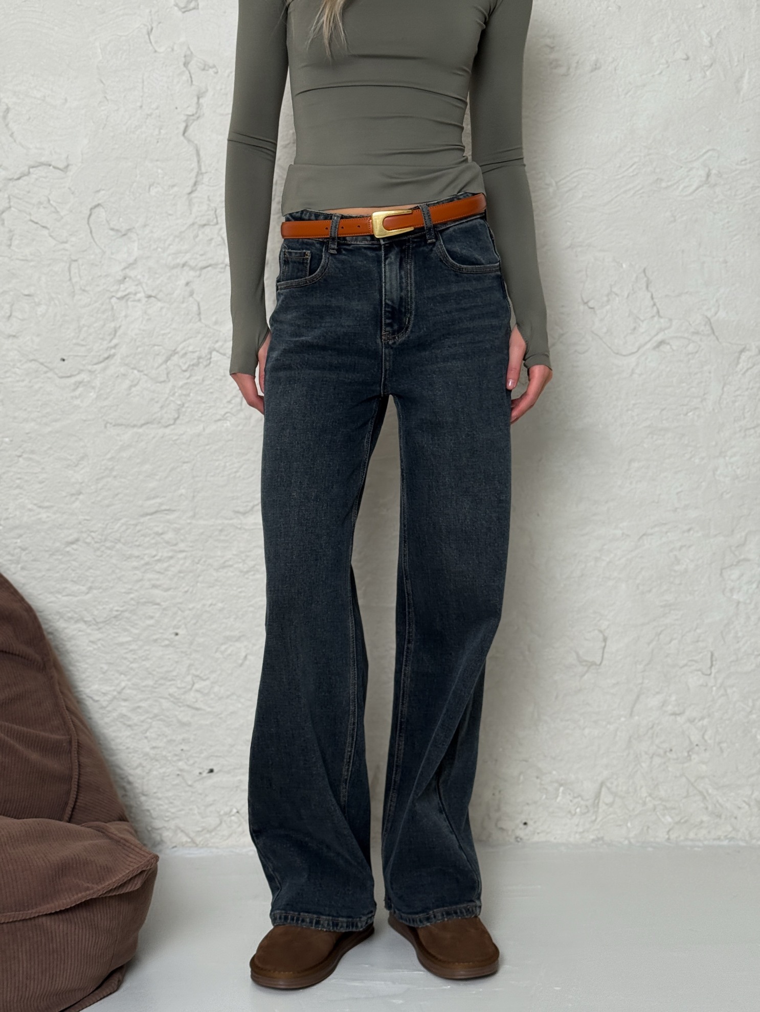 Прямые джинсы с высокой посадкой и широкой штаниной по всей длине. Хлопковый деним темно-синего вареного оттенка. Классическая пятикарманная конструкция, шлевки по поясу, застежка на молнию и пуговицу спереди.