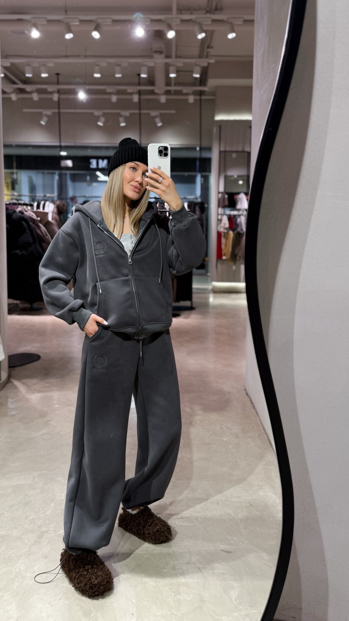 Утепленный трикотажный комплект из худи на молнии с капюшоном и карманами и широких брюк на резинке со шнурком и начесом внутри.