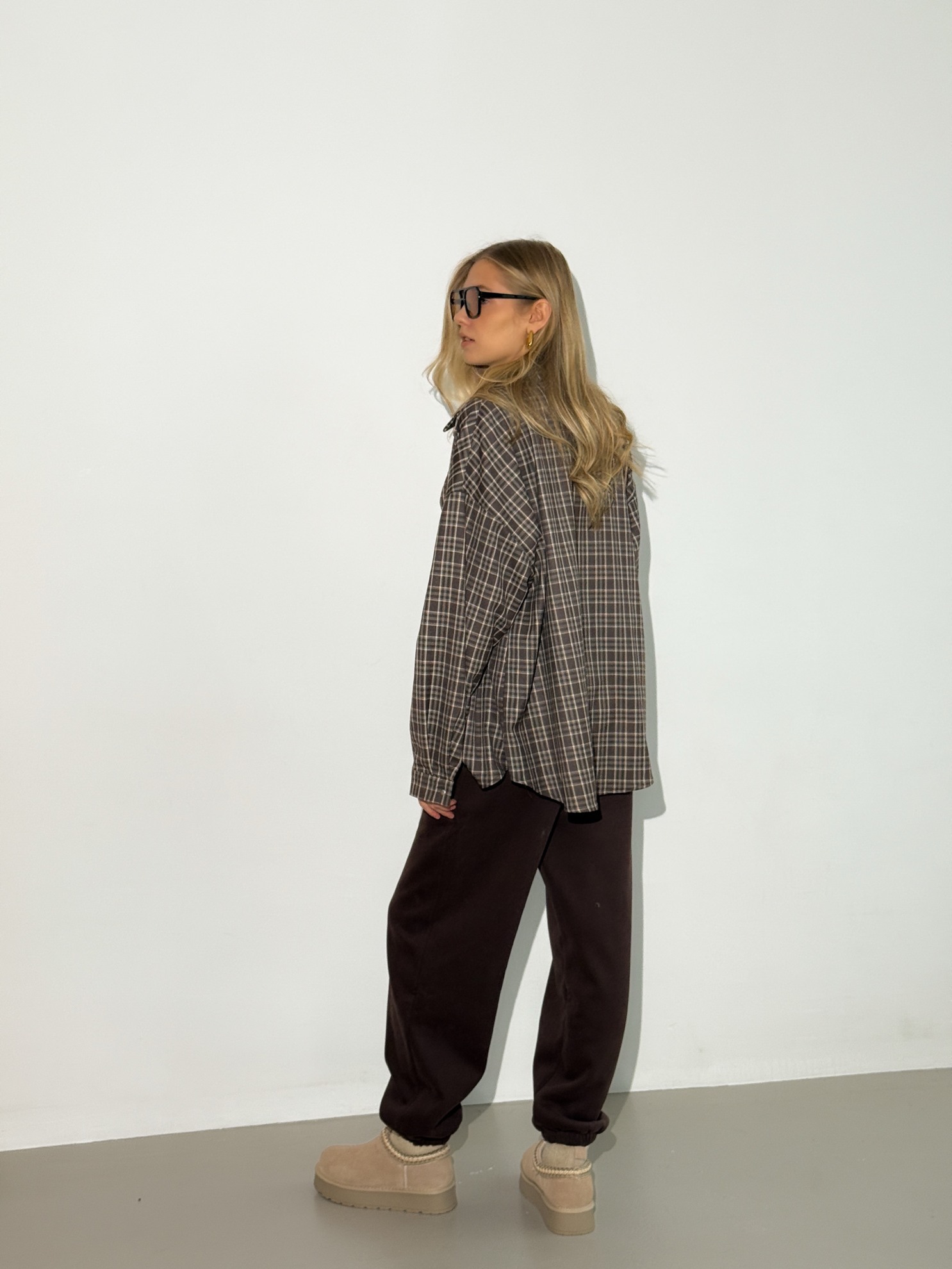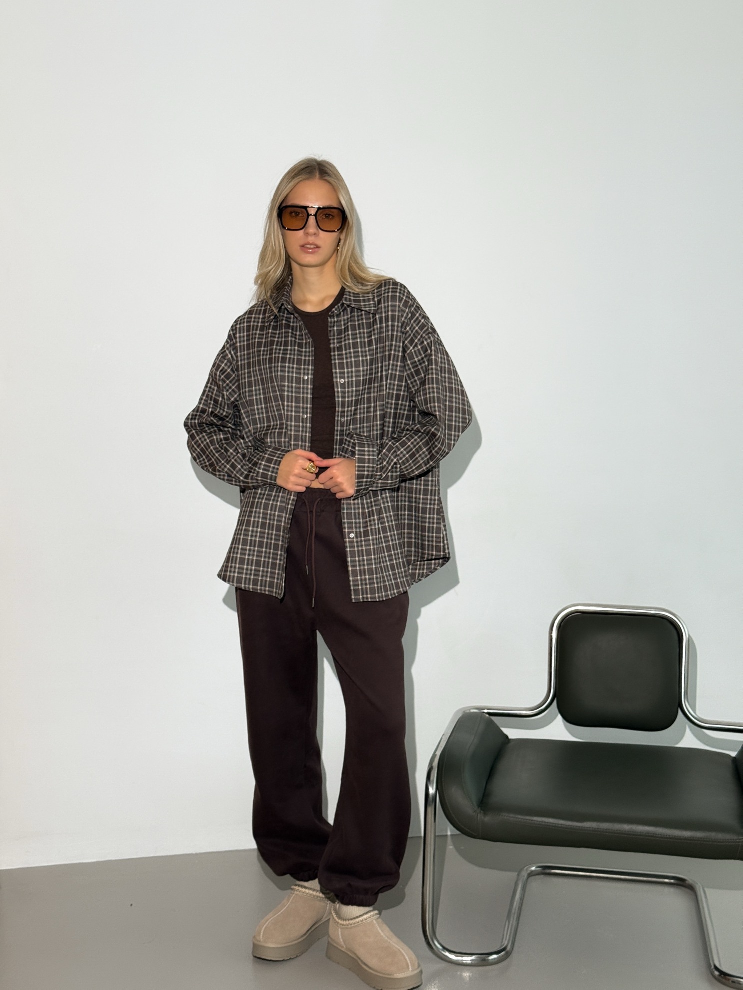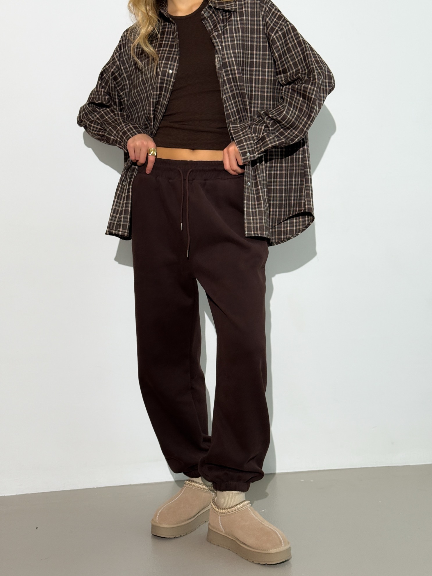 Прямые утепленные брюки свободного кроя с эластичным поясом на кулиске и боковыми карманами. Плотный материал, полноразмерная длина.