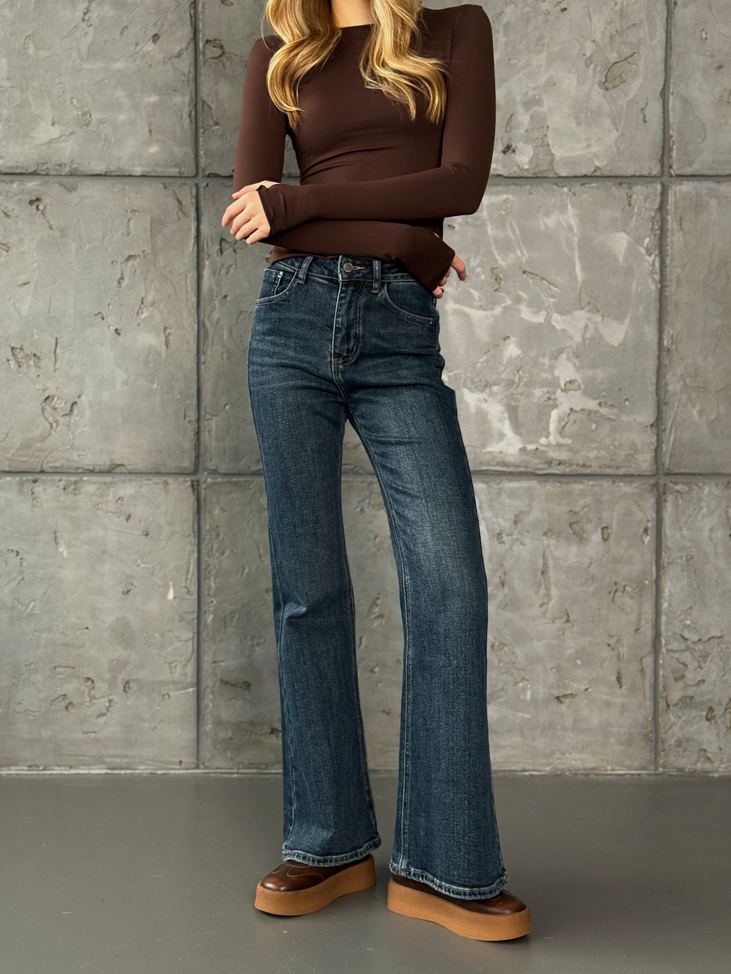 Джинсы с высокой посадкой и расклешенными от колена брючинками. Темно-синий хлопковый деним без эффекта потертостей. Классические пять карманов, шлевки для ремня, оформленная кокетка сзади. Застежка на молнию и пуговицу.