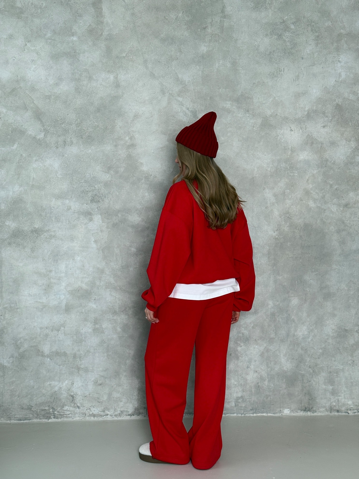 Утепленный комплект из худи и брюк свободного кроя. Худи с воротником-стойкой на короткой молнии, принтом спереди, спущенной линией плеча и трикотажными манжетами. Брюки с эластичным поясом и широкими прямыми штанинами из мягкого утепленного трикотажа.