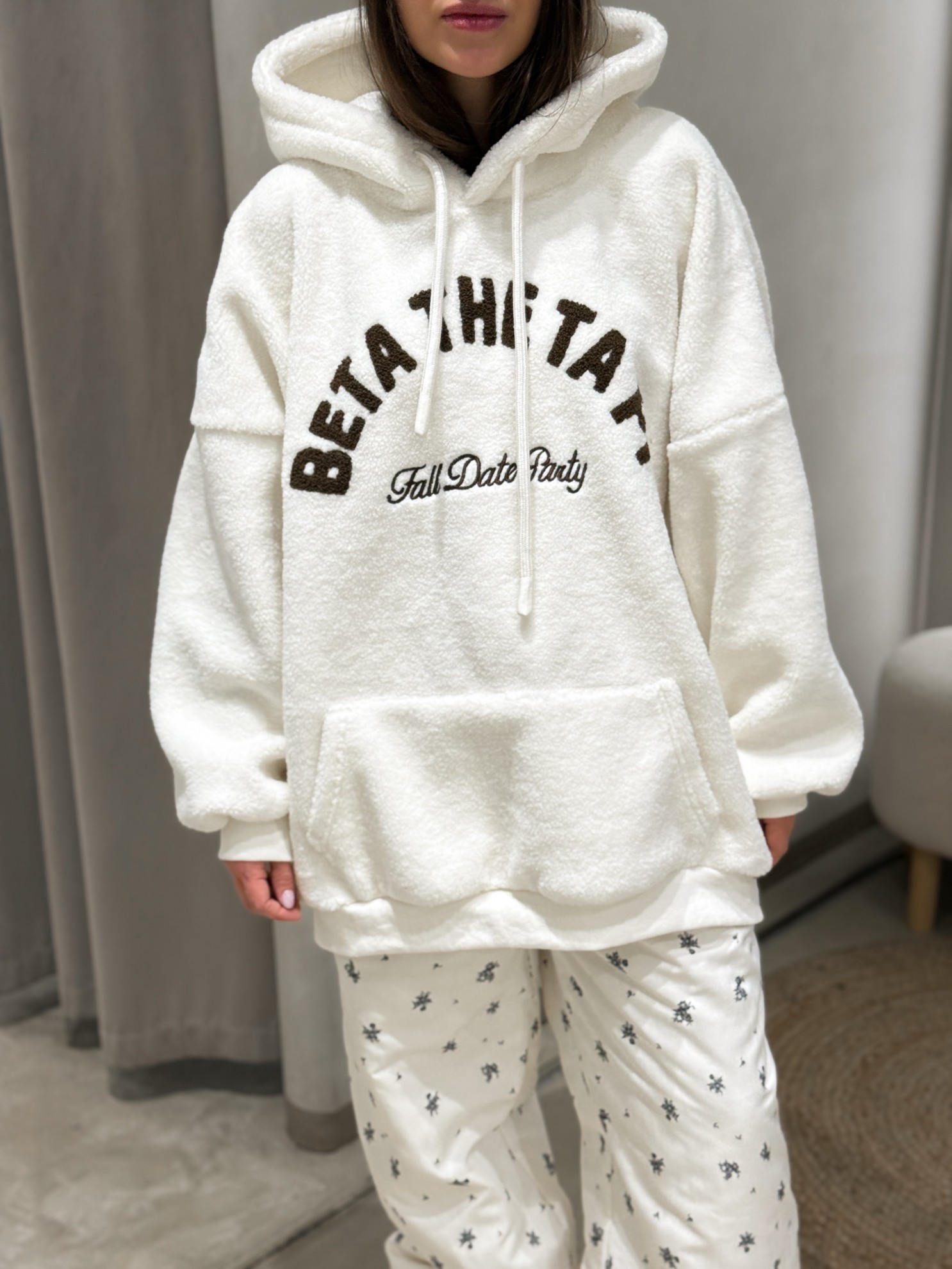 Утепленное худи свободного кроя из мягкого фактурного трикотажа. Капюшон на кулиске, длинные рукава со спущенной линией плеча. Объемный карман-кенгуру. Контрастная надпись спереди.