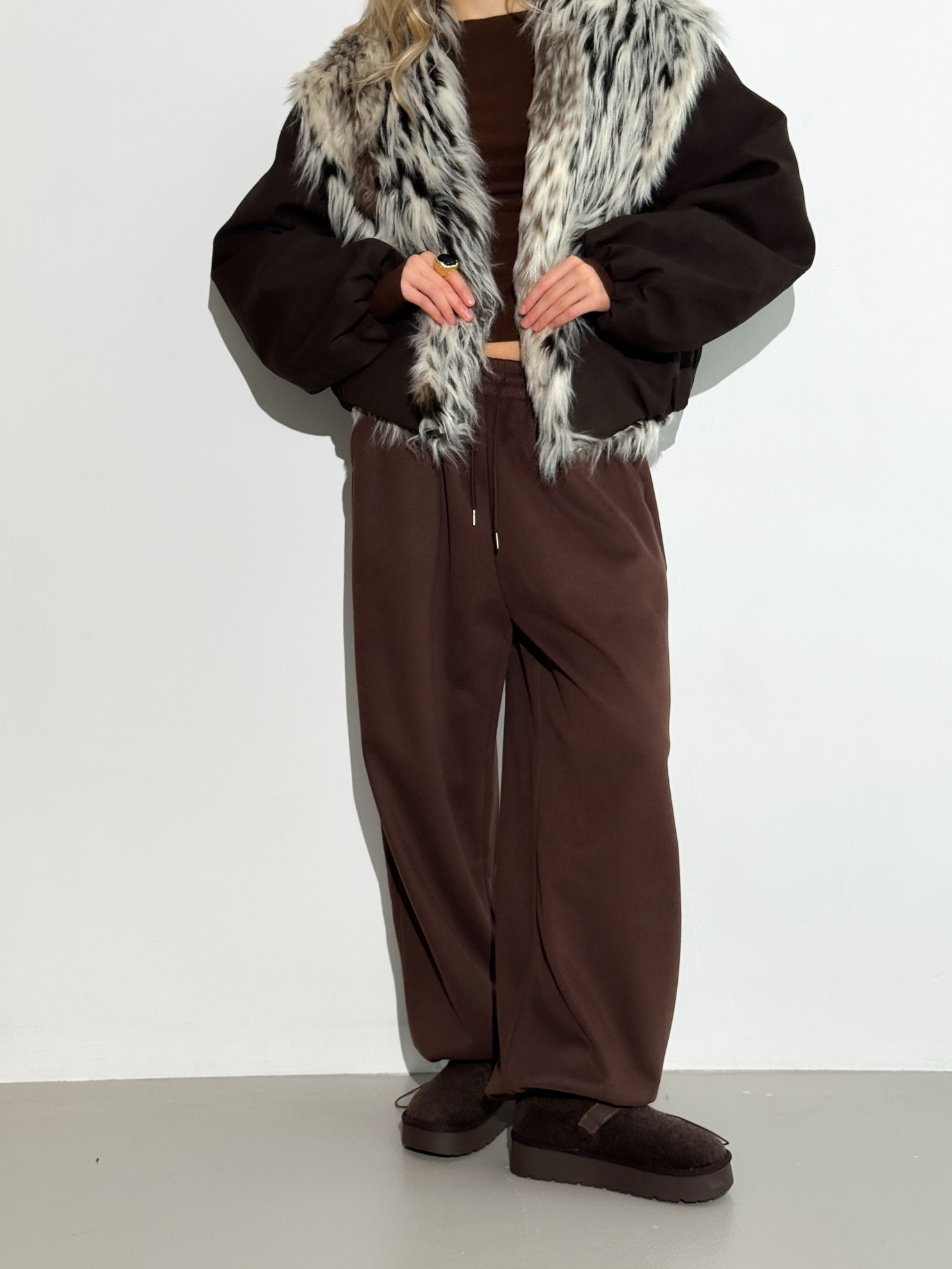 Брюки свободного кроя полной длины с эластичным поясом на кулиске и боковыми карманами. Утепленный трикотаж с мягким начесом.