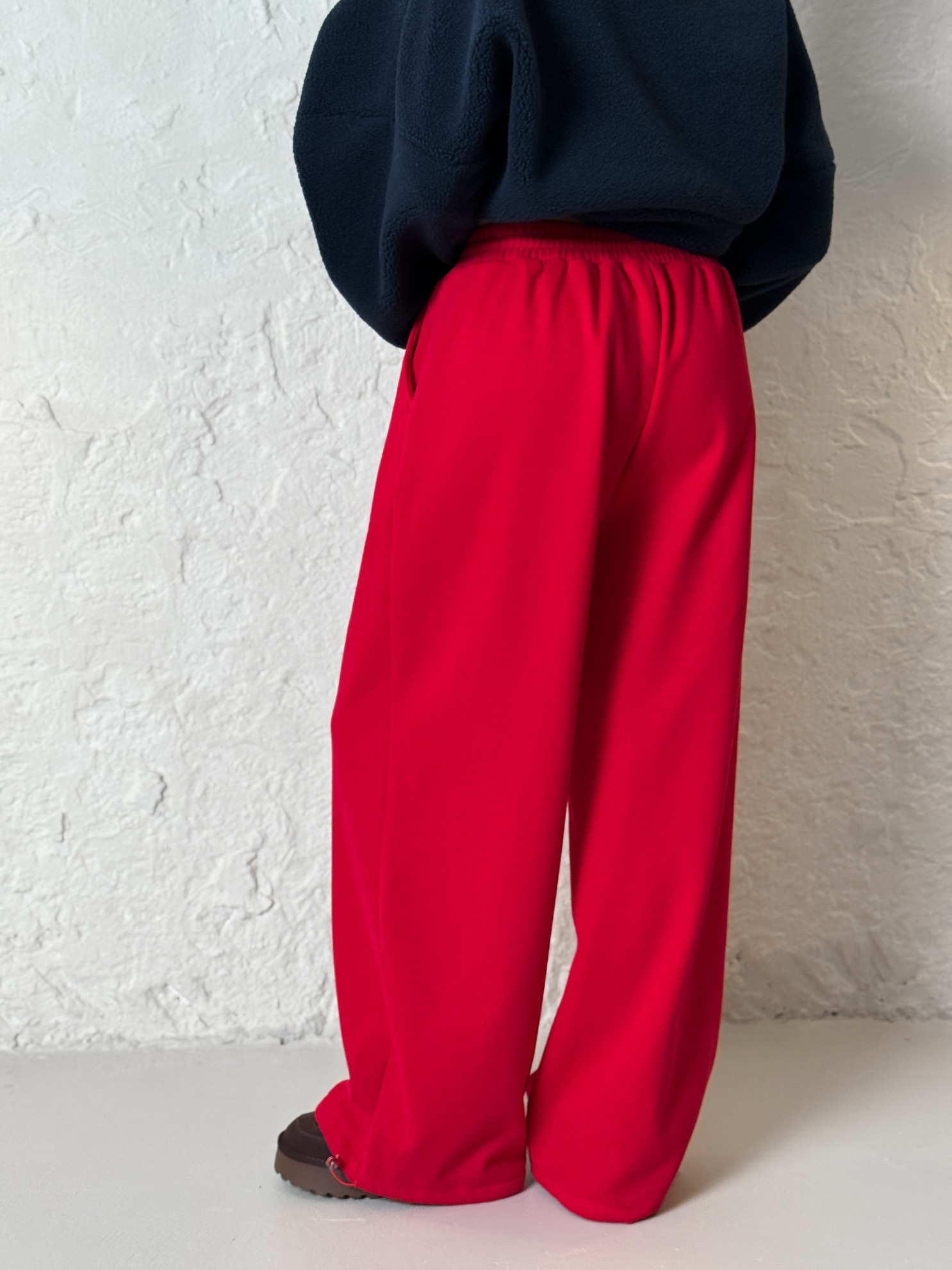 Утепленные брюки прямого свободного кроя с широкими длинными штанинами. Однотонный материал без декоративных деталей и манжет по низу.