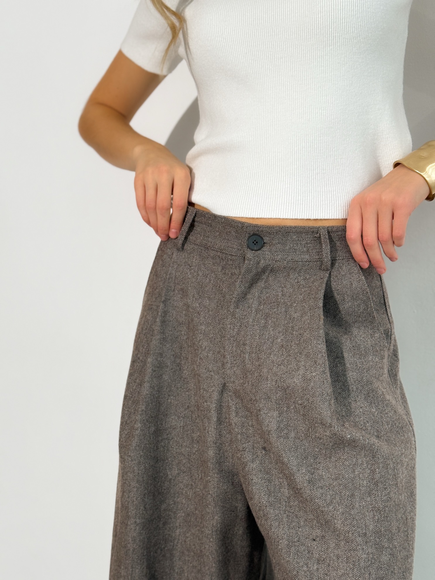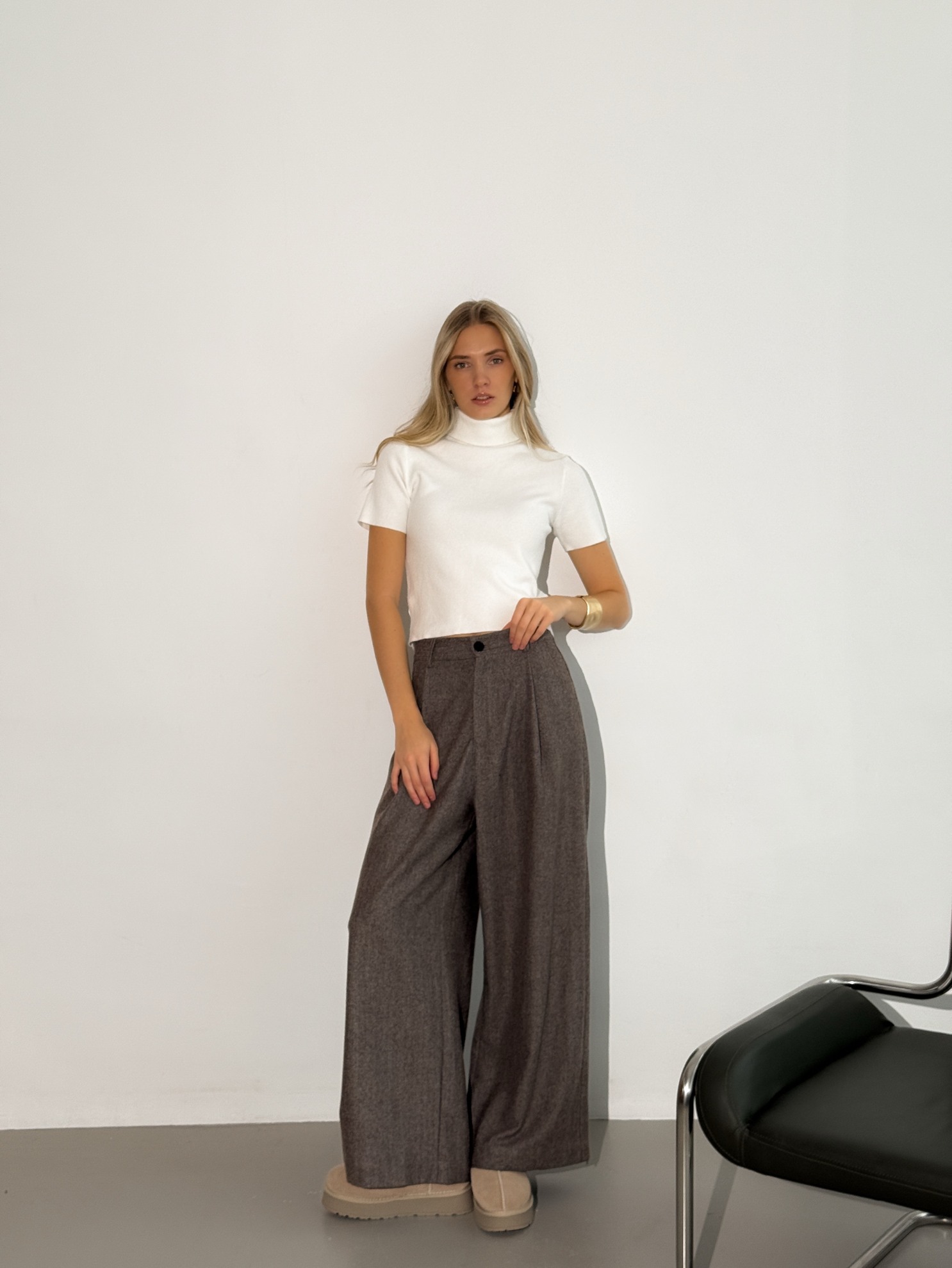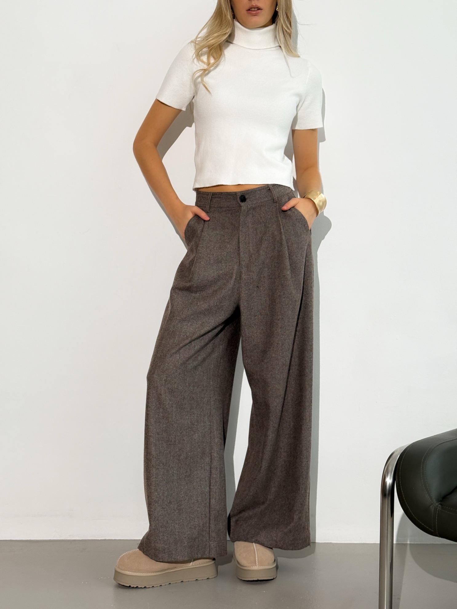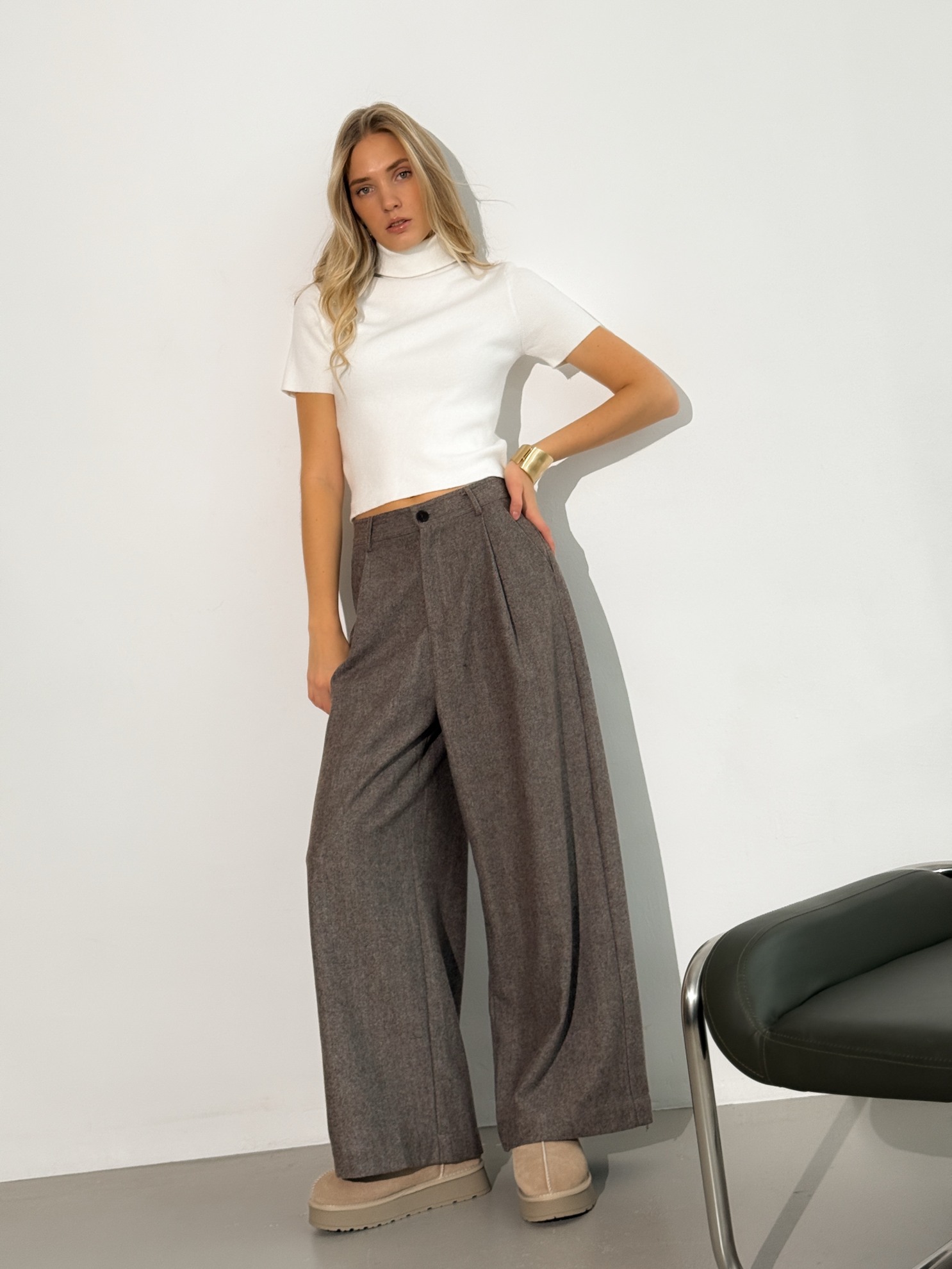 Брюки широкого прямого кроя с высокой посадкой и мягкими защипами на линии талии. Боковые прорезные карманы. Застежка на молнию и пуговицу. Выполнены из костюмной ткани.