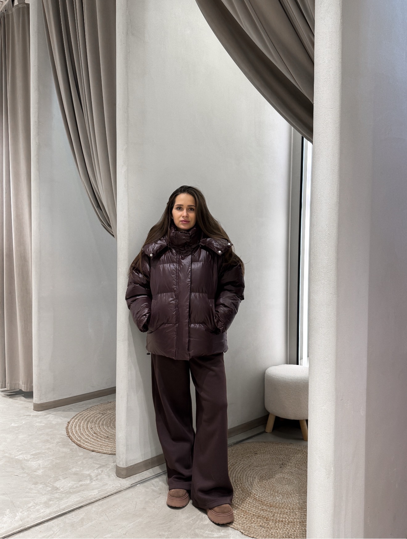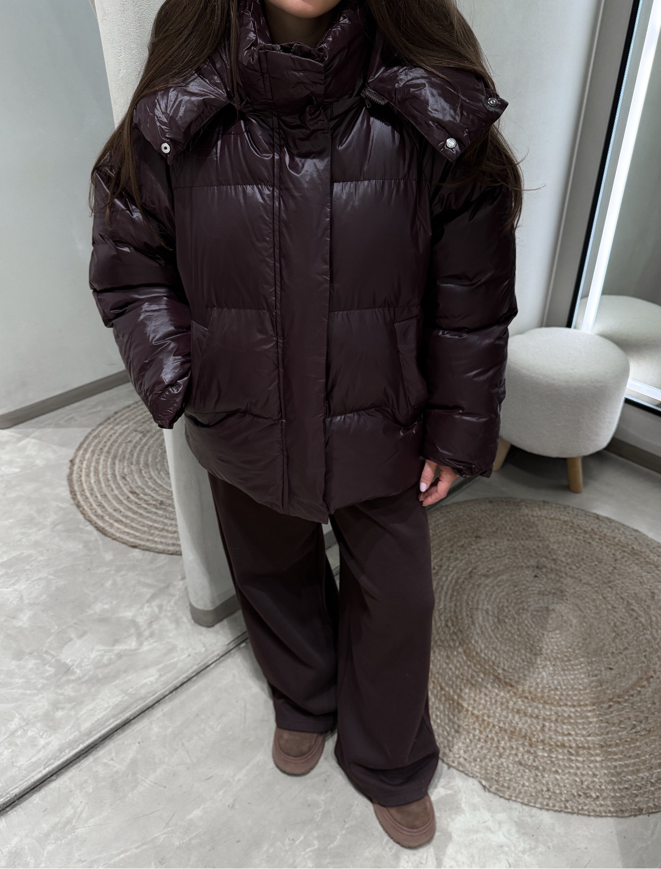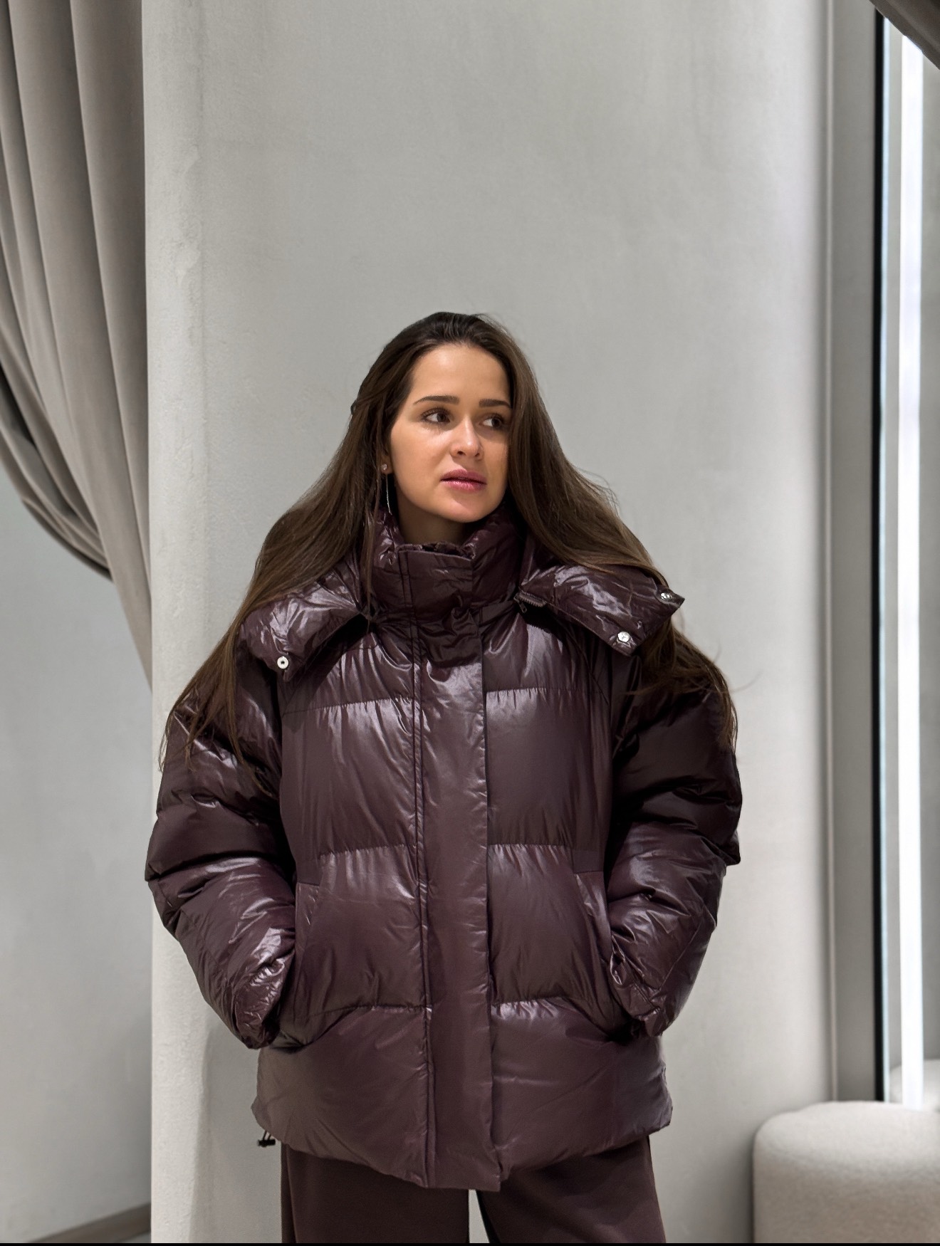 Объемная стеганая куртка свободного кроя с горизонтальной стежкой и длиной до линии бедер. Втачной капюшон. Центральная застежка на молнию с планкой на кнопках. Боковые прорезные карманы. Эластичные манжеты по низу рукава и прямой низ изделия.