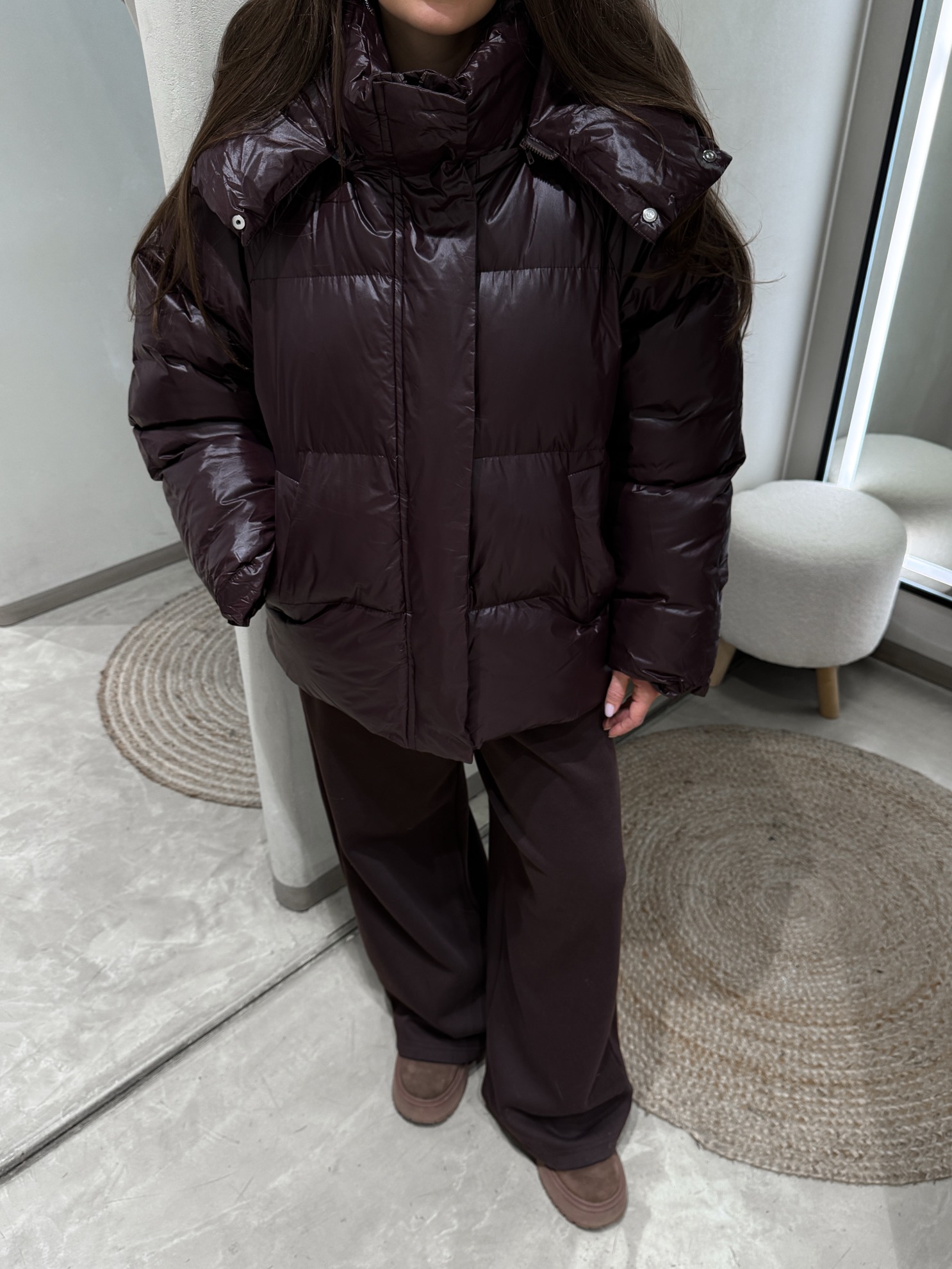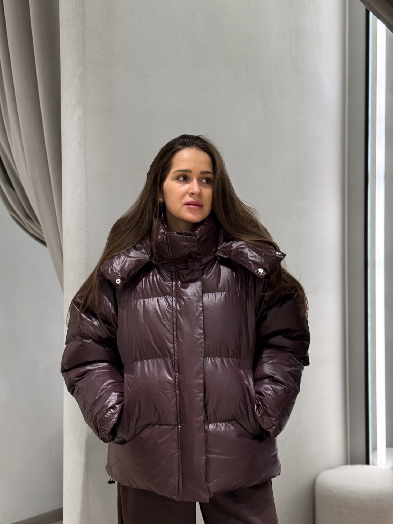 Стеганая куртка прямого кроя до линии бедер с высоким воротником и съемным капюшоном. Гладкая ткань с легким блеском. Утепленная подкладка. Застежка на молнию с планкой на кнопках. Прорезные карманы по бокам. Кулиска по низу.