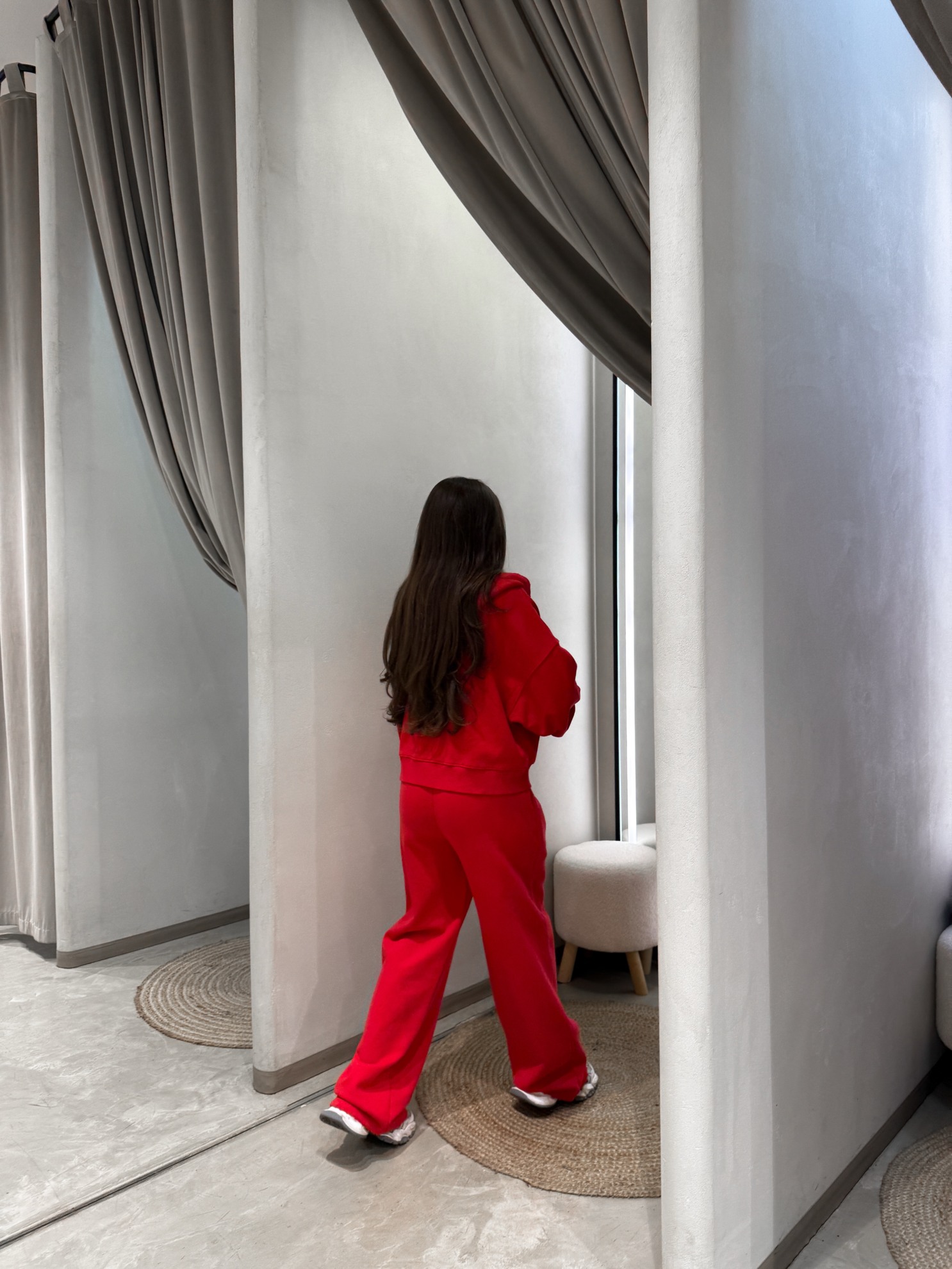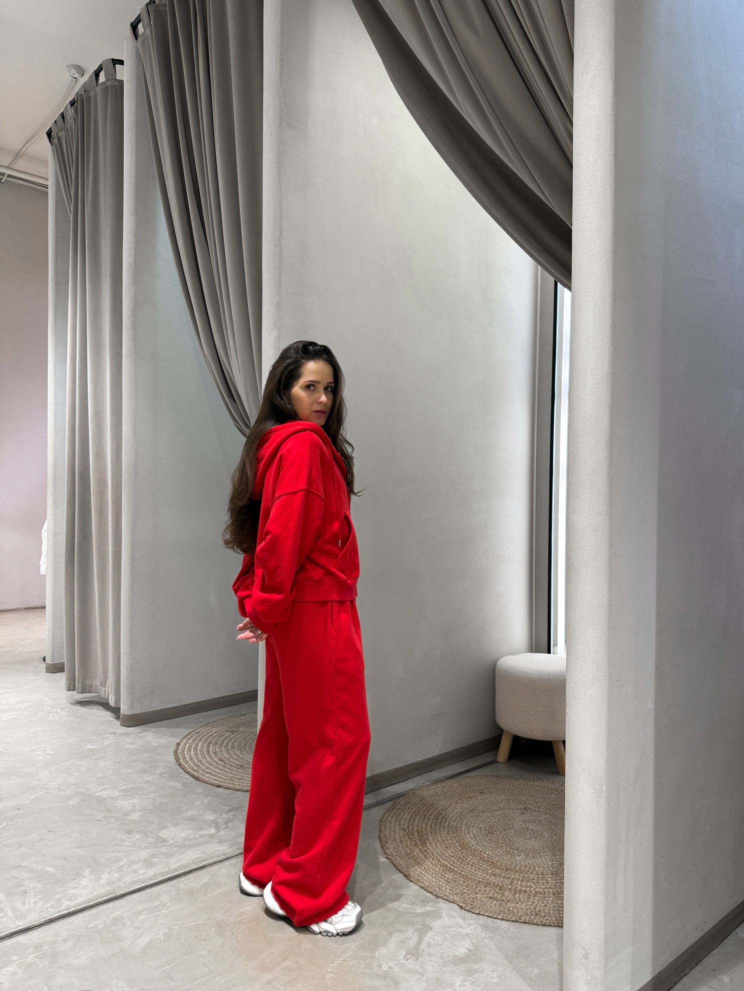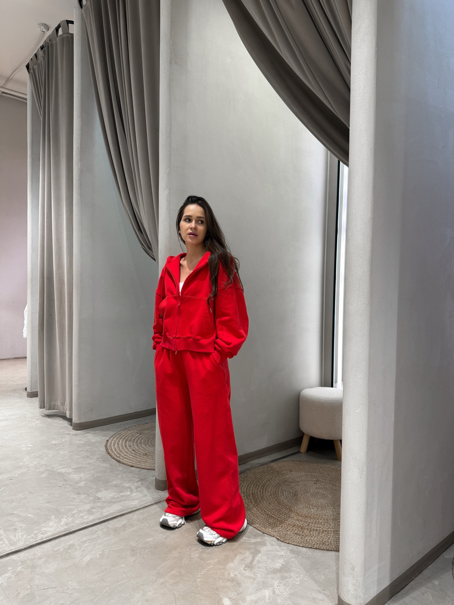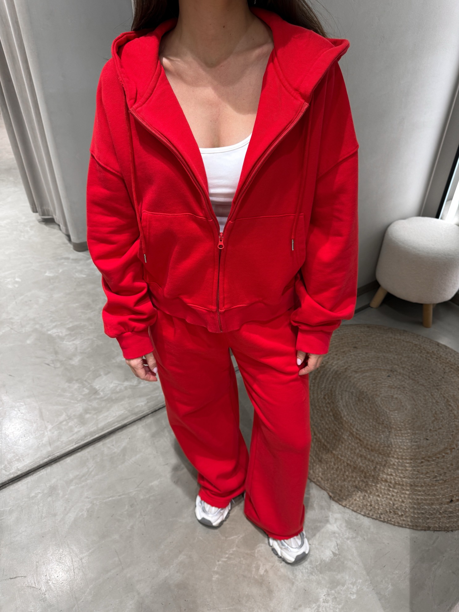 Утепленный комплект из худи на молнии с капюшоном и накладными карманами и широких брюк на резинке. Трикотажный материал средней плотности.