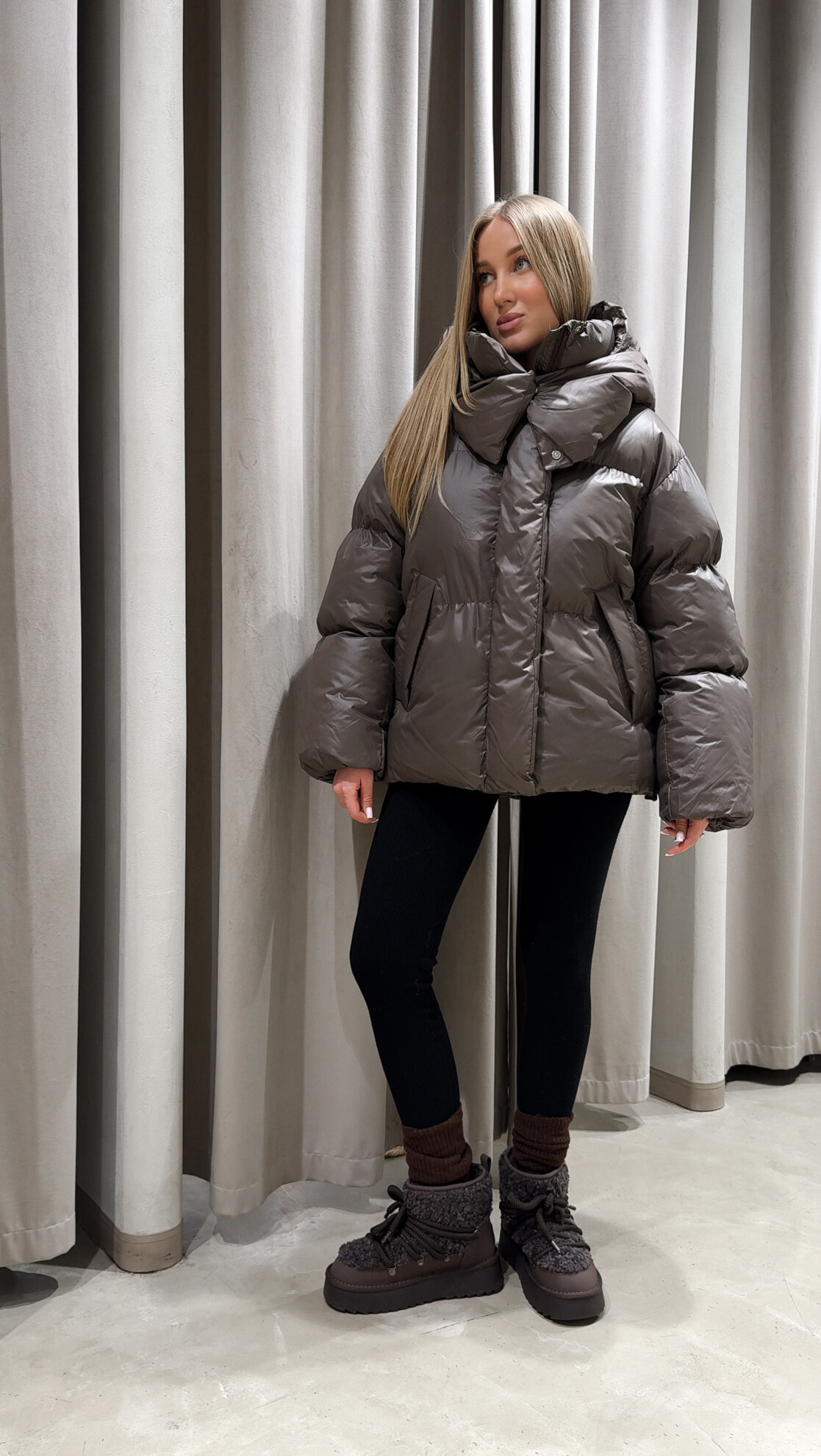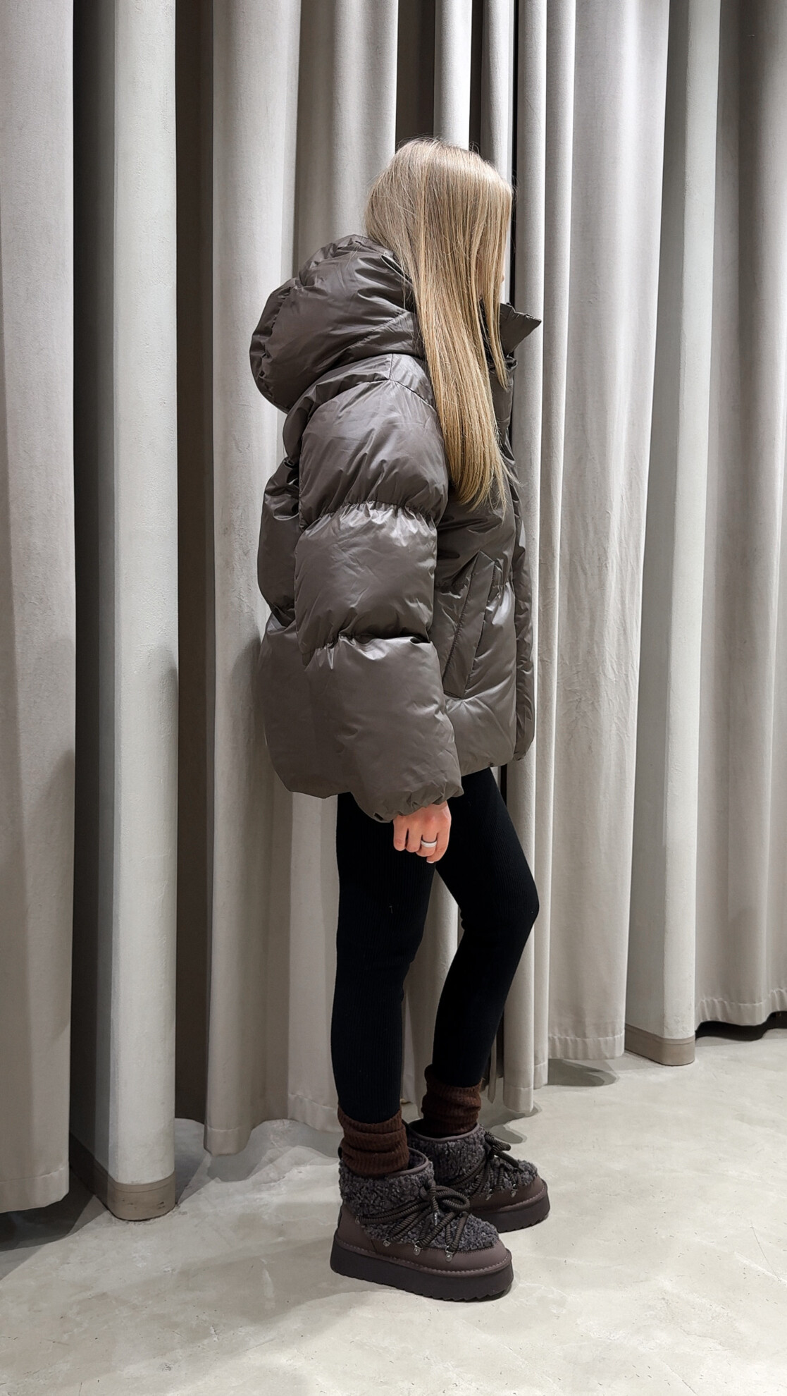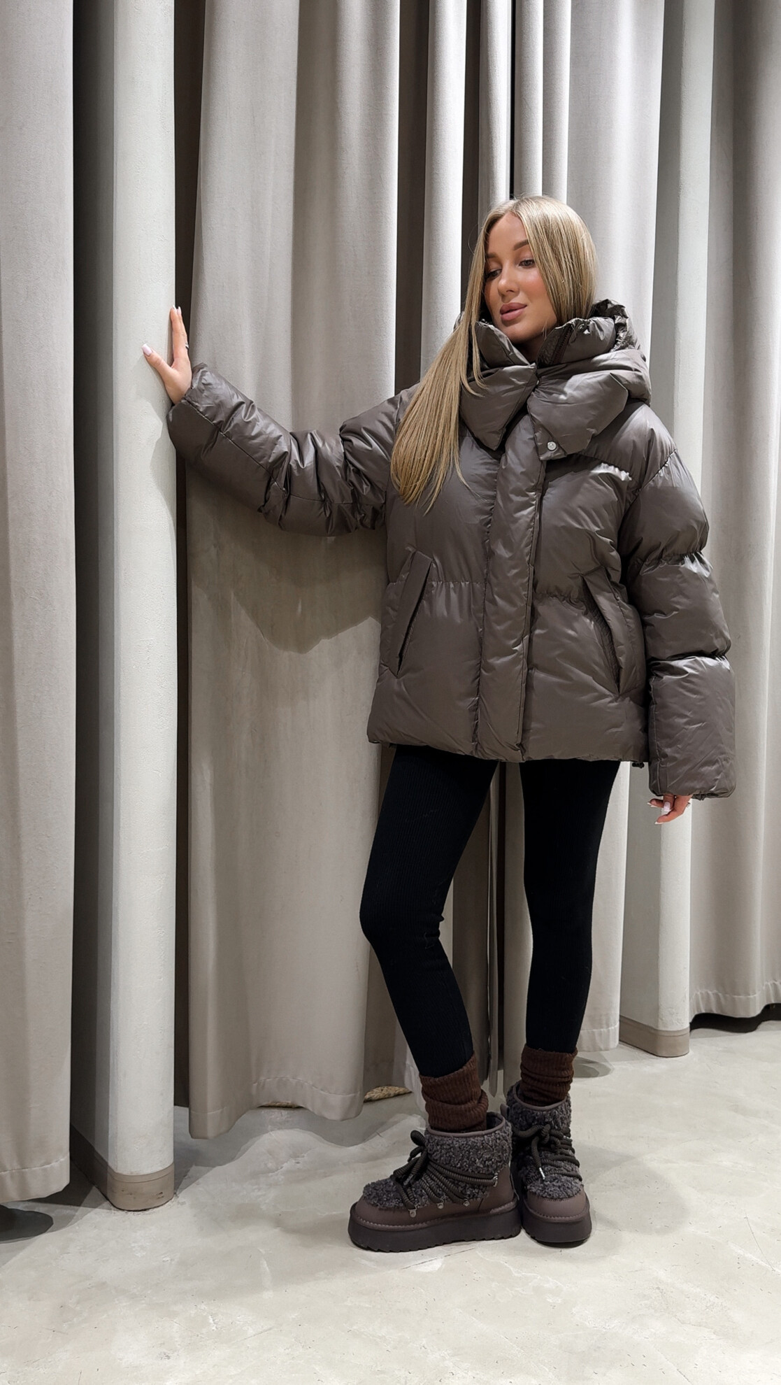 Укороченная стеганая куртка прямого силуэта с объемным воротником-стойкой и капюшоном. Застежка на молнию с планкой на кнопках спереди. Наклонные прорезные карманы по бокам. Длинные рукава с мягкой линией плеча. Утеплитель и подкладка по всей длине изделия.