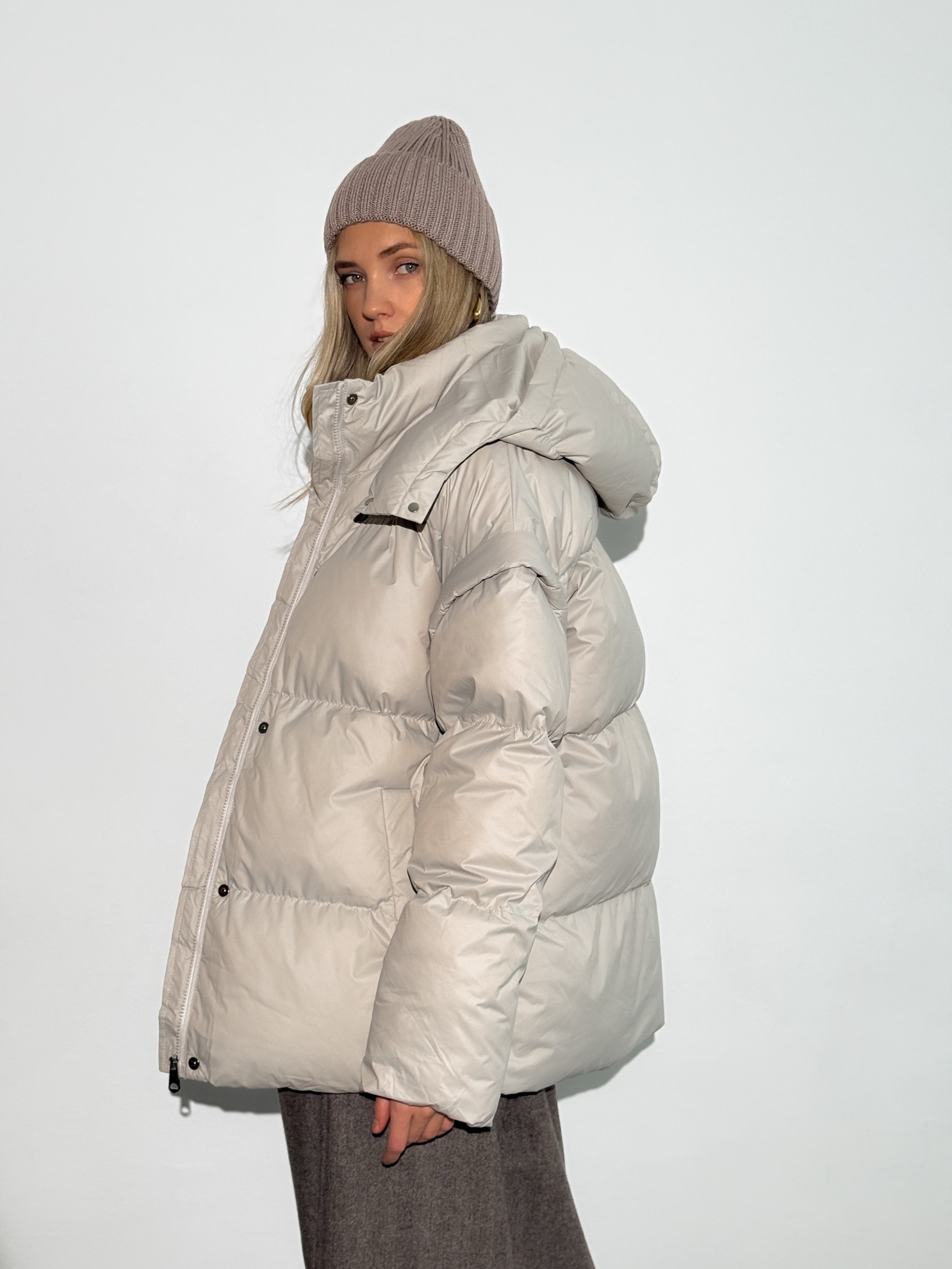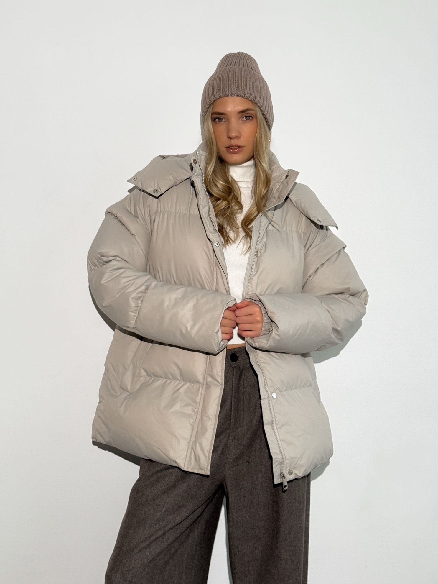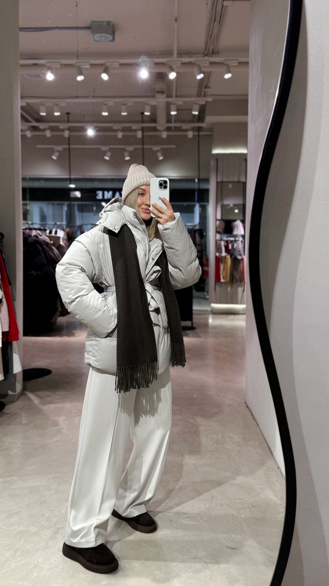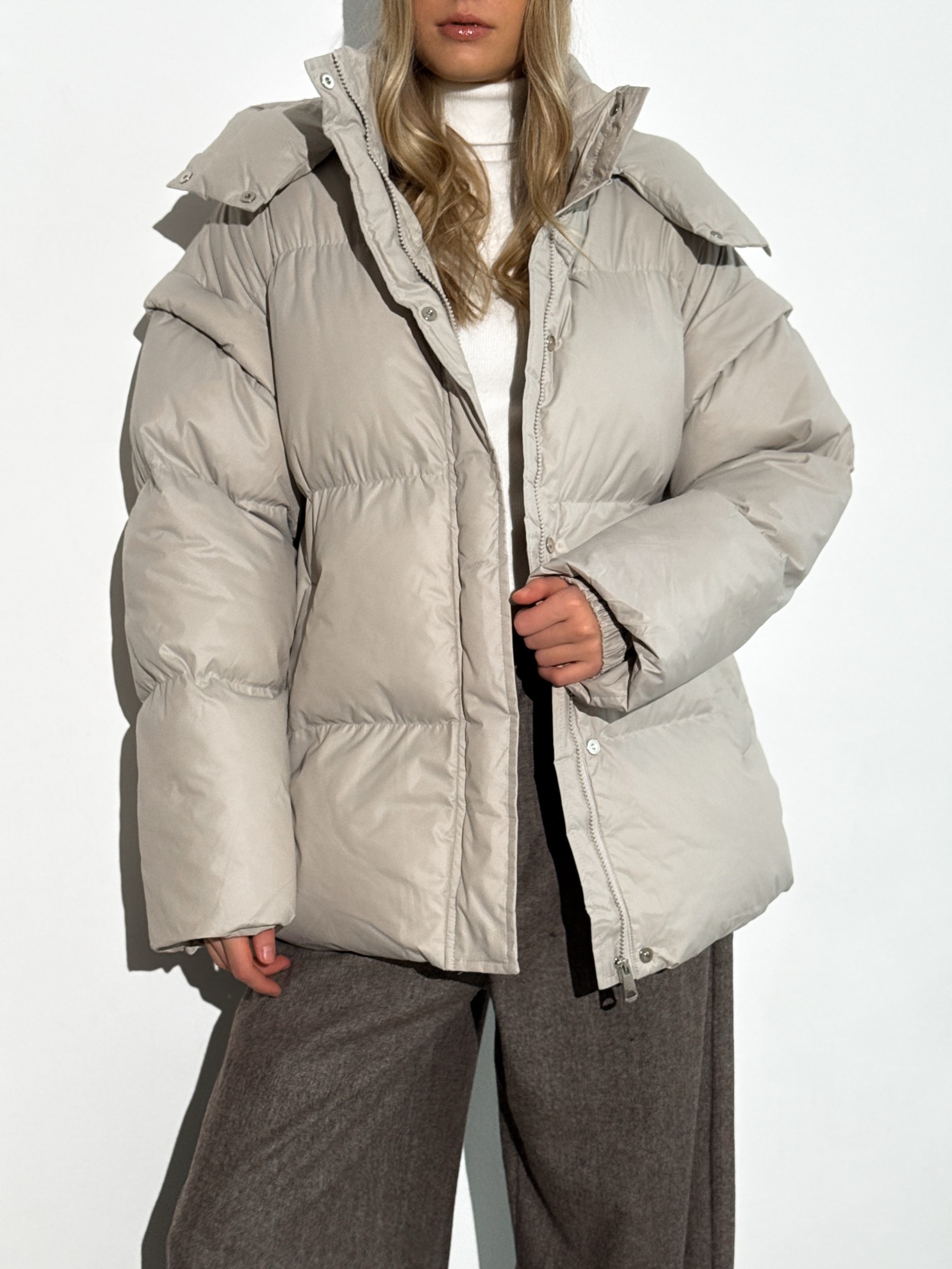 Утепленная стеганая куртка прямого кроя с капюшоном и съемным поясом на талии. Застежка на молнию с ветрозащитной планкой на кнопках и боковые прорезные карманы.