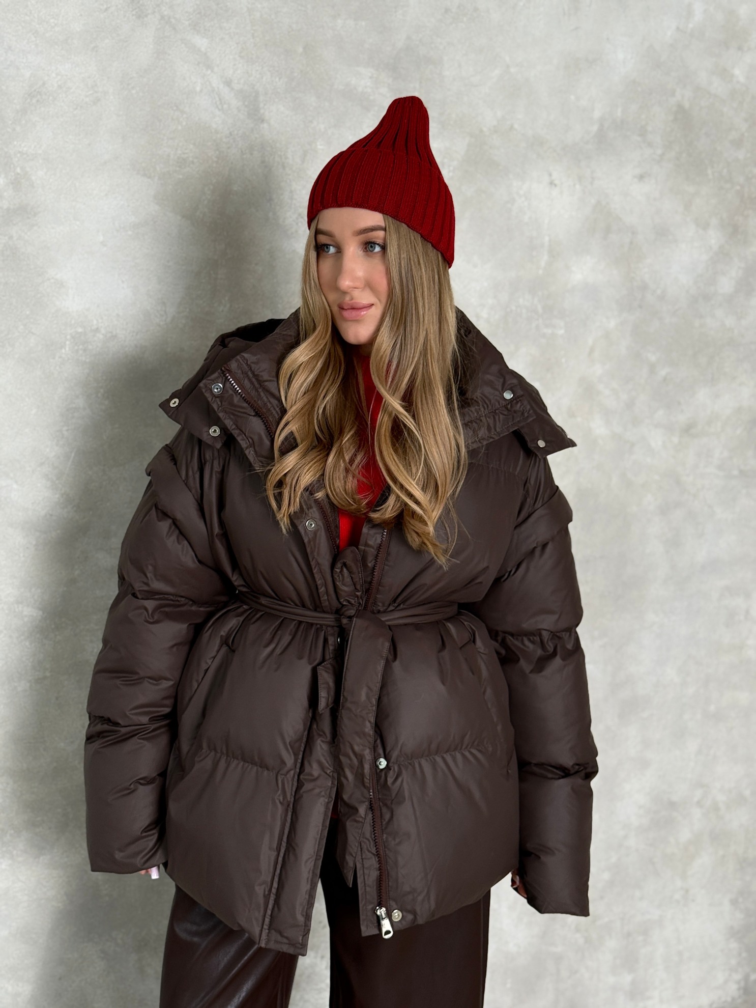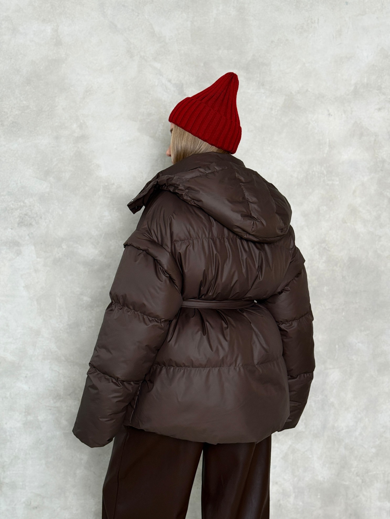 Стеганая утепленная куртка прямого силуэта средней длины с объемным капюшоном. Центральная застежка на молнию и кнопки. Пояс из основного материала для регулировки посадки по талии. Боковые карманы в швах.