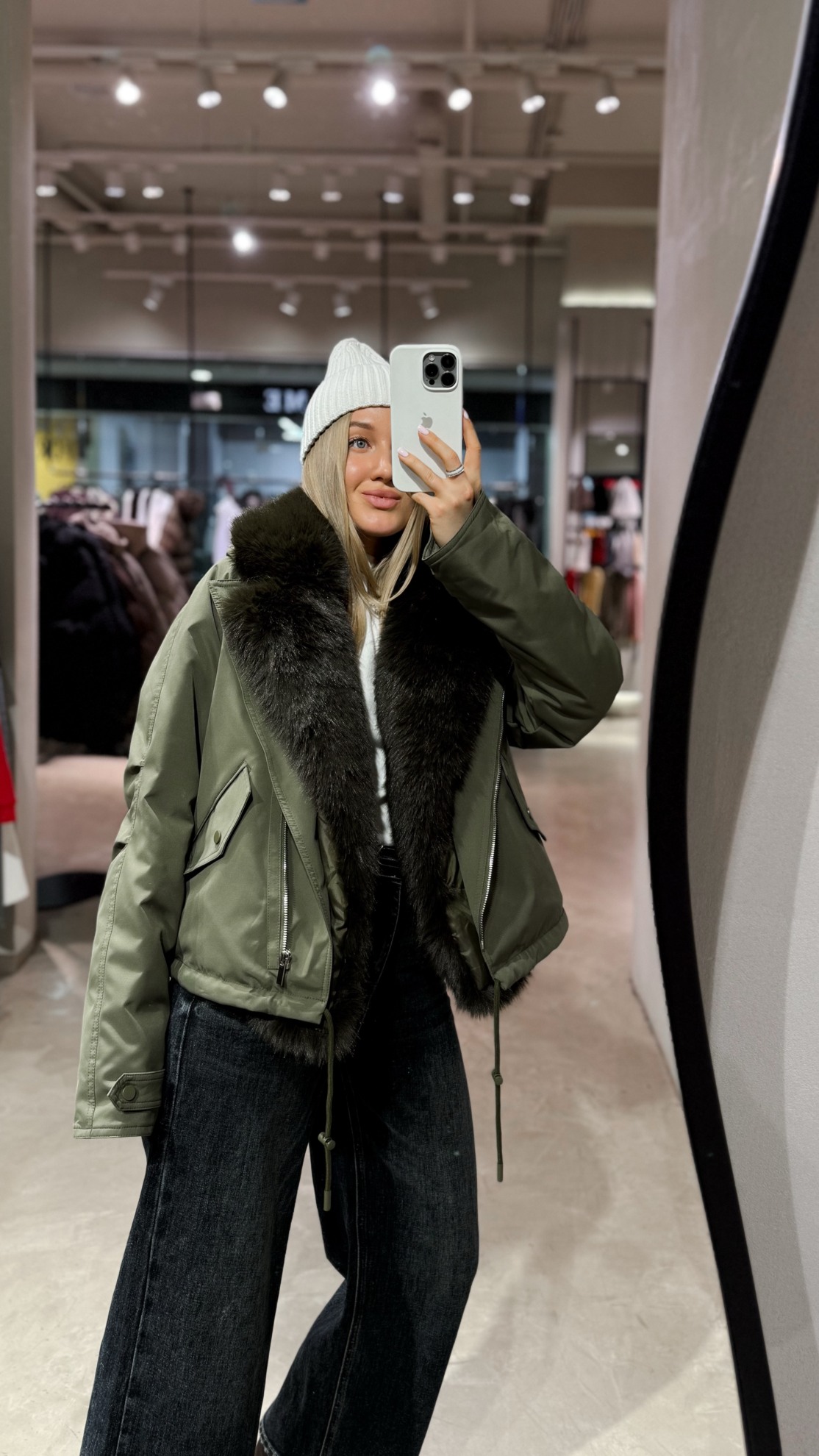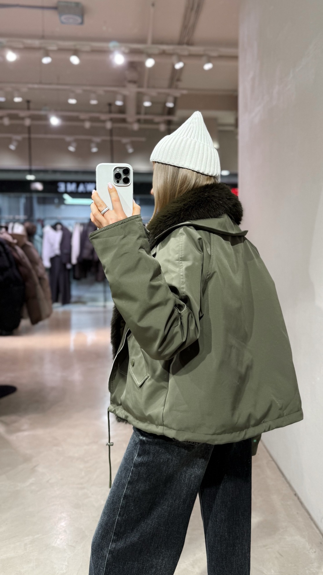 Укороченная парка свободного кроя с объемным воротником из меха. Прорезные и накладные карманы с клапанами и молниями спереди. Застежка на молнию и кнопки. Низ изделия с регулируемой кулиской.