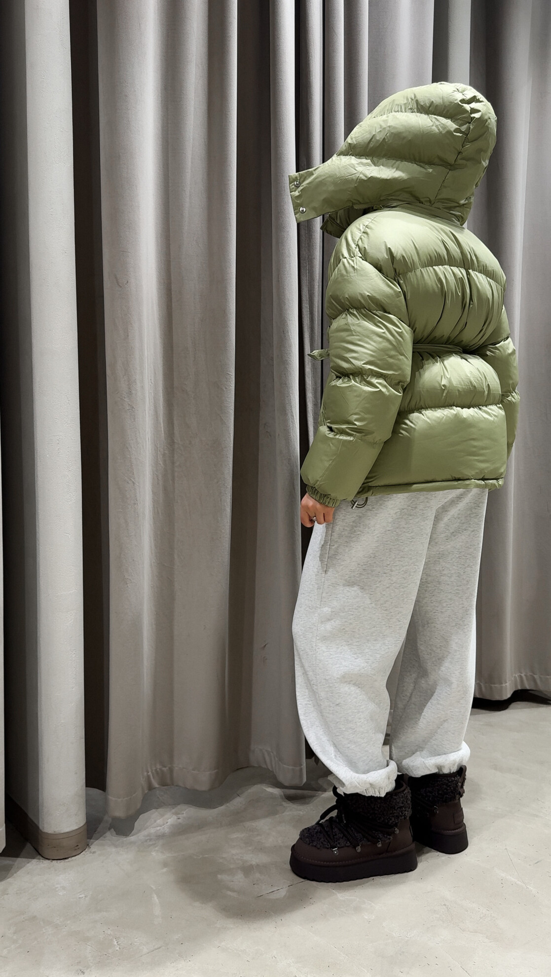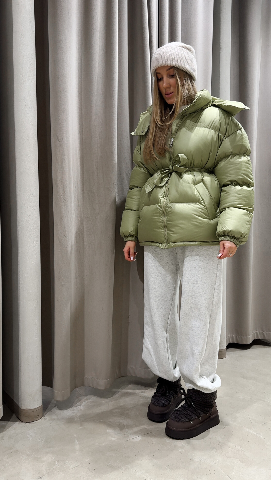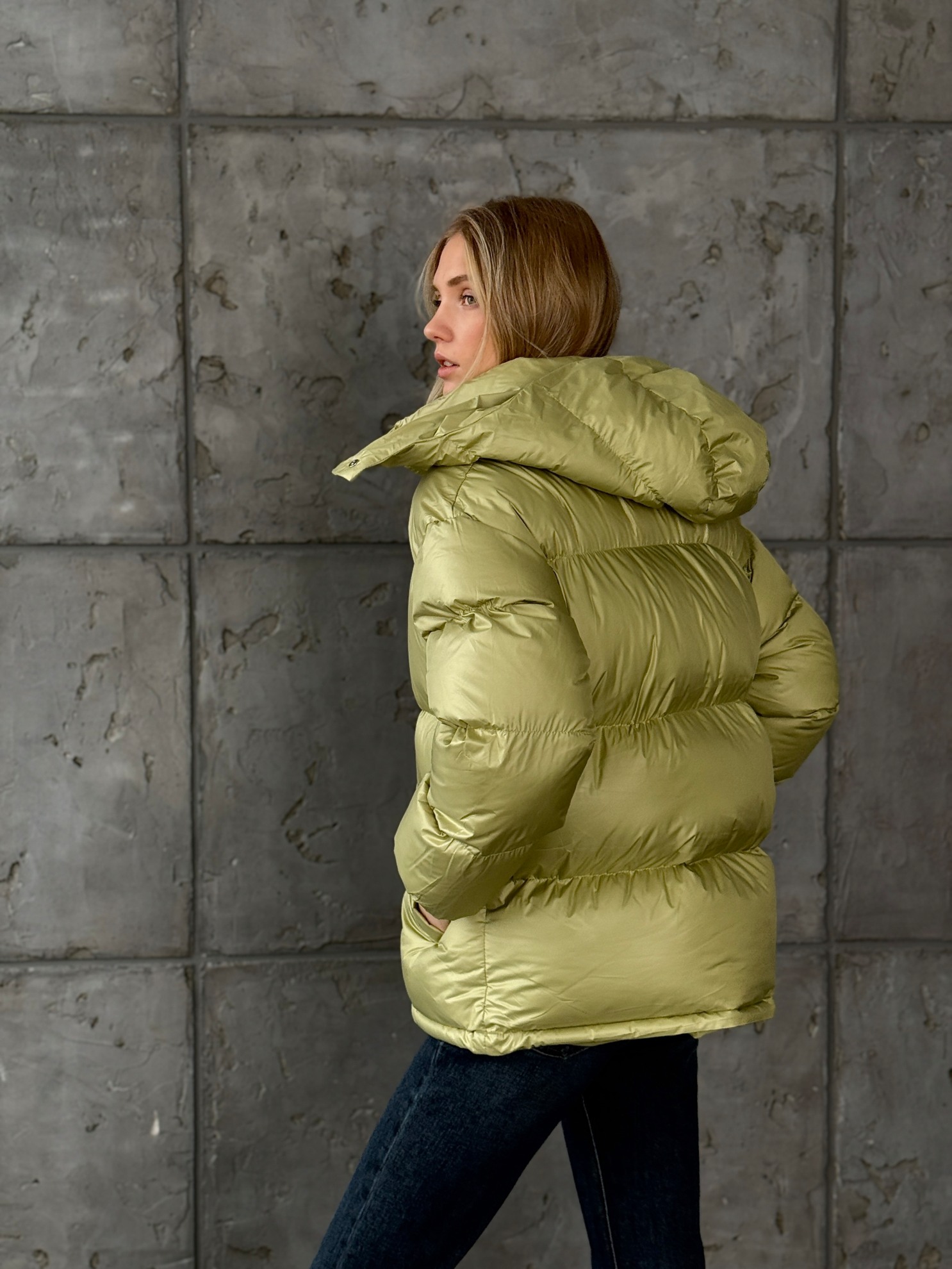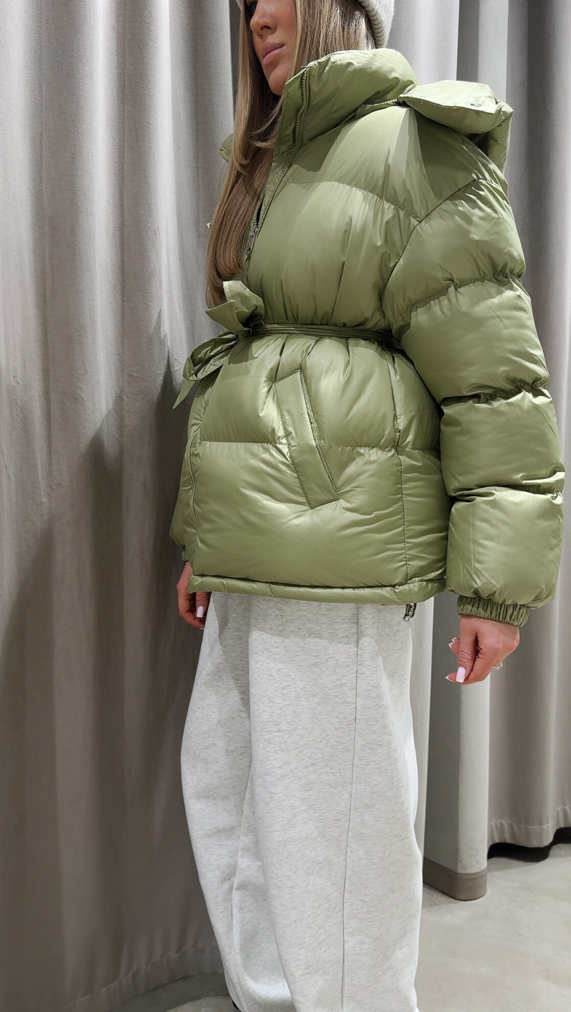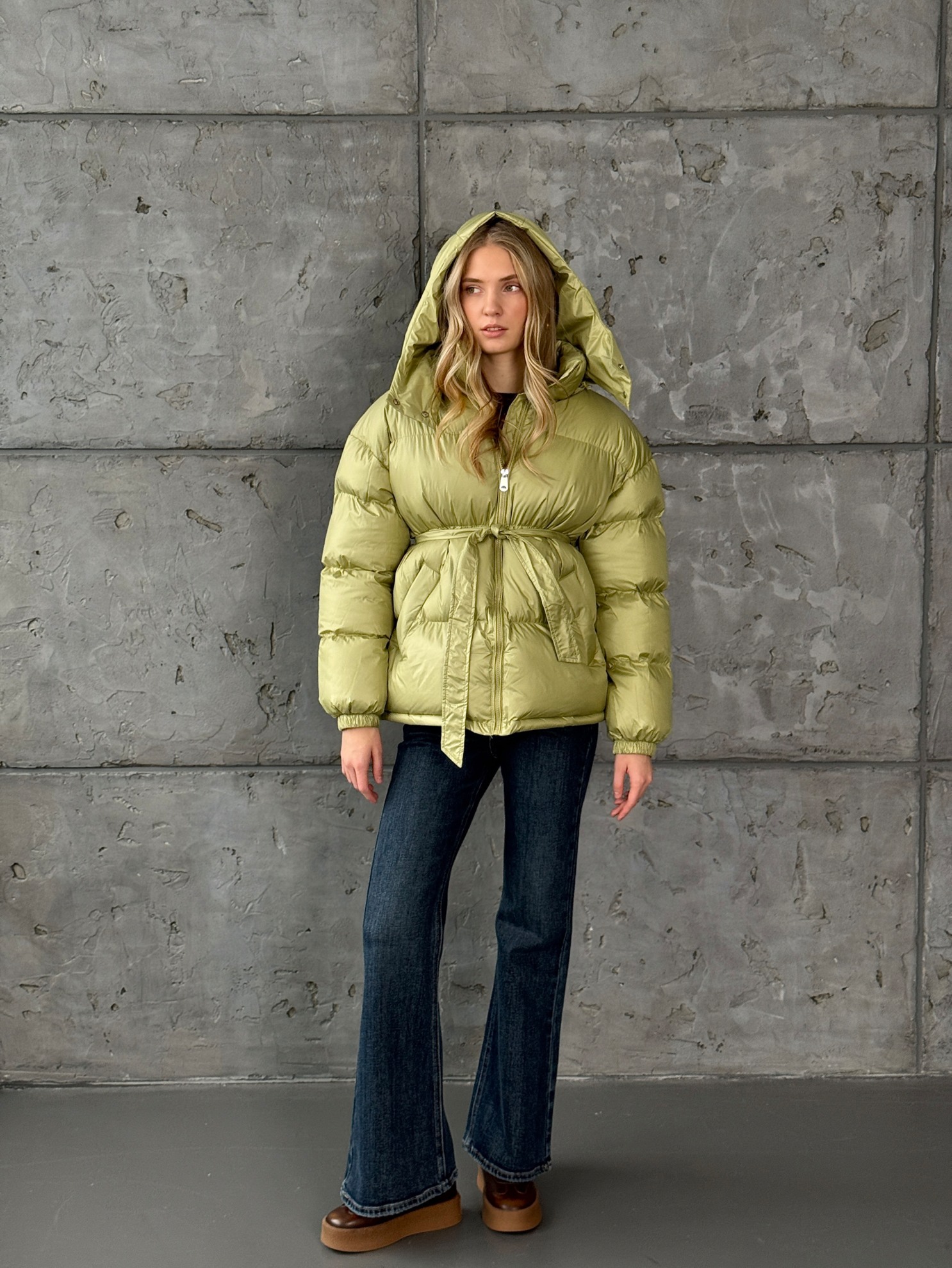 Утепленная стеганая куртка длины до бедра с объемным капюшоном на высокой стойке. Центральная застежка на молнию, пояс на талии для регулировки объема. Эластичные манжеты по низу рукавов, боковые прорезные карманы с листочкой, кулиска по низу изделия.