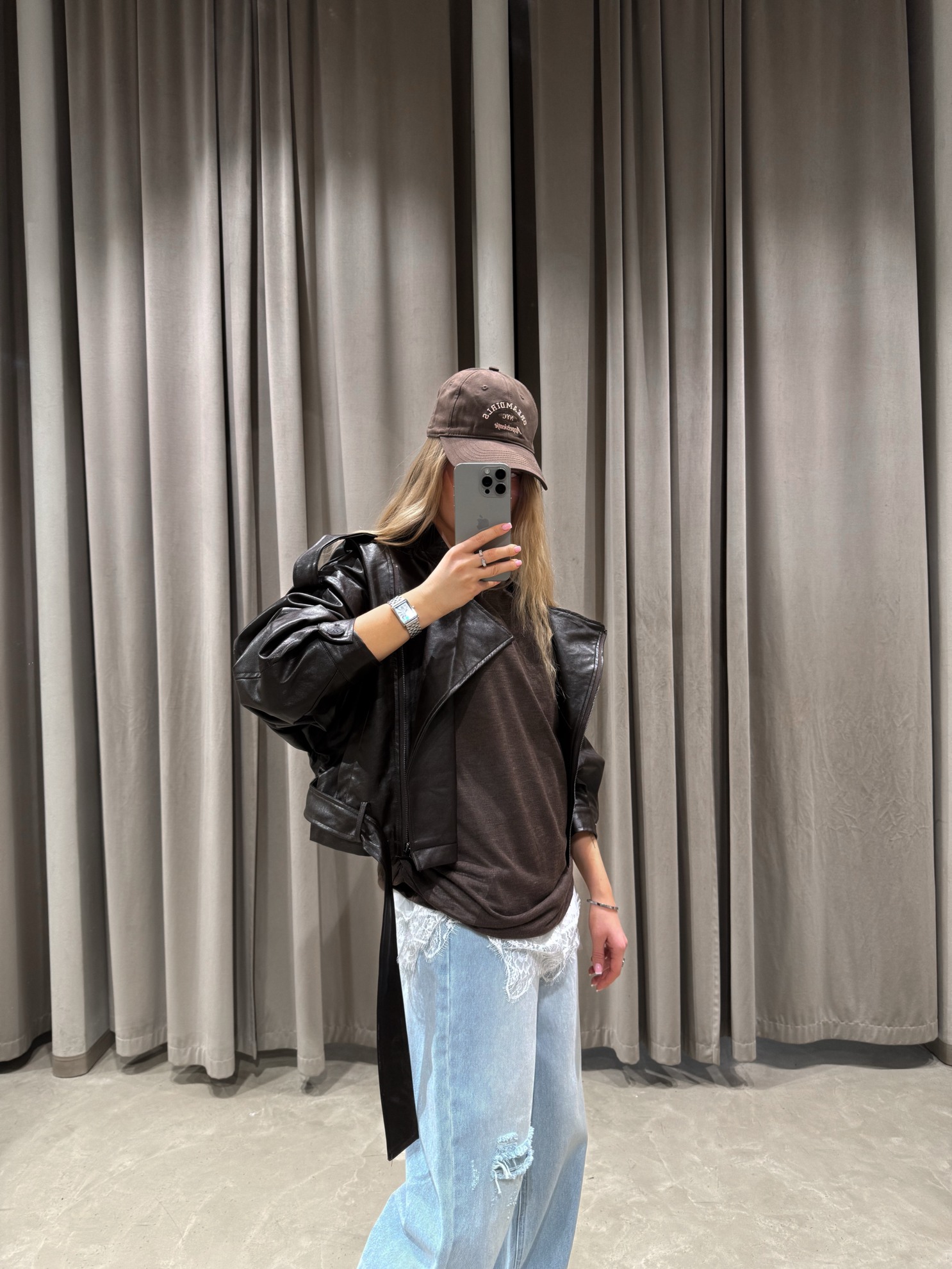 Кожаная куртка свободного кроя с объемными рукавами и поясом по низу. Отложной воротник и застежка на молнию спереди.