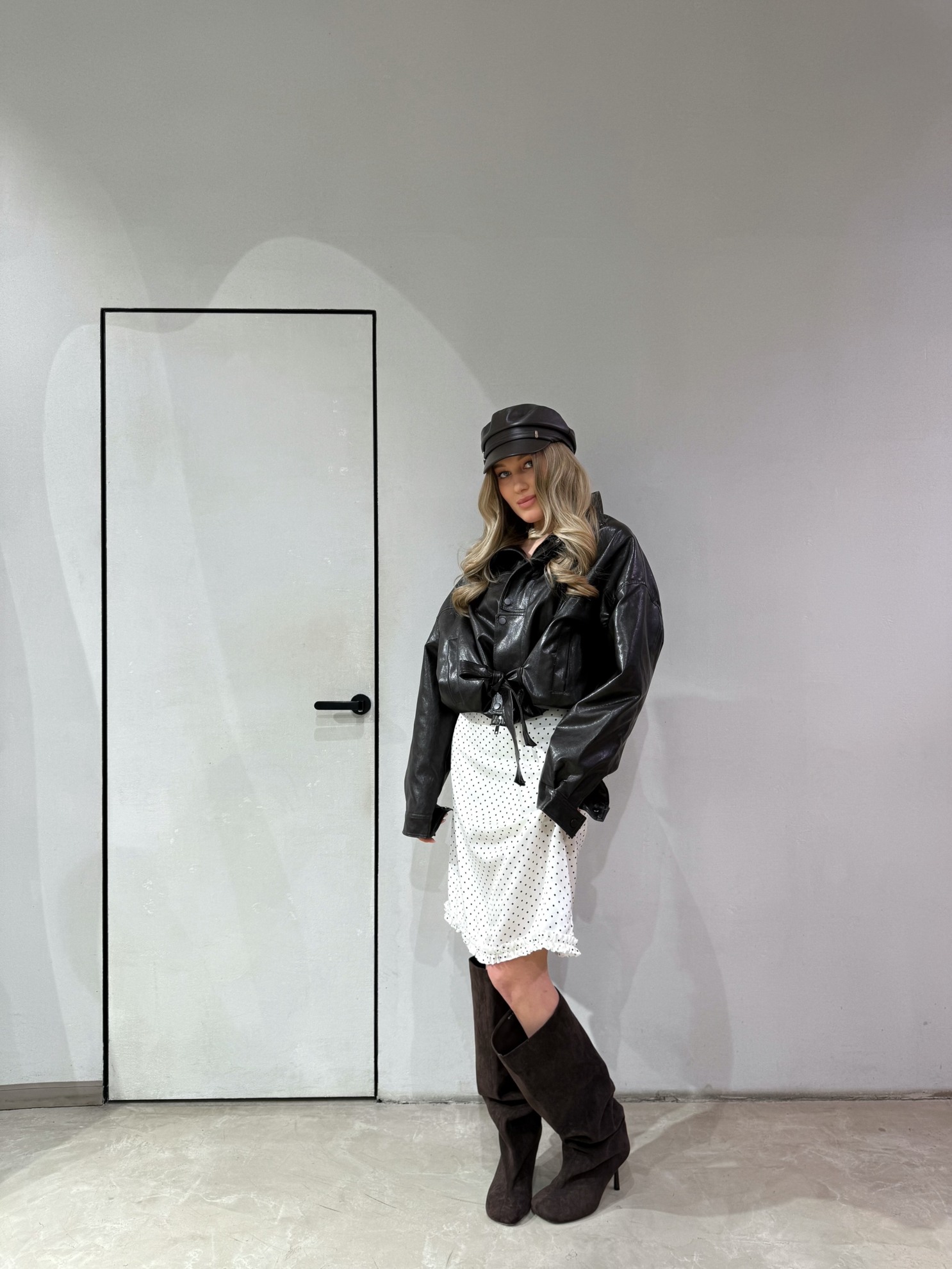 Прямая кожаная куртка оверсайз с поясом и заниженной линией плеча. Застежка на асимметричную молнию и кнопку у воротника-стойки, длинные рукава с манжетами на пуговицах из плотного гладкого материала.