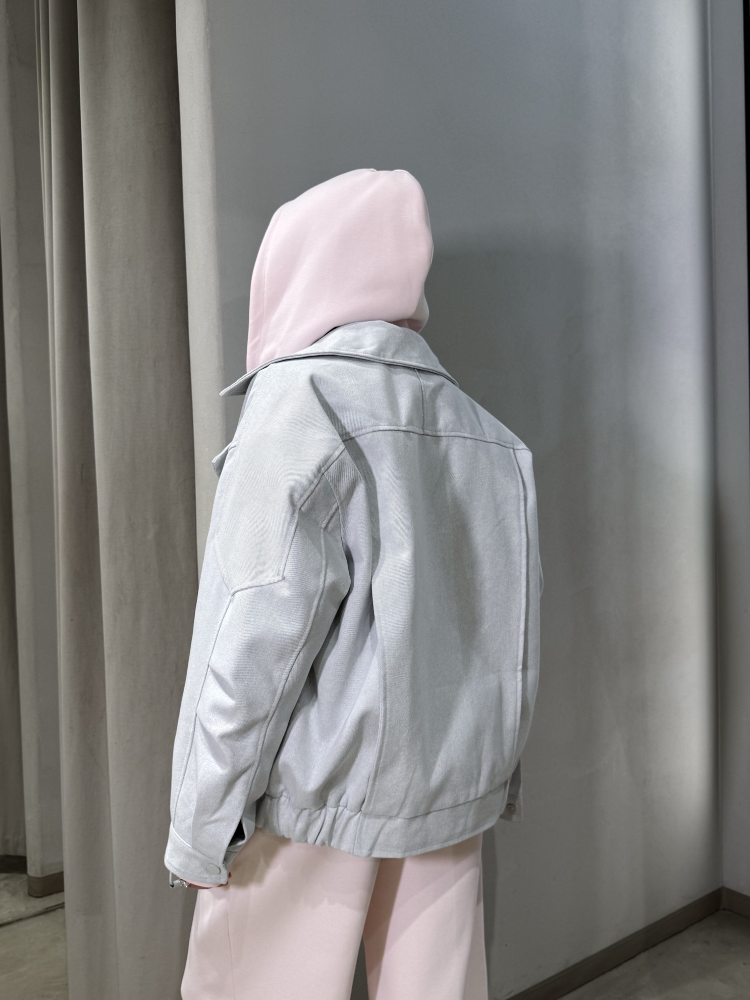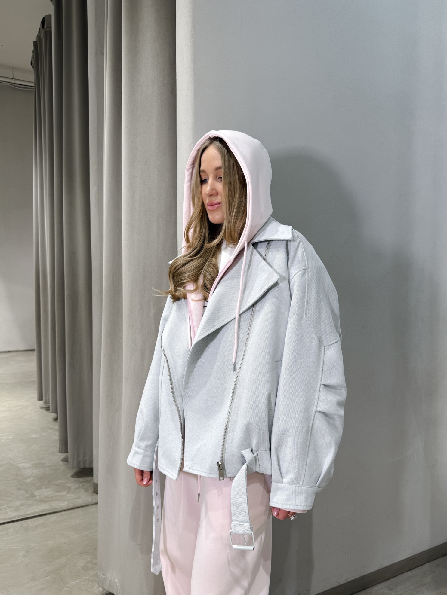 Объемный бомбер прямого кроя со спущенной линией плеча. Диагональная застежка на молнию спереди и пояс с регулировкой на металлическую пряжку. Рельефные швы на рукавах. Эластичная вставка по линии низа сзади. Манжеты рукавов на кнопке и молнии.