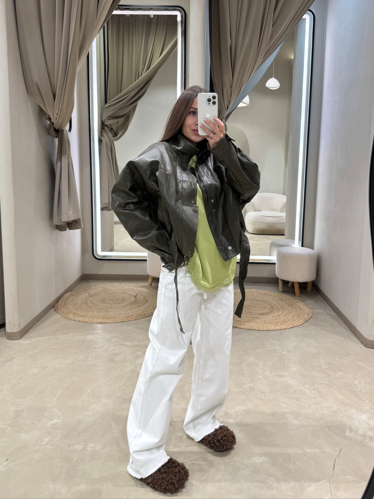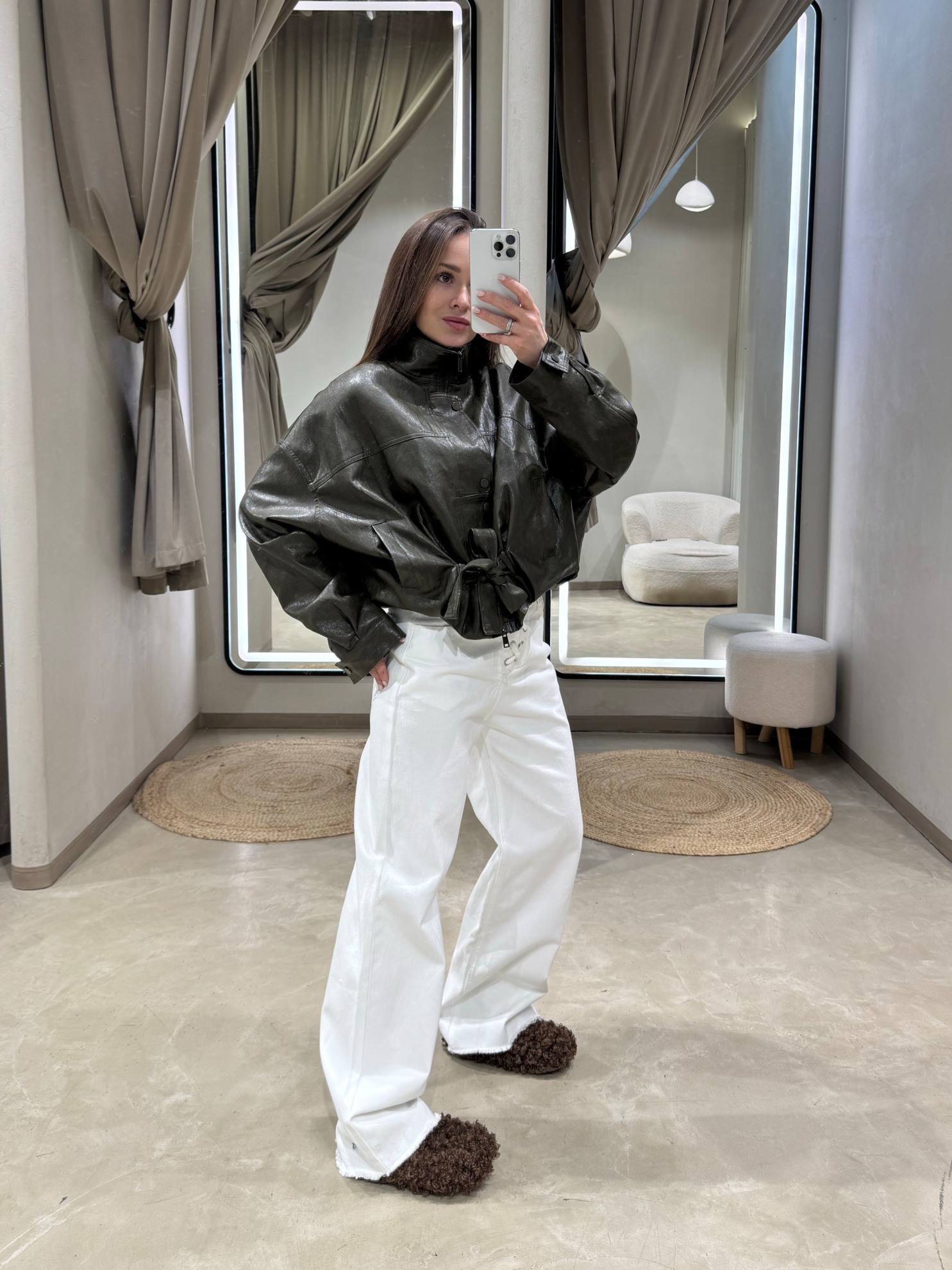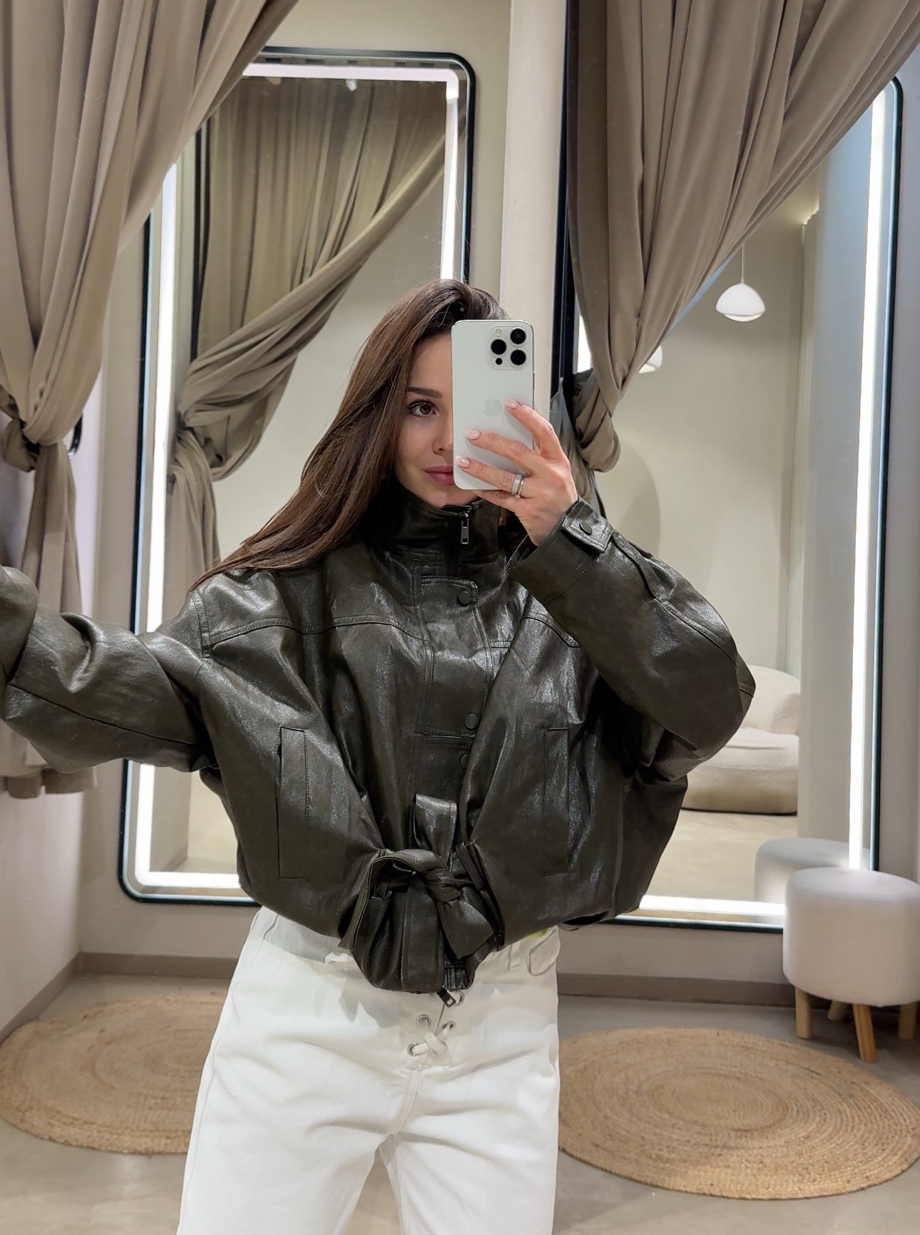 Кожаная куртка прямого кроя длиной до бедра. Отложной воротник. Центральная застежка-молния спереди. Боковые прорезные карманы. Длинные рукава со спущенной линией плеча. Подкладка по всей длине изделия.
