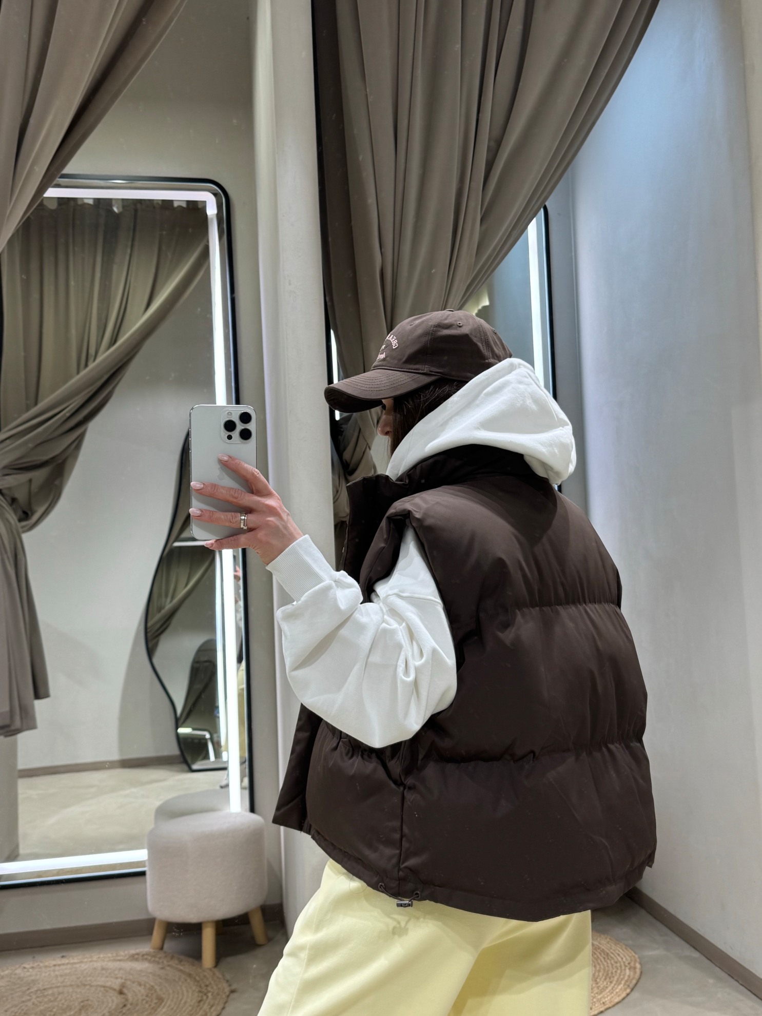Утеплённый стёганый жилет прямого кроя с высоким воротником и центральной застёжкой-молнией, спрятанной под планкой. Прорезные карманы по бокам. Низ на кулиске с регулировкой объёма. Гладкая ткань с синтетическим наполнителем.
