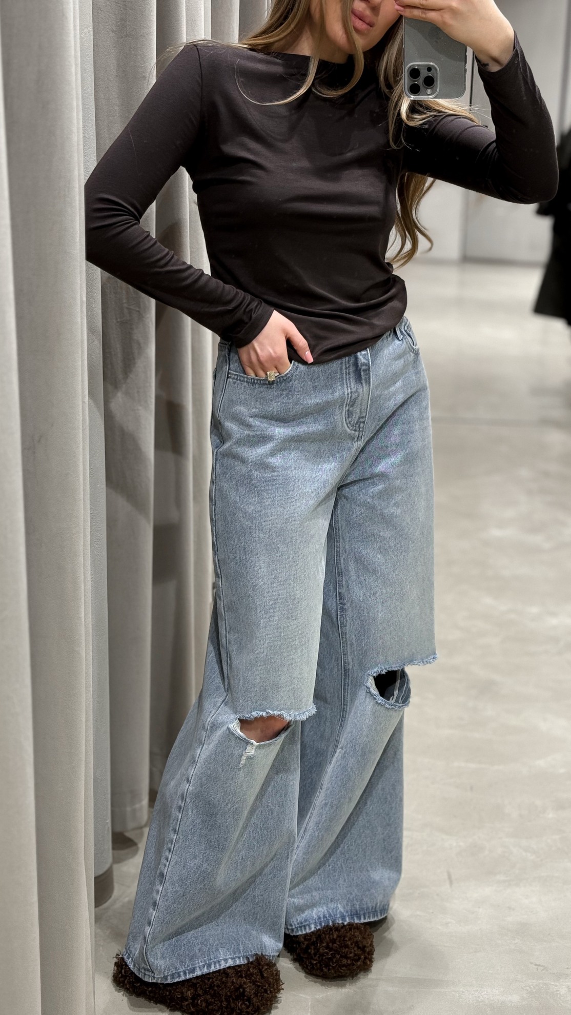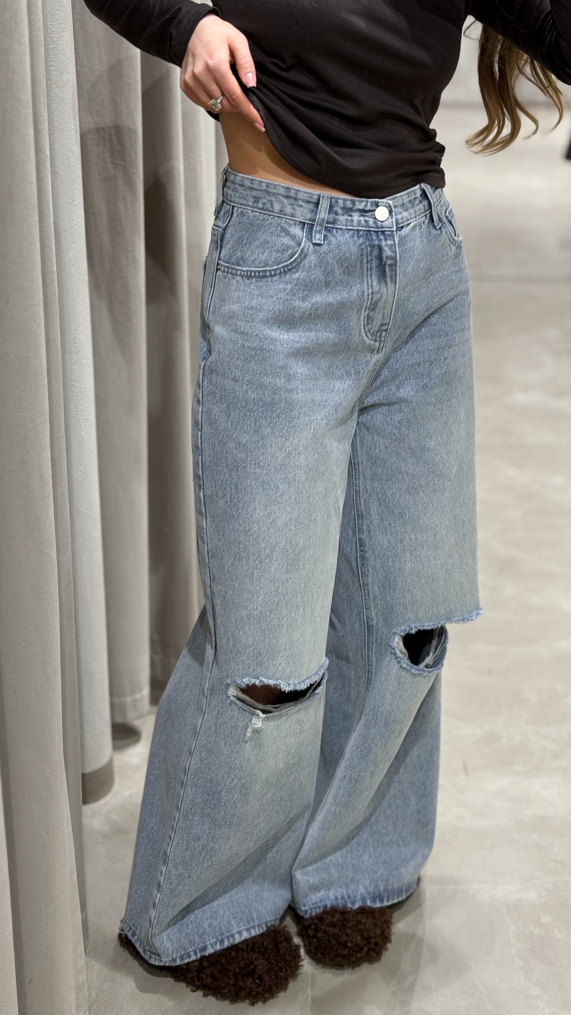Джинсы свободного кроя с очень широкими брючинами и разрезами на коленях с необработанным краем. Средняя посадка на талии. Пять карманов. Застежка на молнию и пуговицу. Хлопковый деним с эффектом выбеливания.