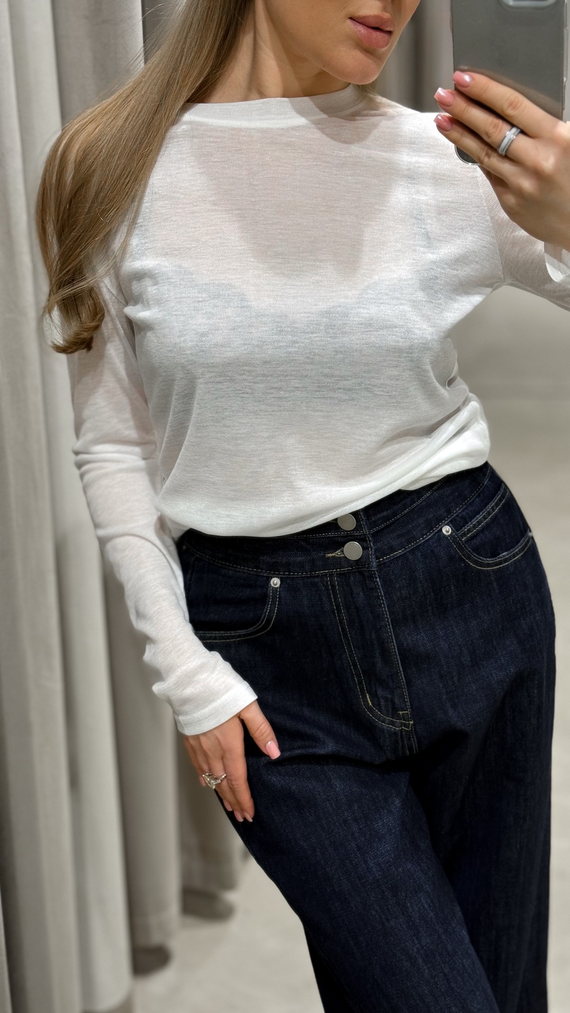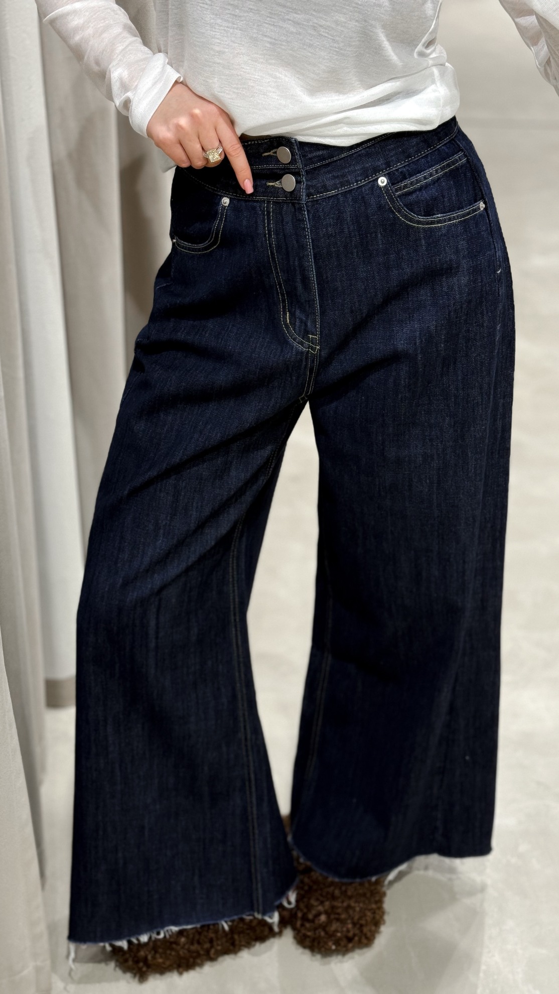 Джинсы с широкими брючными штанинами и высоким поясом. Двойная застежка на металлические пуговицы и молнию. Пять карманов, контрастная отстрочка швов. Низ штанин с необработанным краем.
