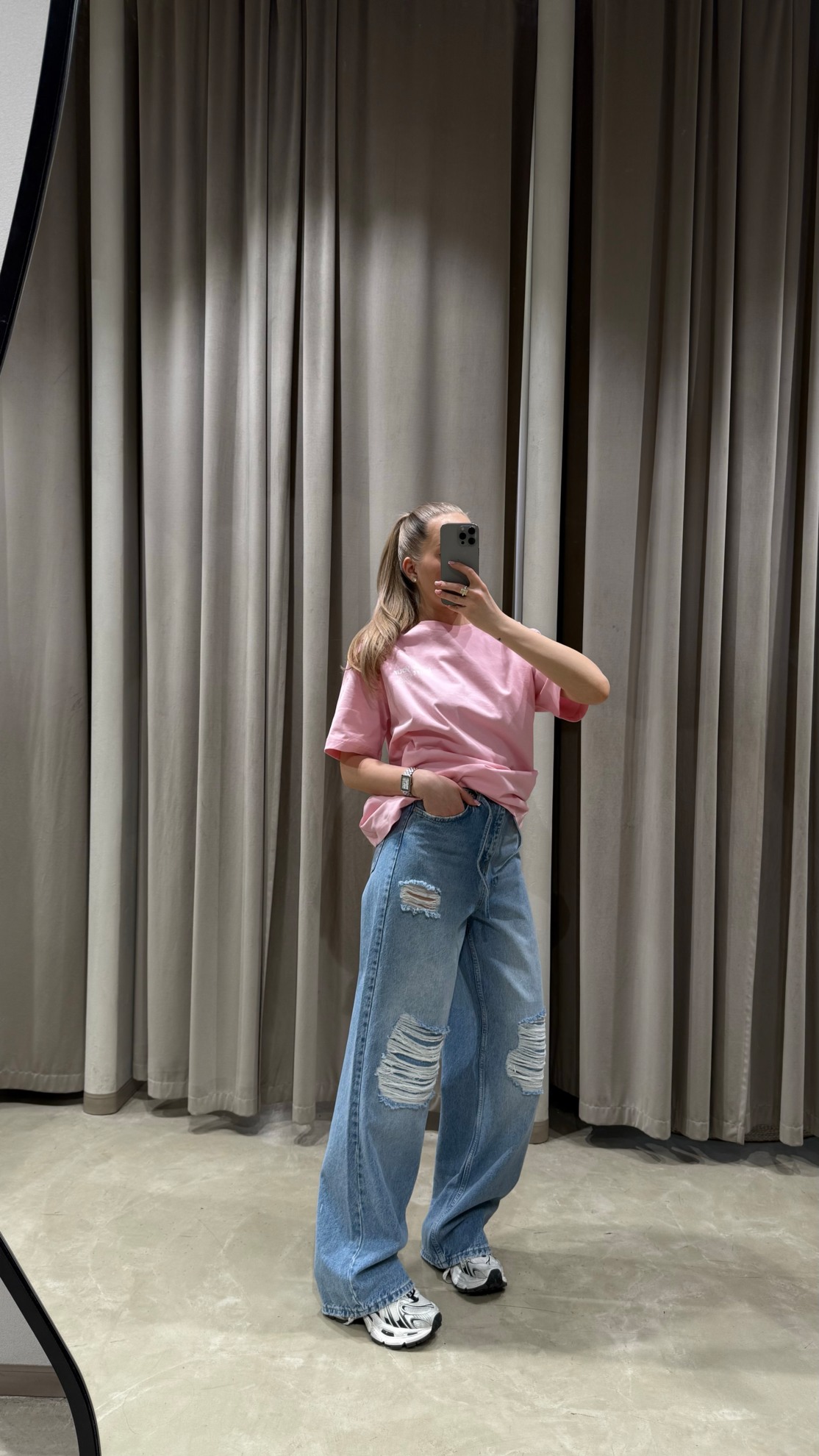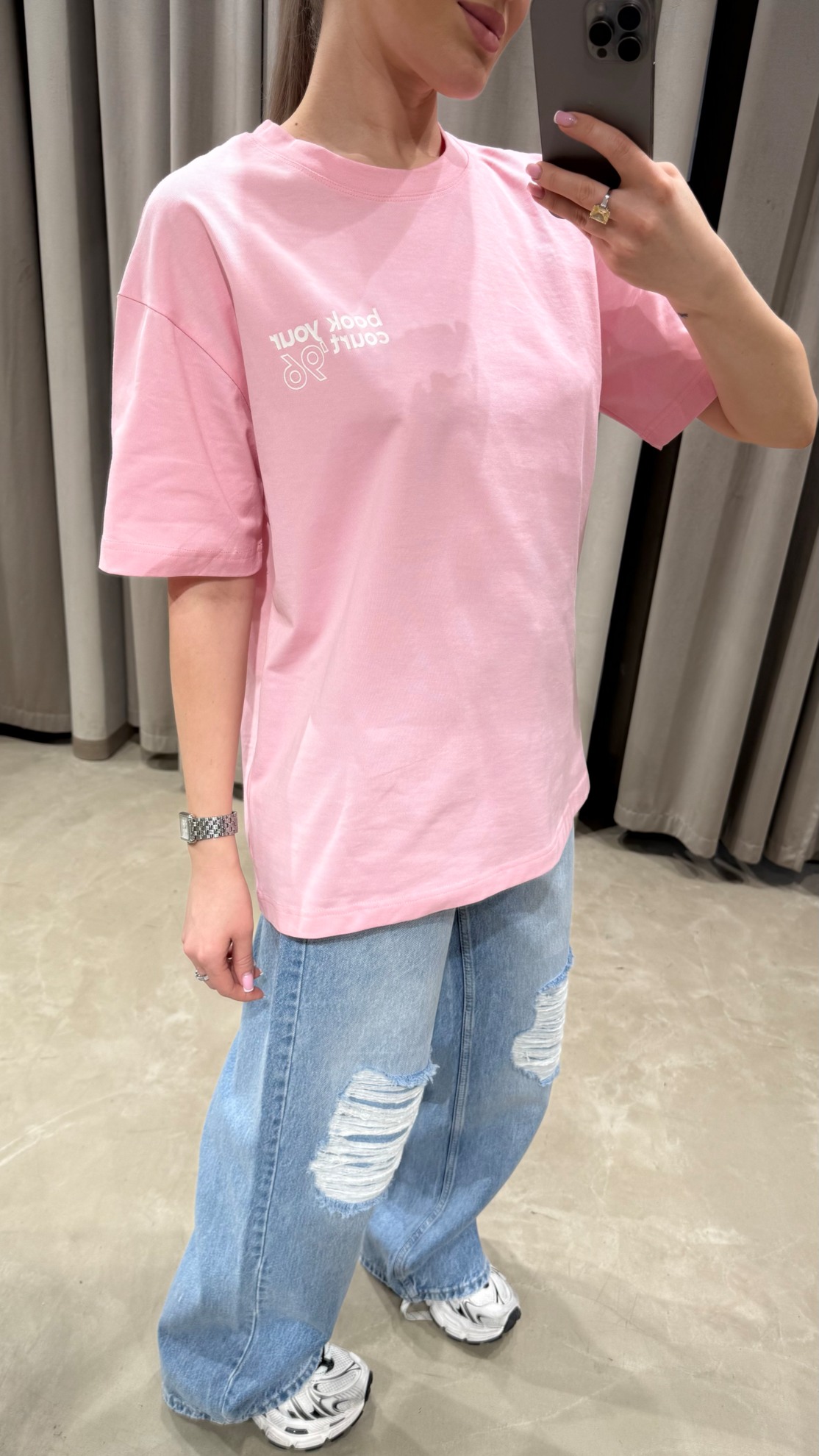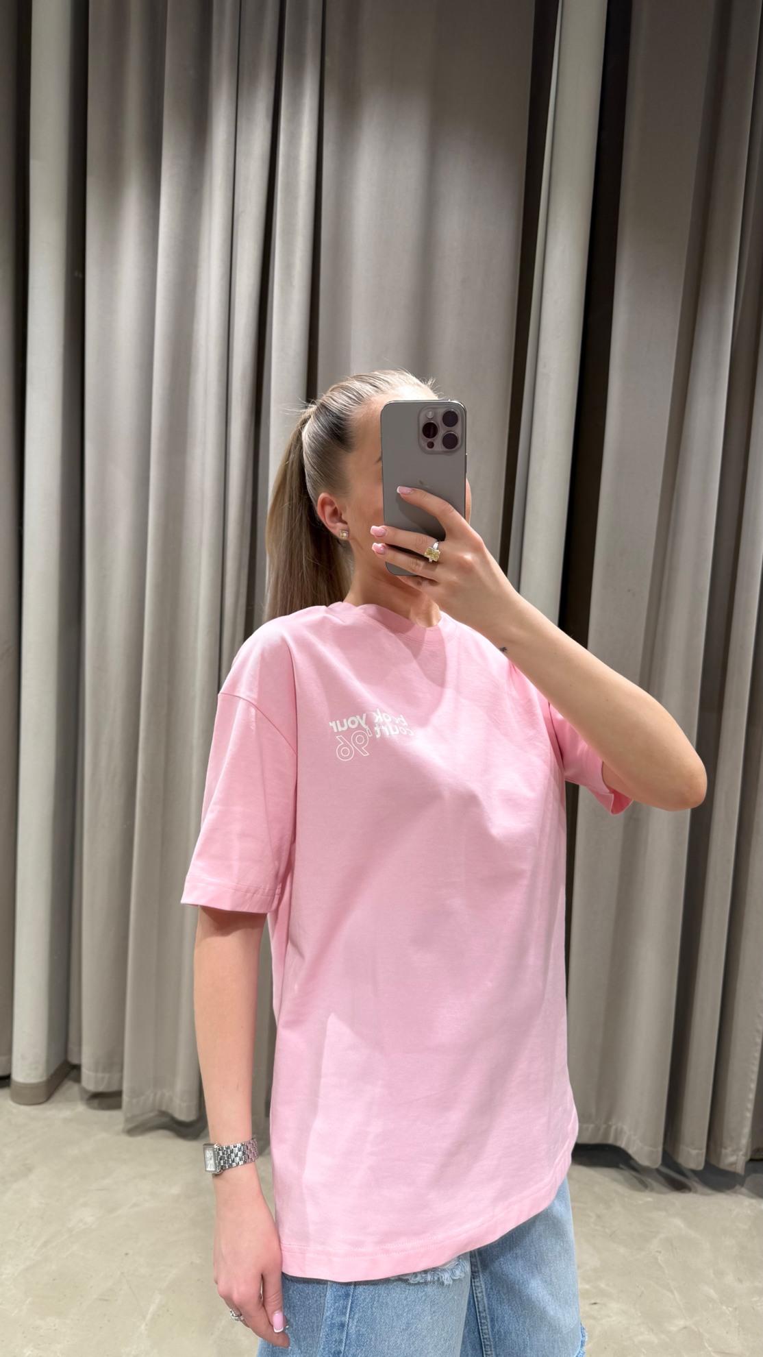 Футболка прямого свободного кроя с короткими рукавами и круглым вырезом горловины. Однотонный трикотаж из хлопка. Небольшой контрастный принт на груди.
