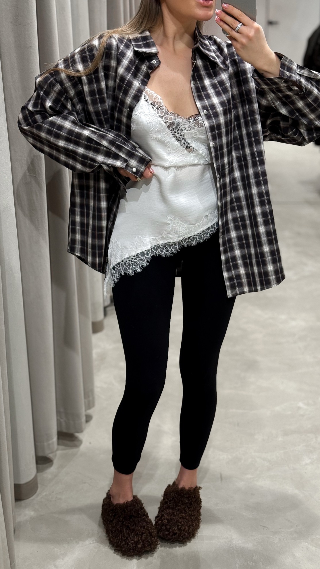 Топ на тонких бретелях свободного силуэта с асимметричным низом и широкими кружевными вставками по вырезу и подолу. Гладкая ткань с сатиновым блеском и отделкой из прозрачного кружева.
