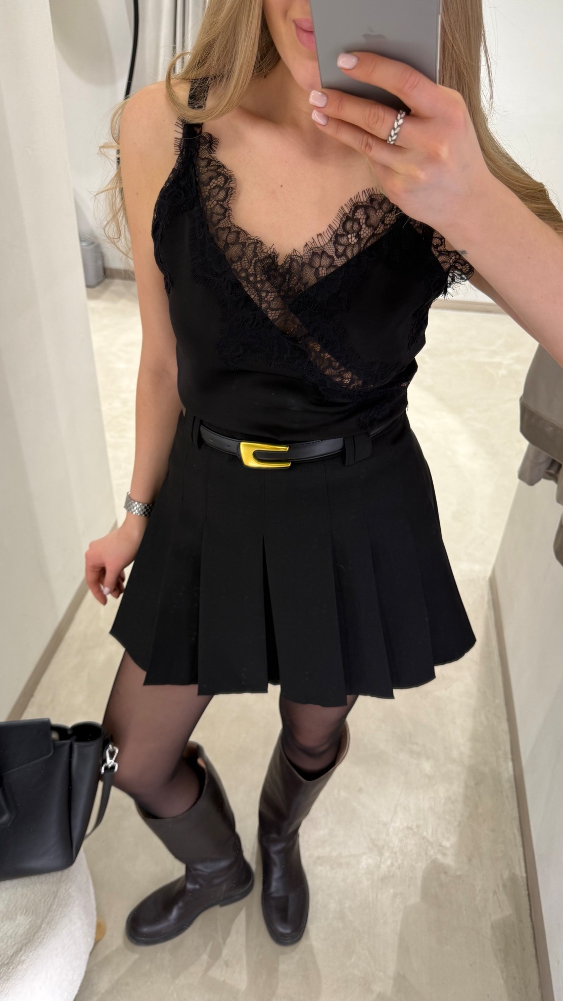 Черный топ на тонких бретелях с V-образным вырезом и перекрестной линией лифа. Кружевная отделка по вырезу и линии декольте. Прямой силуэт без рукавов, длина до уровня бедер.