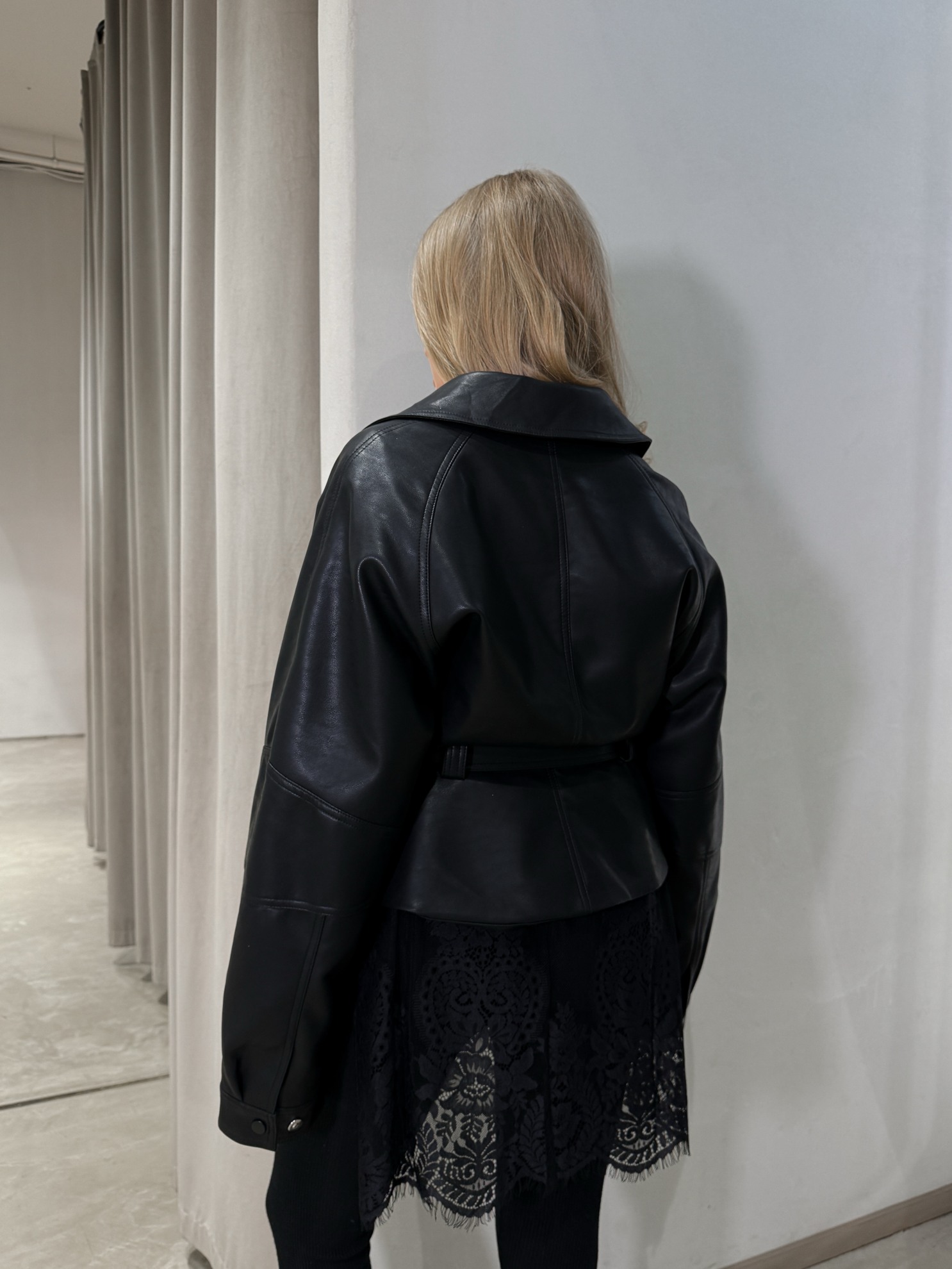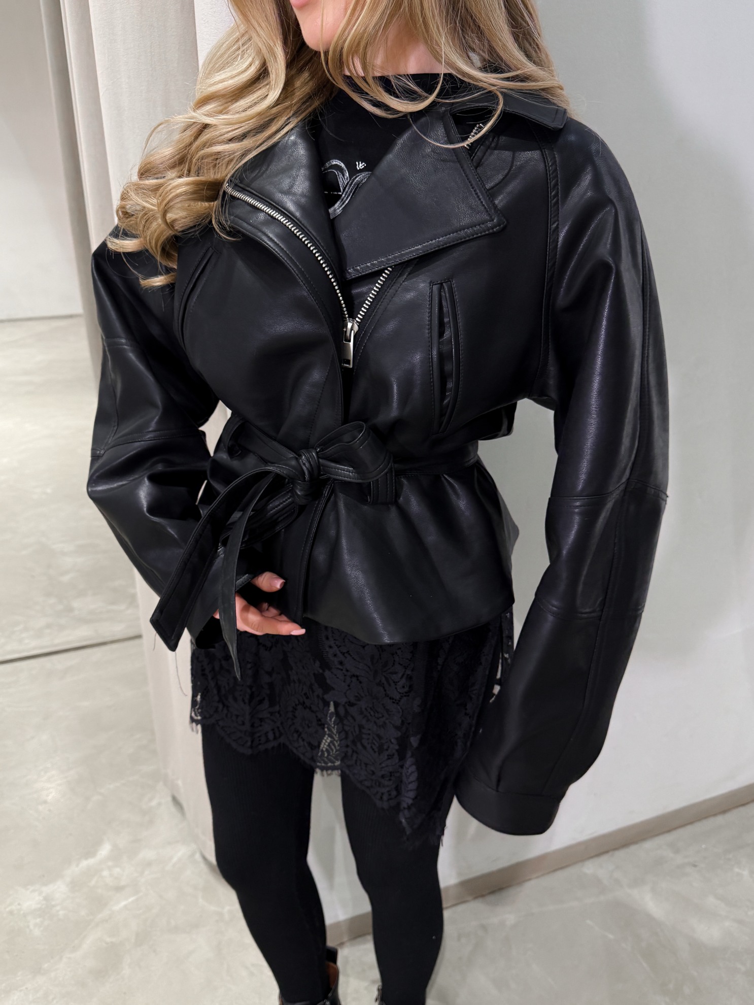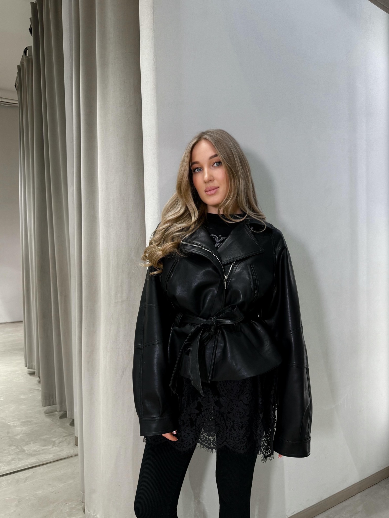 Куртка из гладкой кожи полуприлегающего кроя с акцентом на линии талии. Застежка на молнию спереди и пояс на завязку. Классический отложной воротник и длинные рукава.