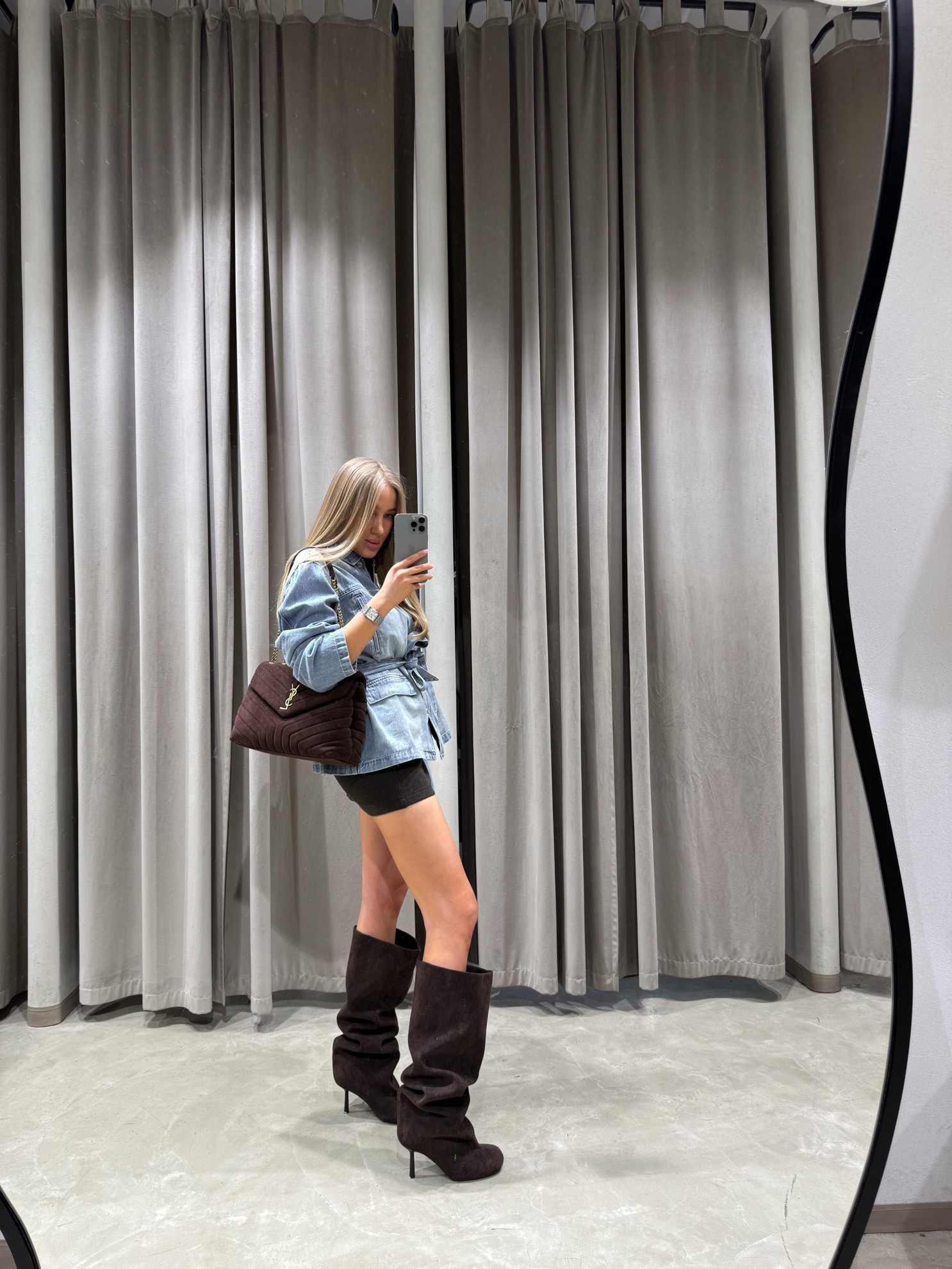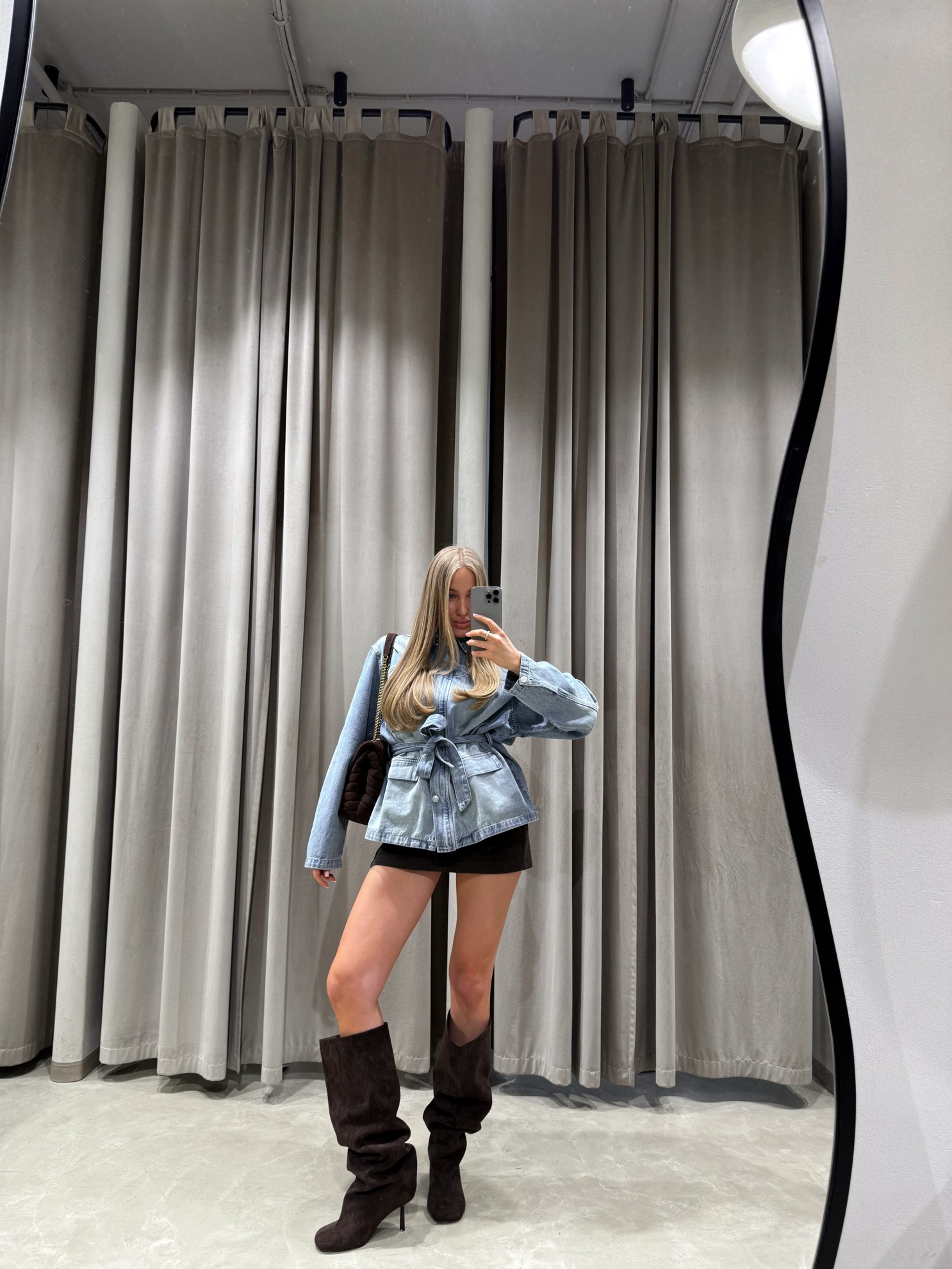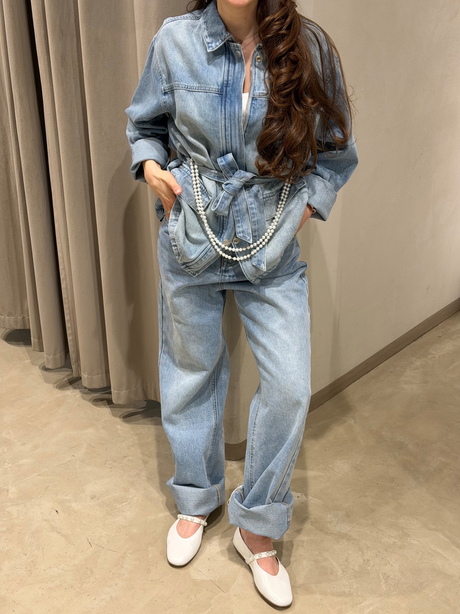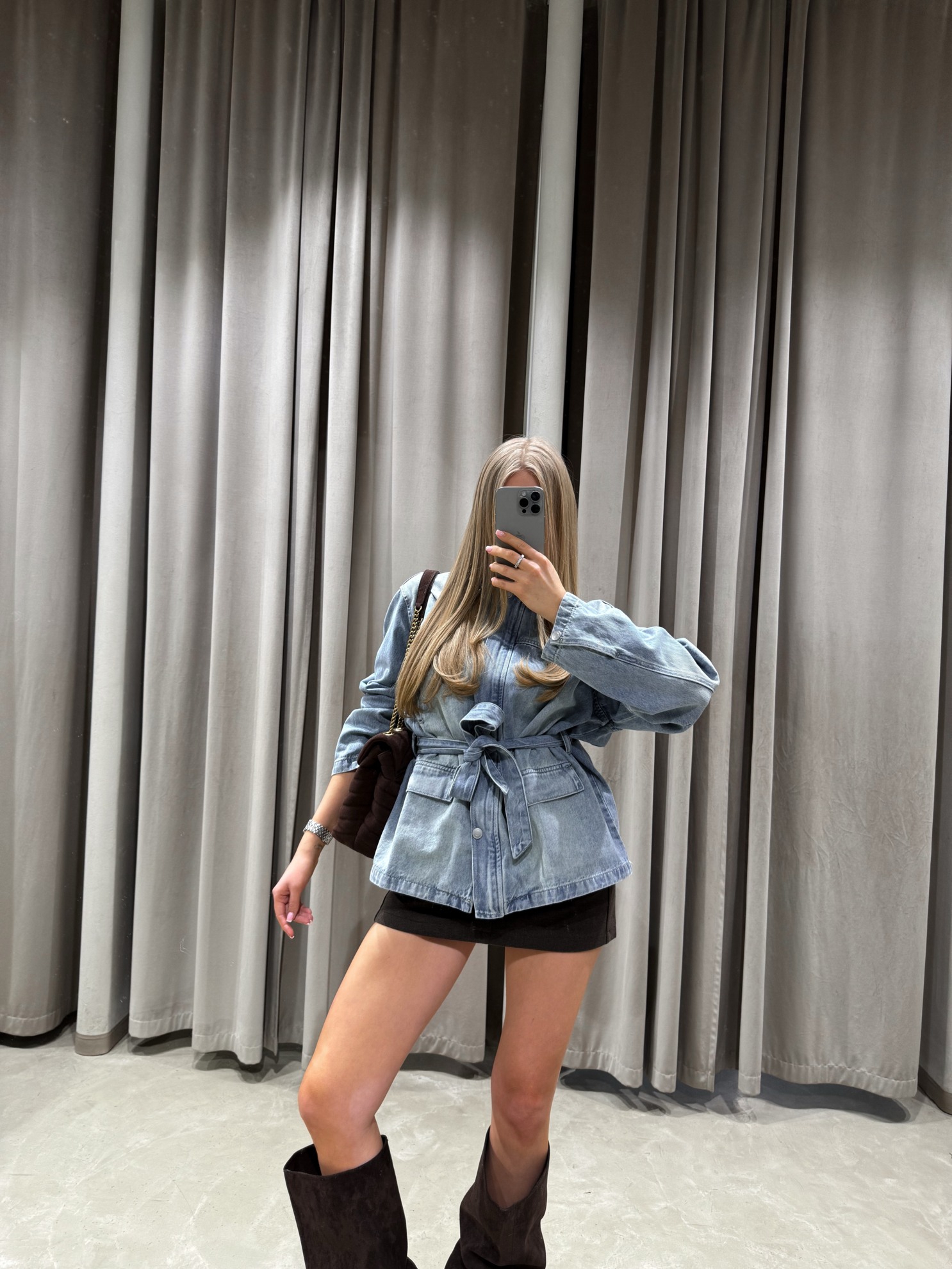 Джинсовый жакет прямого кроя с рубашечным воротником и длинными рукавами. Пояс-завязка на талии. Накладные карманы с клапанами спереди. Застежка на пуговицы по центру.