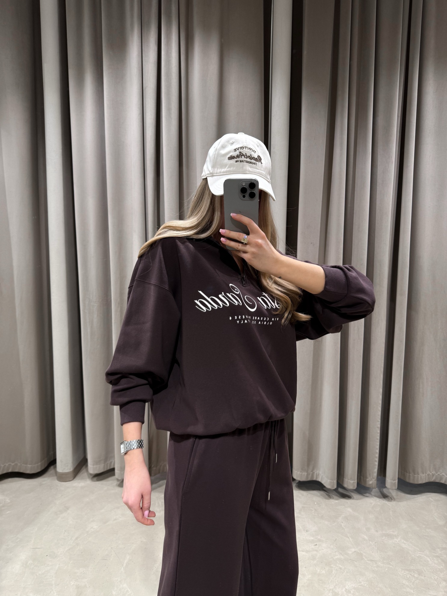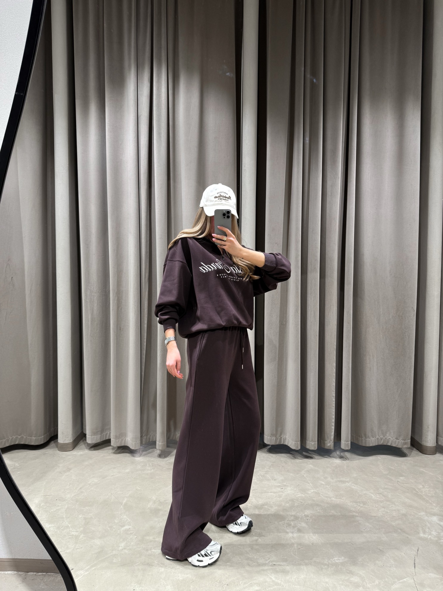 Свободный свитшот с круглым вырезом, заниженной линией плеча и принтом спереди. Брюки прямого широкого кроя с эластичным поясом на кулиске и боковыми карманами. Трикотажное полотно средней плотности.