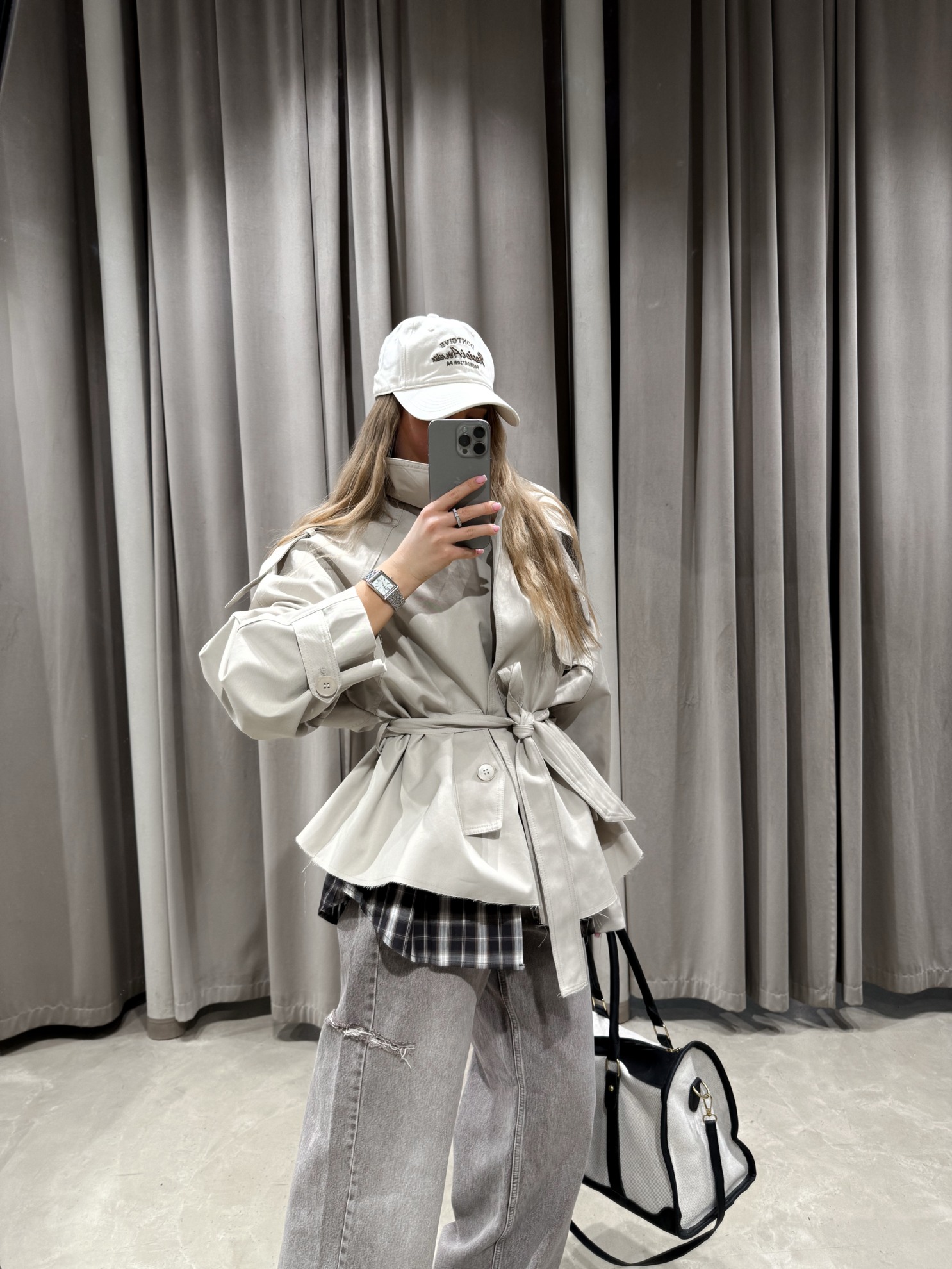 Укороченный двубортный тренч с поясом на талии и объемными рукавами. Плотная хлопковая ткань, паты на плечах и манжетах, задняя кокетка и необработанный край низа.