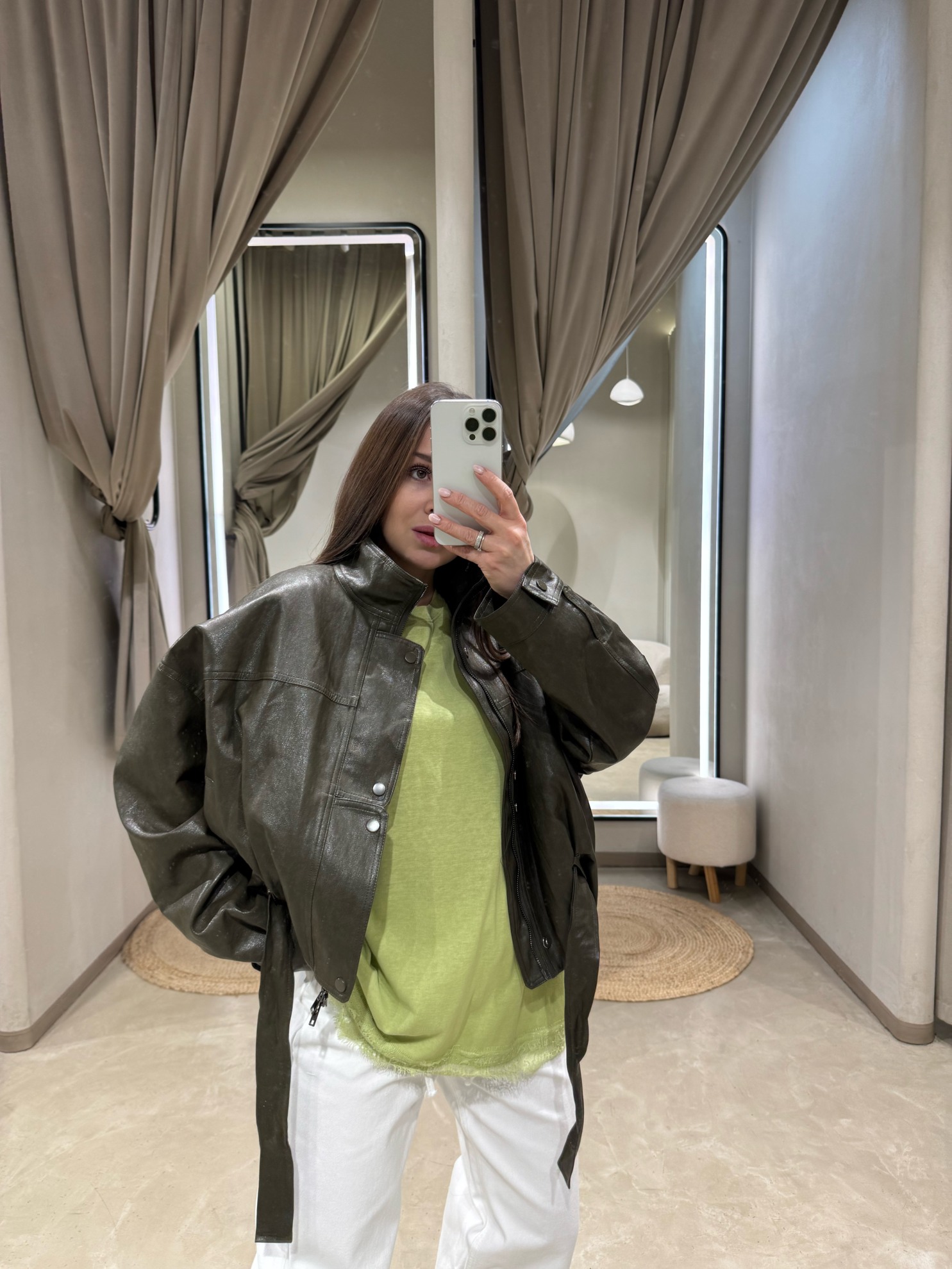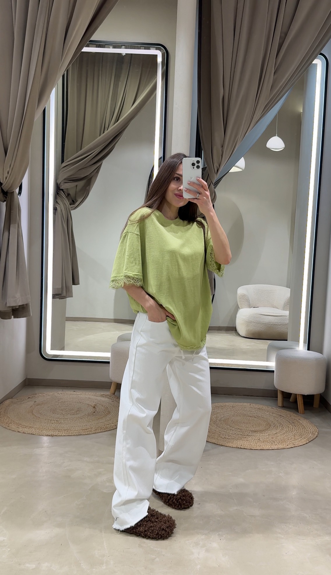Футболка прямого свободного кроя с заниженной линией плеча и кружевной отделкой по низу и краю рукавов. Круглый вырез горловины. Удлиненный силуэт до линии бедра. Трикотаж на основе хлопка.