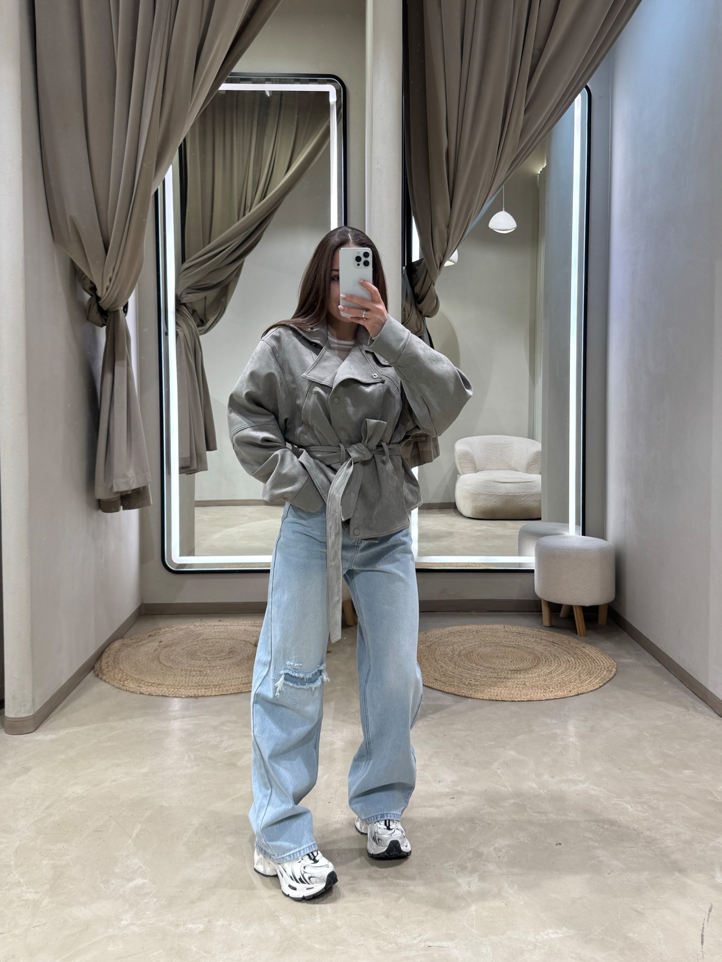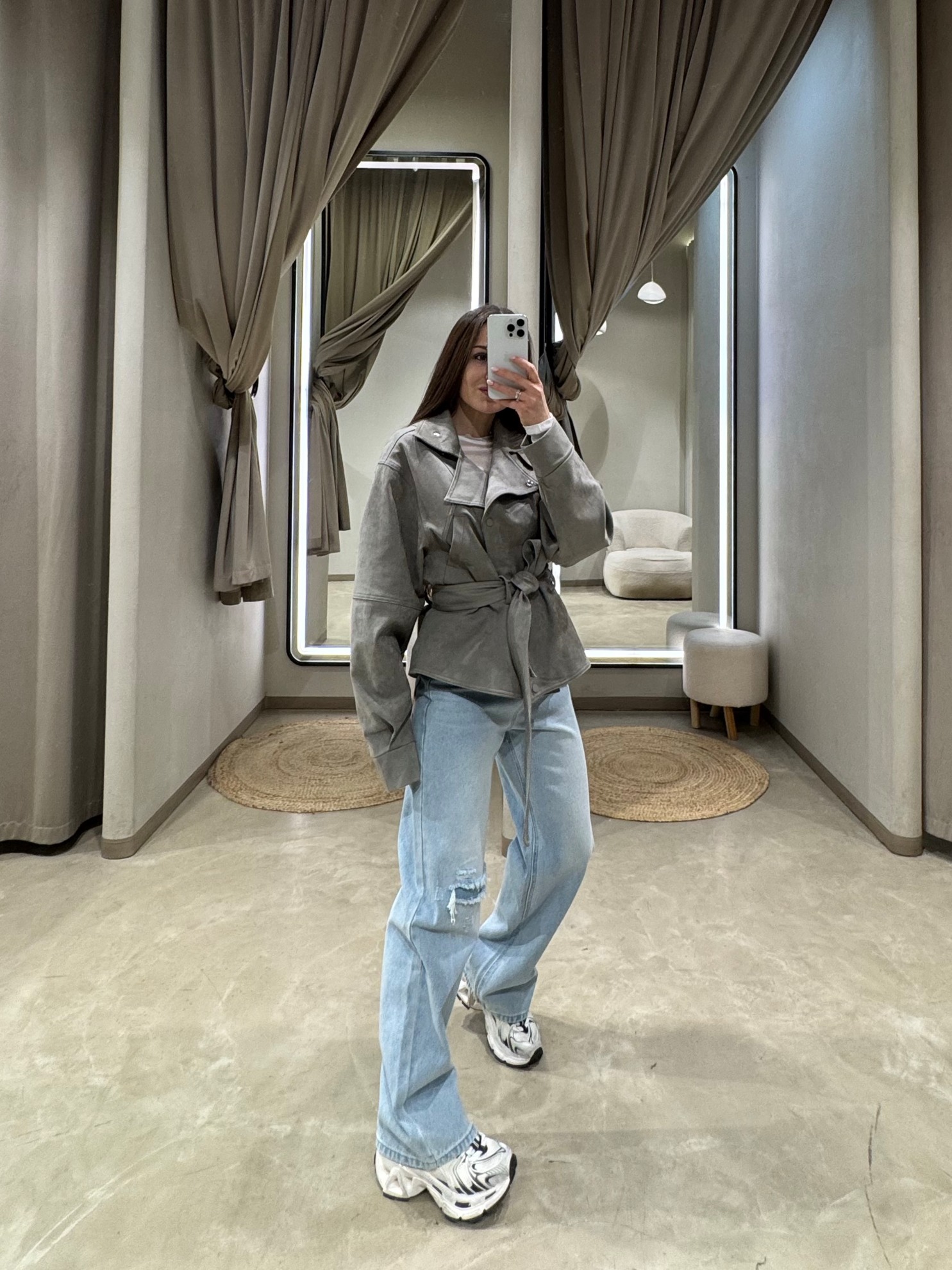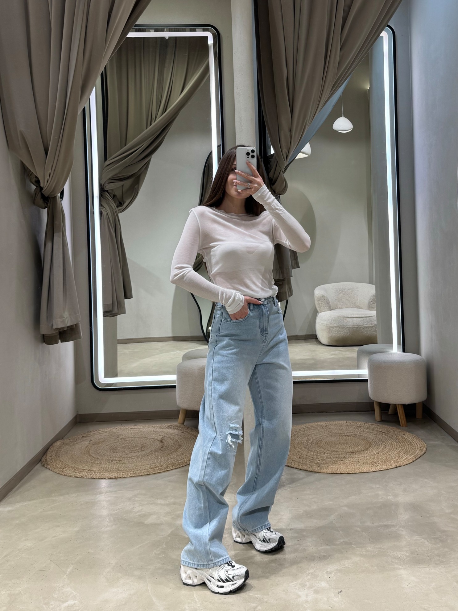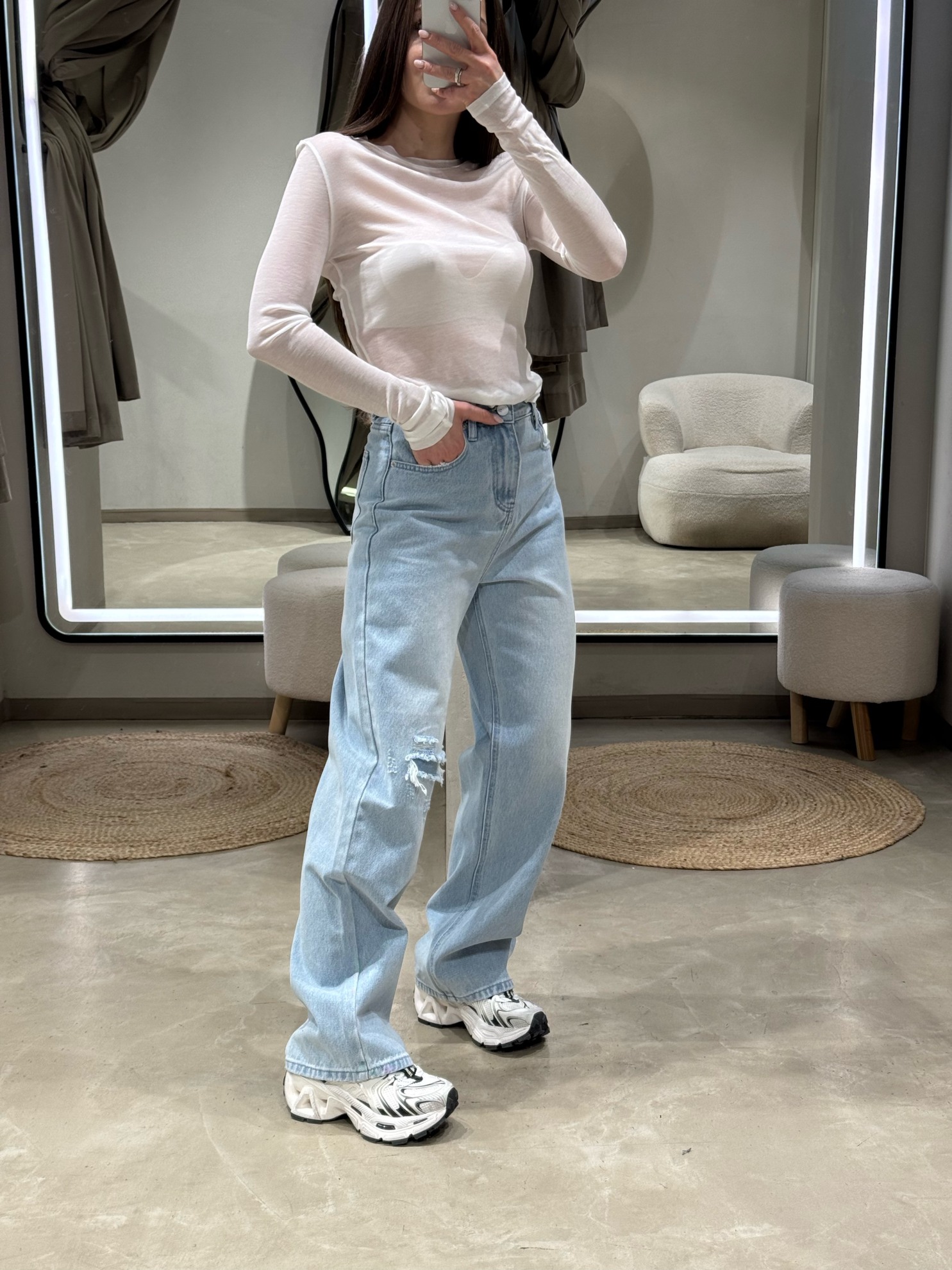 Джинсы прямого широкого кроя с высокой посадкой и легким эффектом потертости. Разрез с декоративными потертостями на бедре. Пятиточечная модель с застежкой на молнию и пуговицу, шлевками для ремня и необработанным низом брючин. Хлопковый деним светло-голубого оттенка.