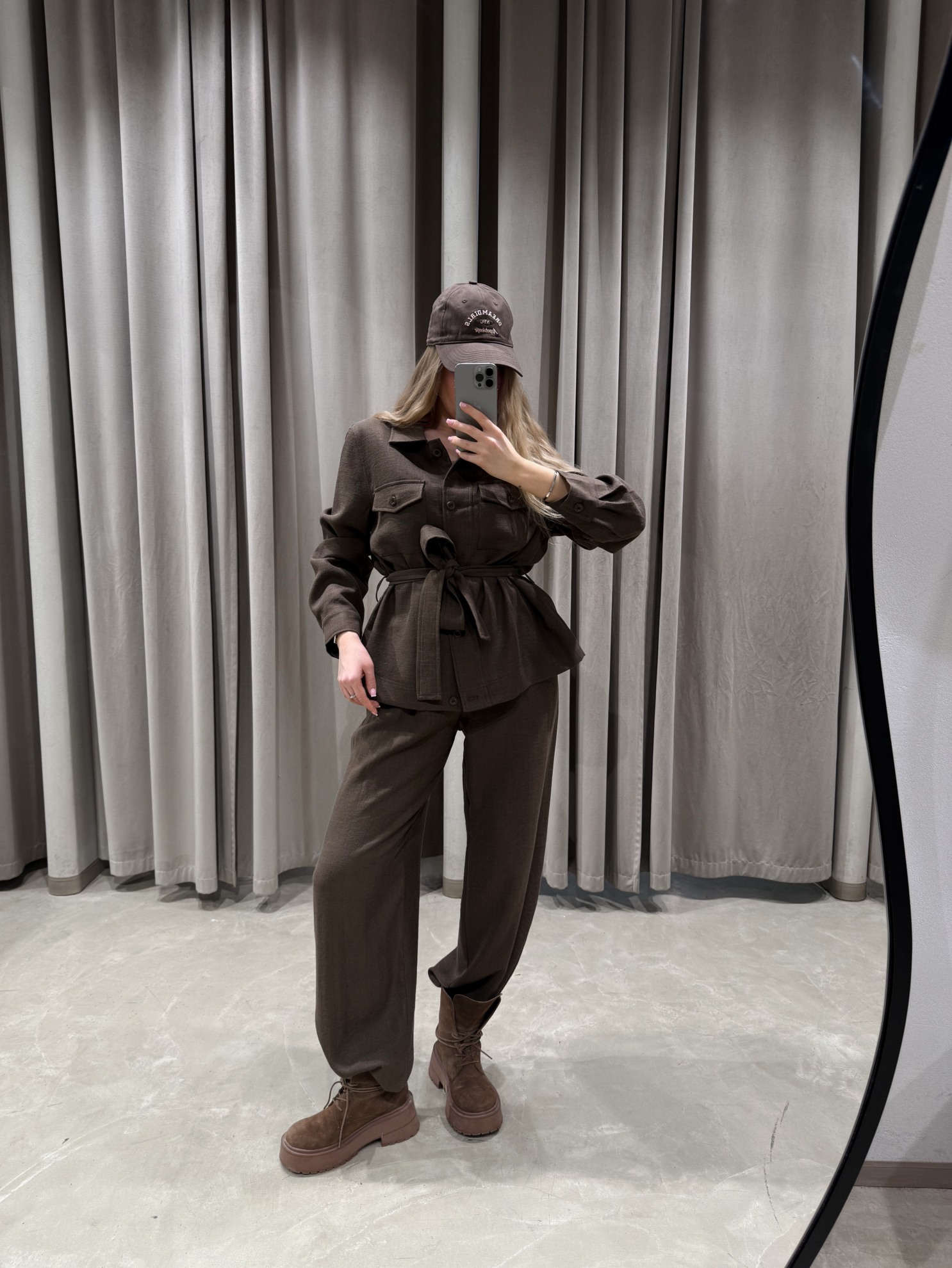 Комплект из жакета-рубашки и прямых брюк свободного кроя. Жакет с отложным воротником, накладными нагрудными карманами с клапанами, застежкой на пуговицы и поясом из основной ткани, фиксирующим линию талии. Брюки с высокой посадкой и прямой широкой штаниной.