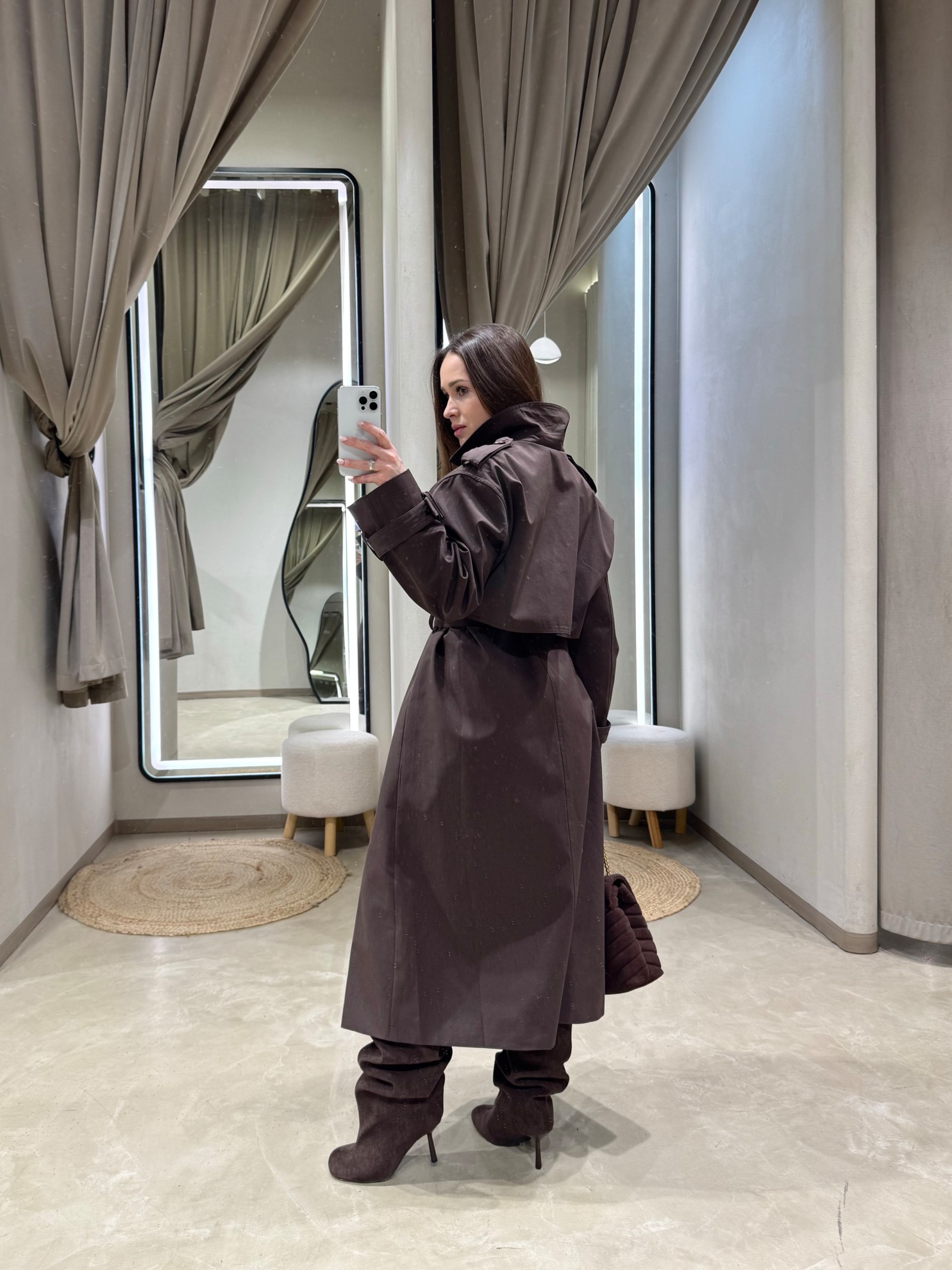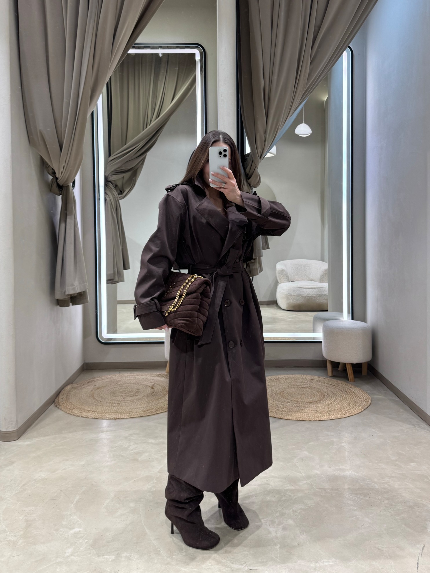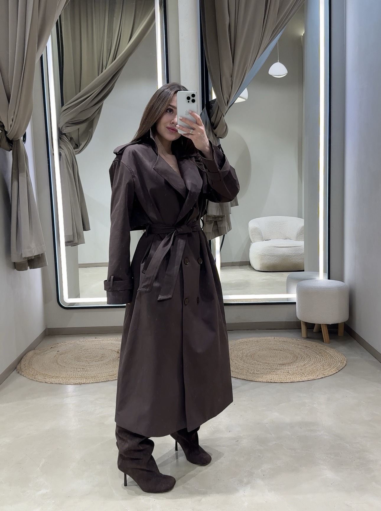 Длинный двубортный тренч прямого силуэта с поясом на талии и отложным воротником. Кокетка по спинке, паты на рукавах, шлица сзади и боковые карманы в швах из плотной ткани.