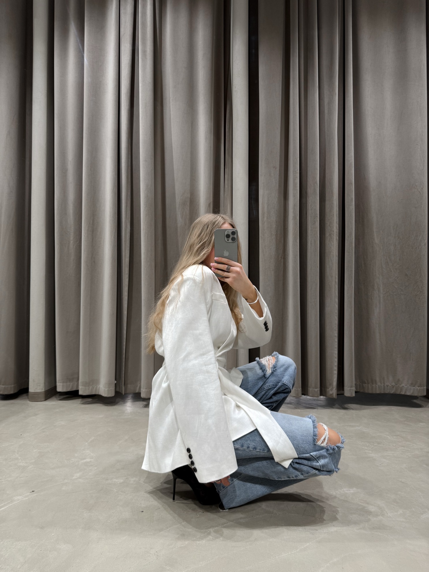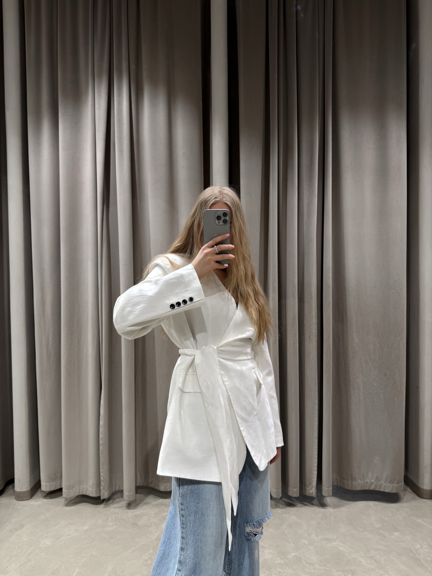 Жакет прямого силуэта с запахом и длинным поясом на завязку по талии. V-образный вырез без лацканов, удлиненный подол и длинные рукава с манжетами на пуговицах.