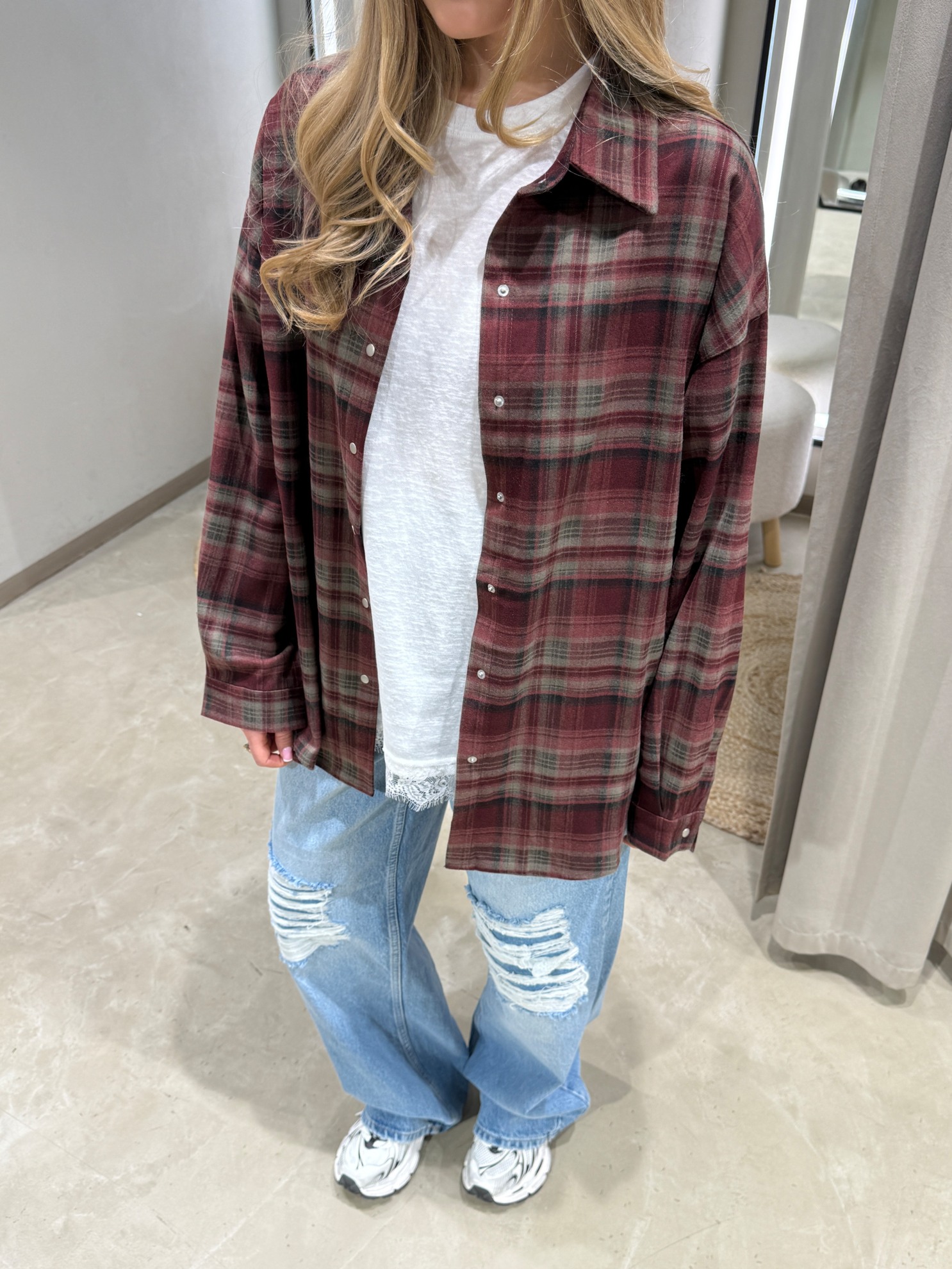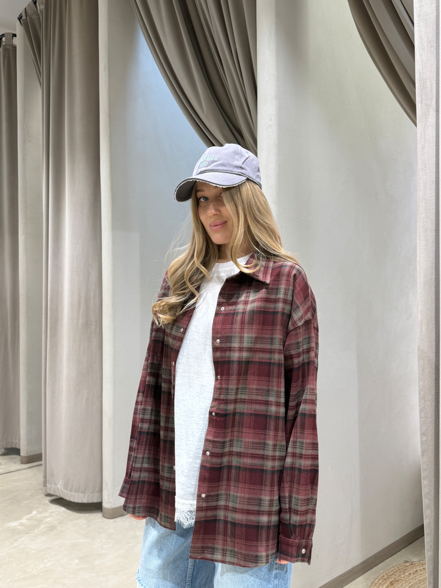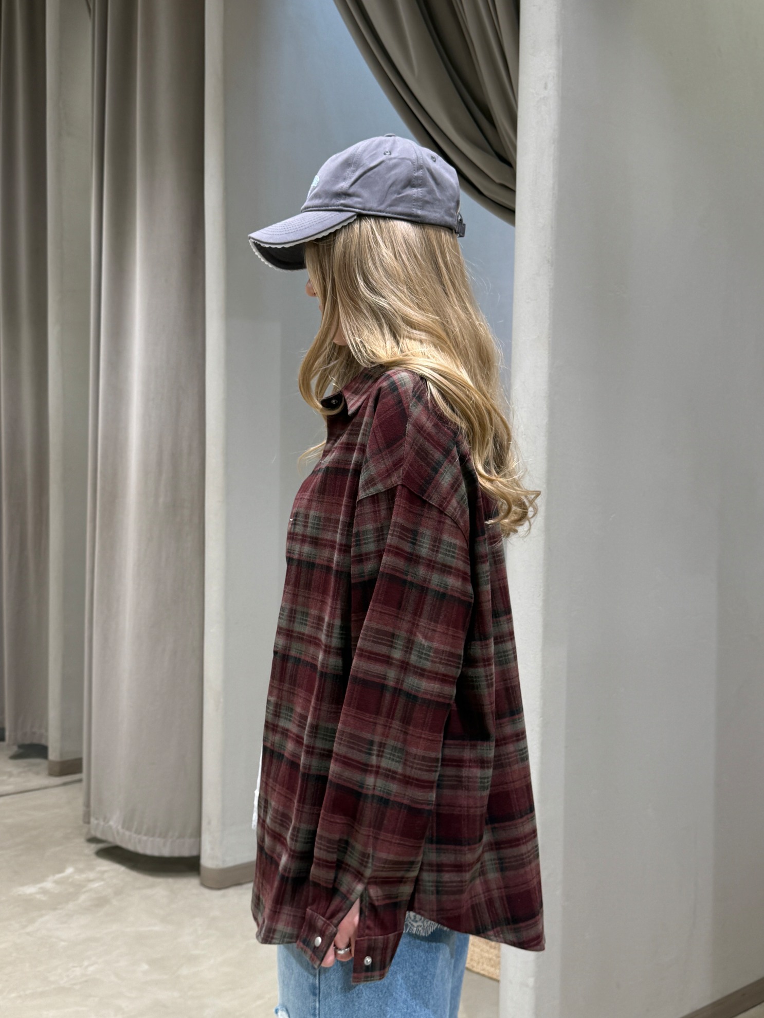 Рубашка прямого кроя с опущенной линией плеча и классическим воротником. Длинные рукава с манжетами на пуговицах. Застежка на кнопки спереди. Низ с легким закруглением. Ткань в клетку.