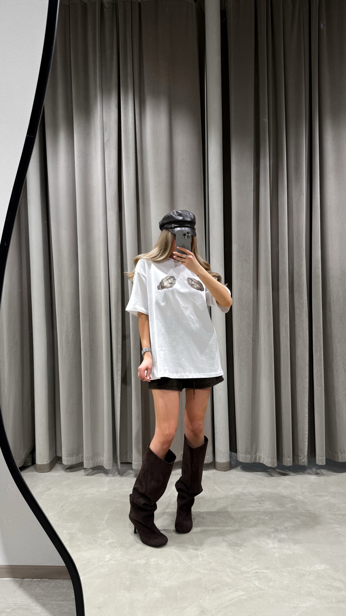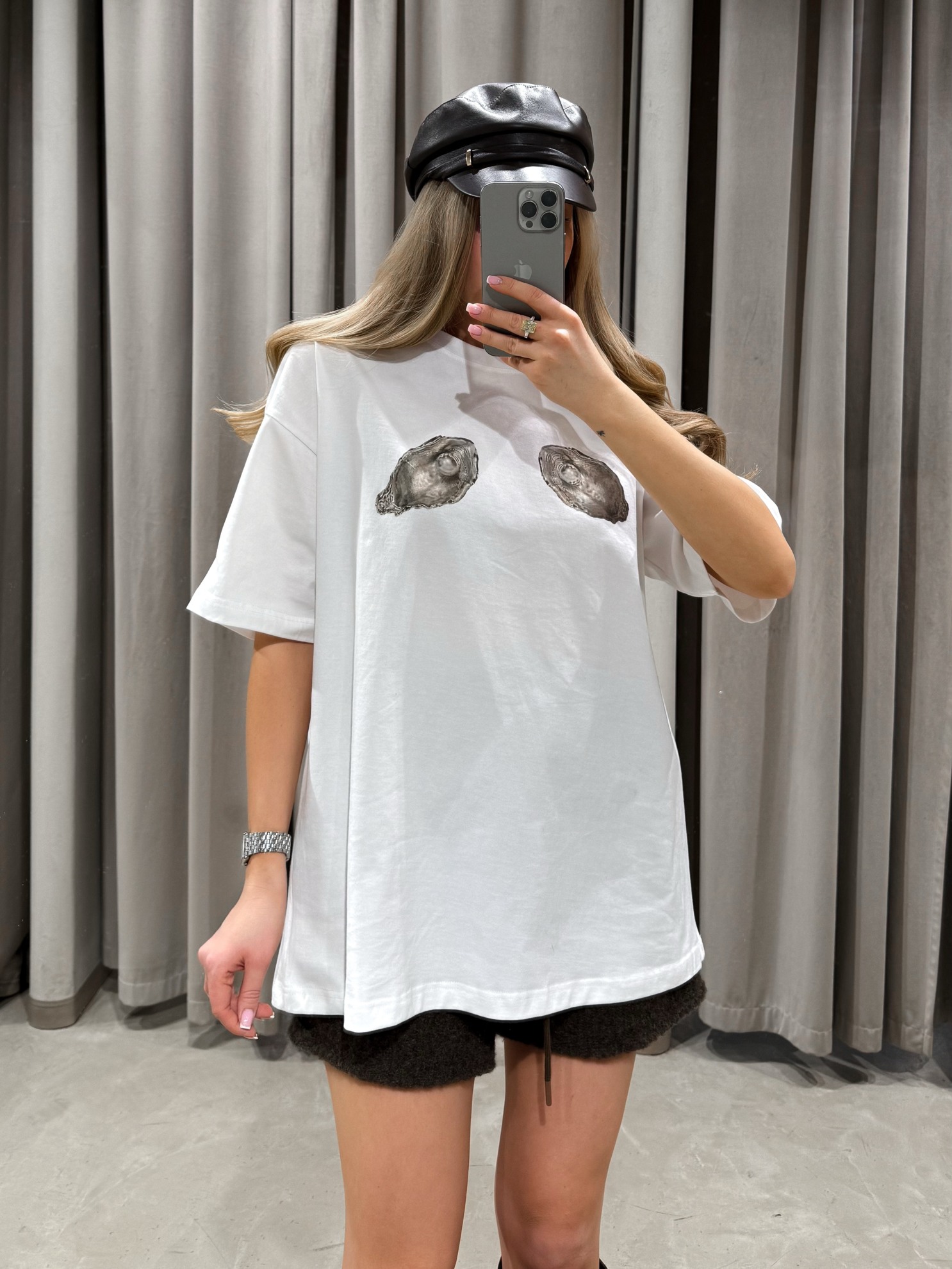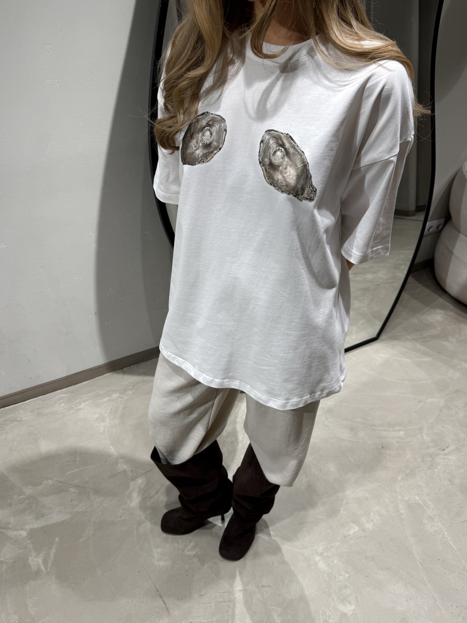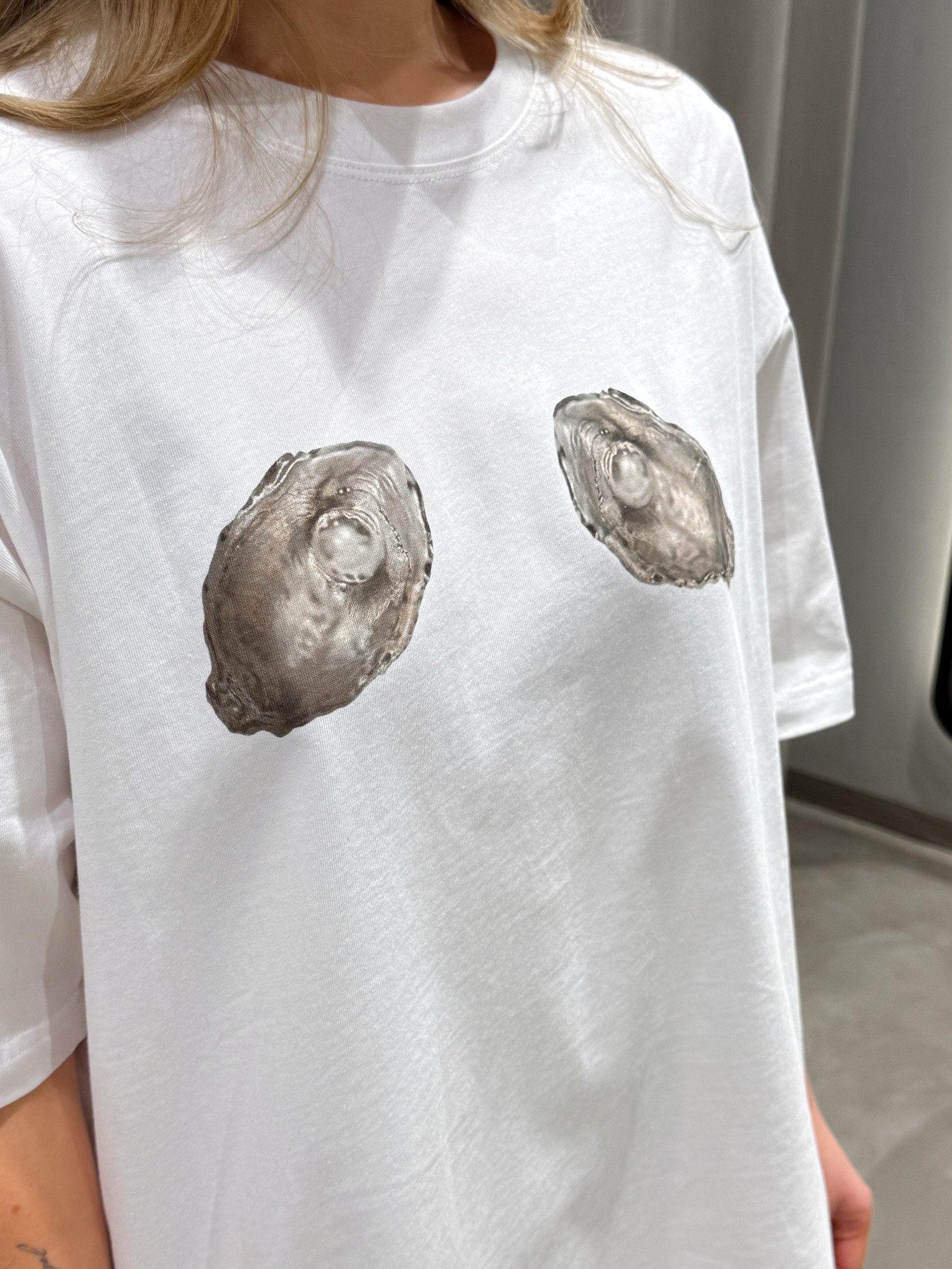 Футболка прямого кроя с короткими рукавами и круглым вырезом горловины. Контрастный принт из двух ракушек на передней части. Хлопковый трикотаж.