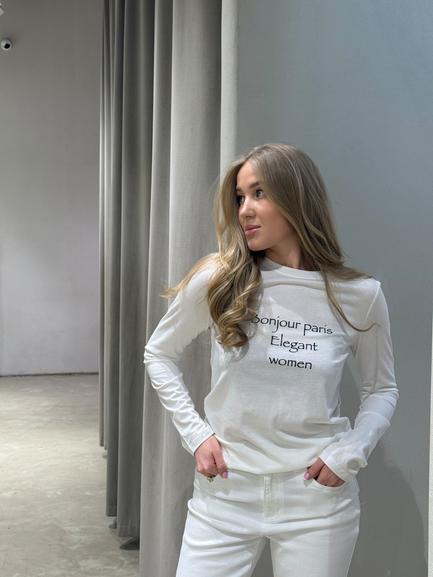 Футболка с длинным рукавом прямого кроя с округлым вырезом горловины. Гладкий трикотаж. Контрастная надпись на передней части. Прямой низ.