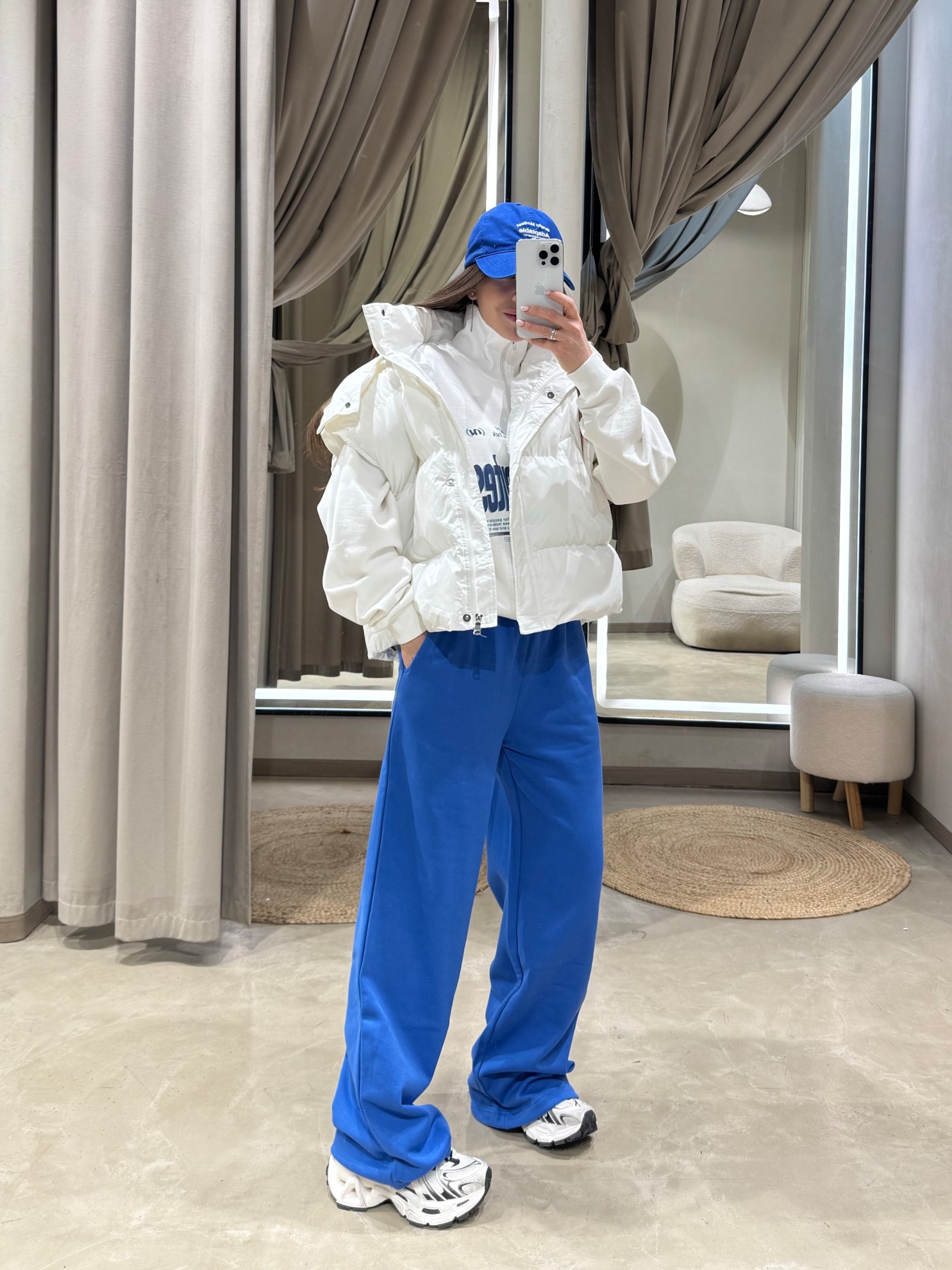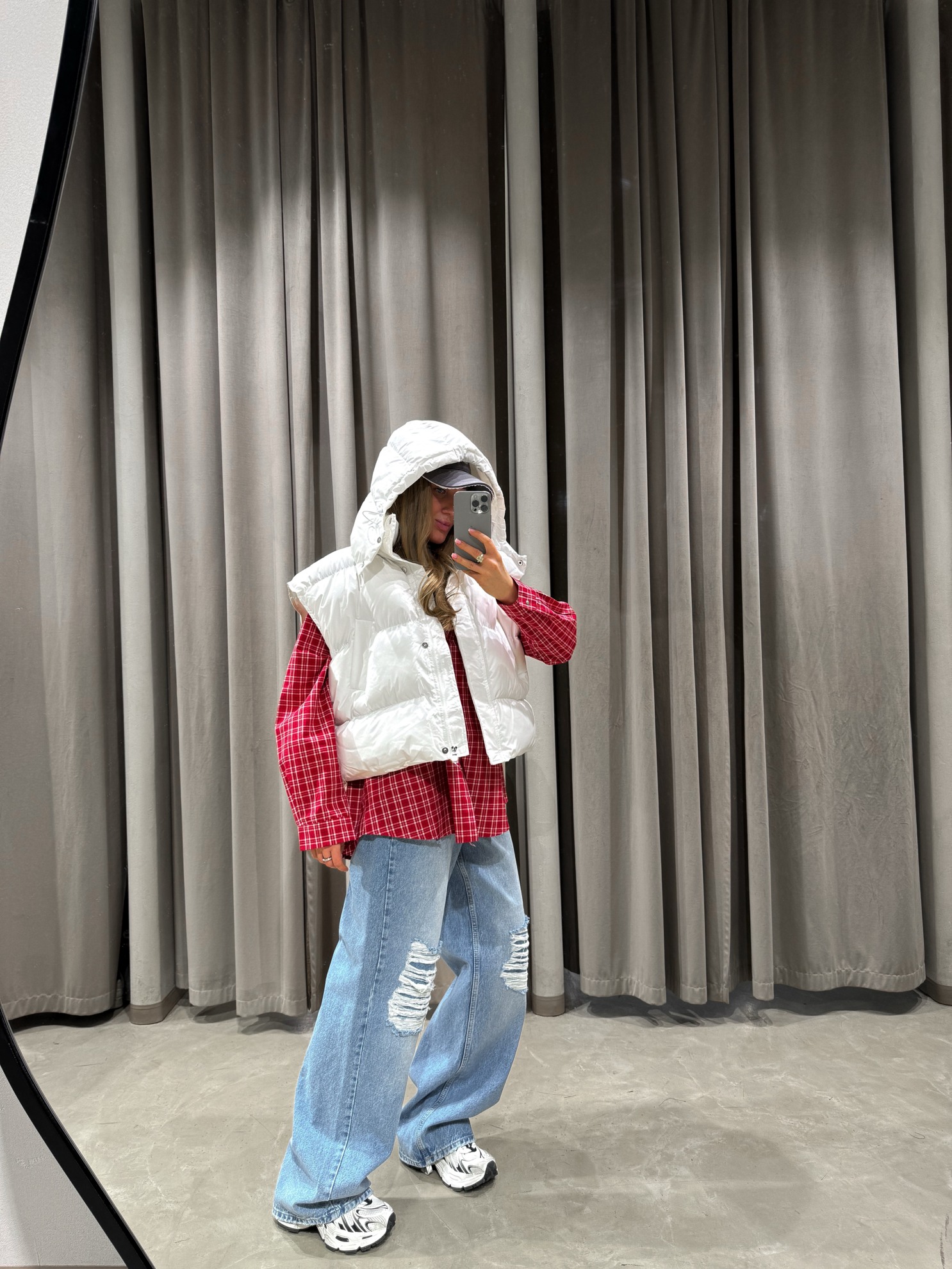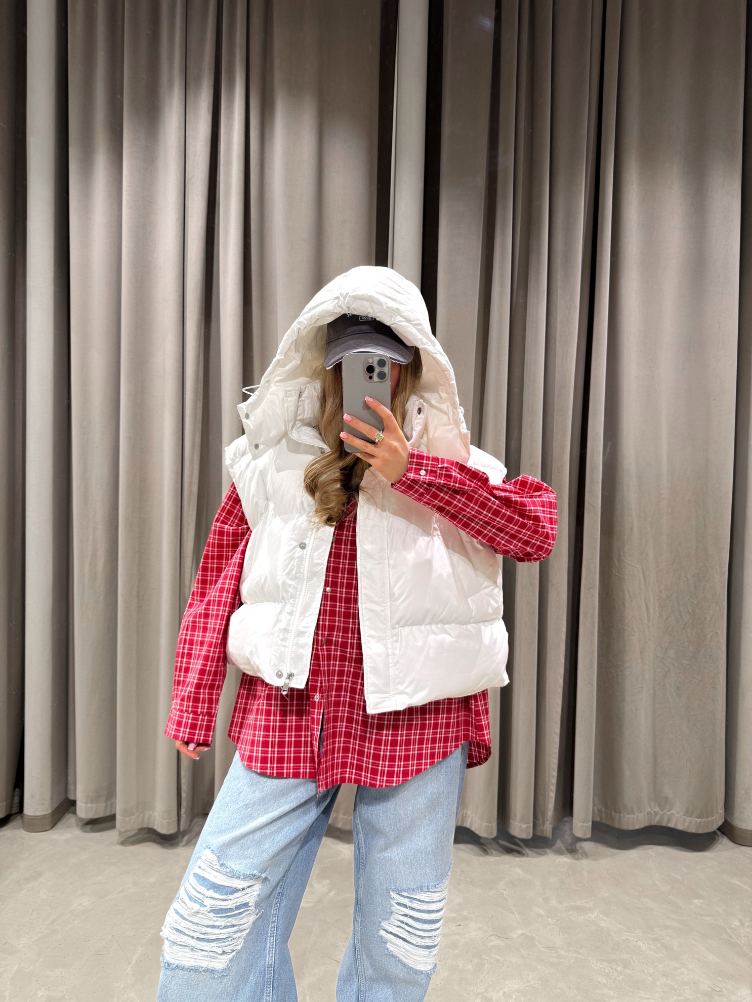Утепленный стеганый жилет прямого кроя с объемным капюшоном. Застежка на молнию и кнопки спереди. Горизонтальная простежка. Прорезные карманы по бокам. Длина до линии бедер.