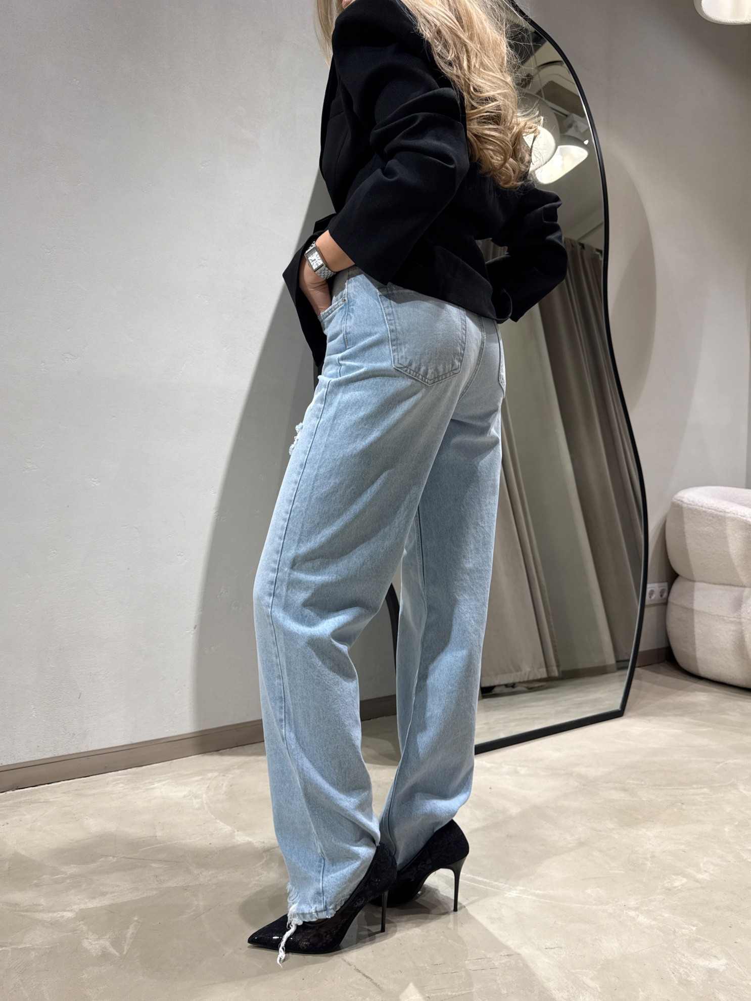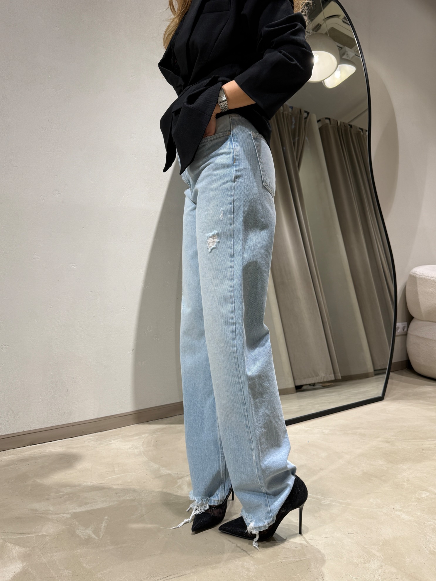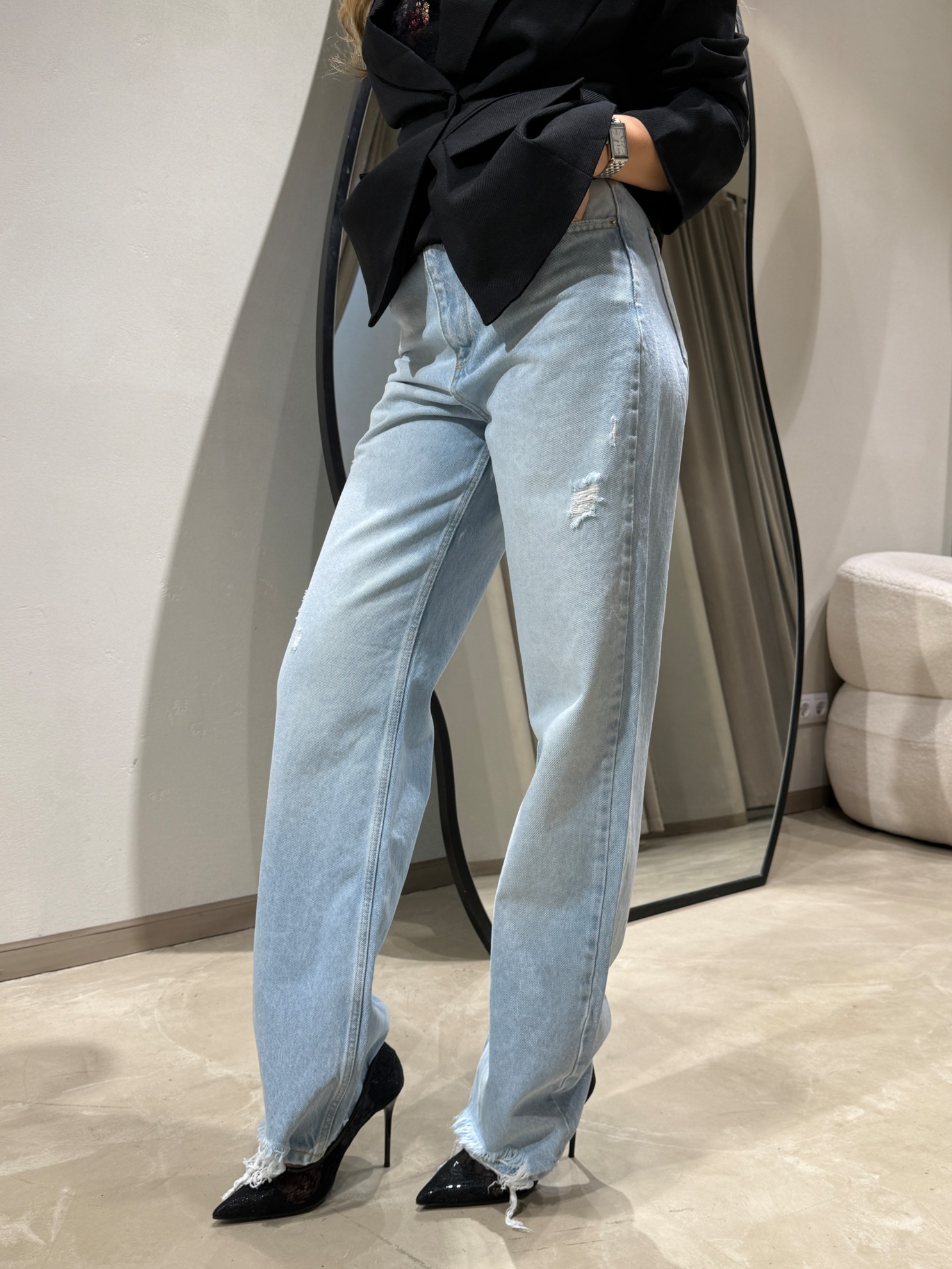 Прямые джинсы свободного кроя с высокой посадкой. Светлый хлопковый деним с легкими потертостями и небольшими разрывами. Пять карманов. Застежка на молнию и пуговицу спереди. Необработанный низ брюк.