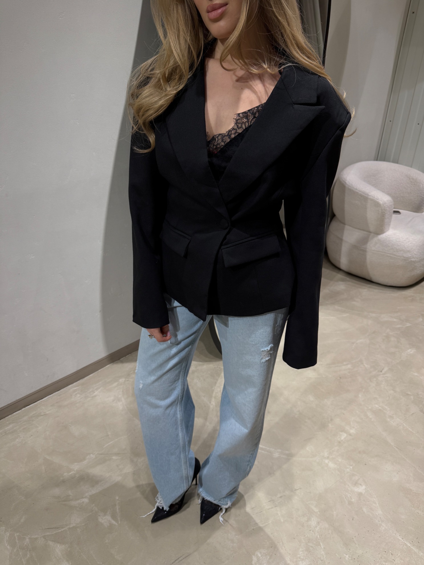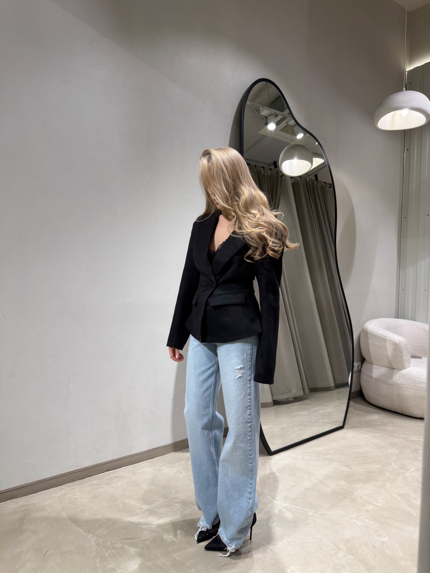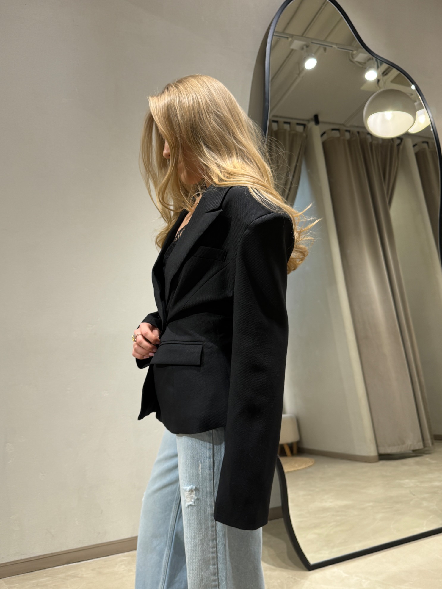 Однобортный приталенный пиджак с акцентированной линией талии и удлиненными рукавами. Английский воротник с лацканами, застежка на одну пуговицу. Боковые карманы с клапанами, длина до линии бедер. Выполнен из плотной костюмной ткани.