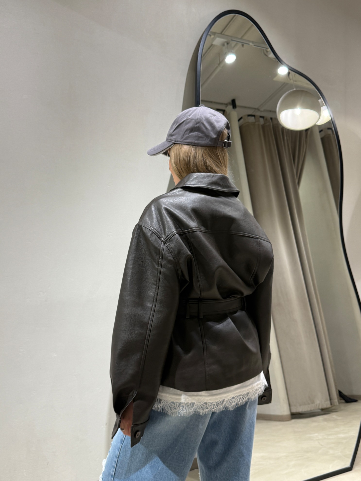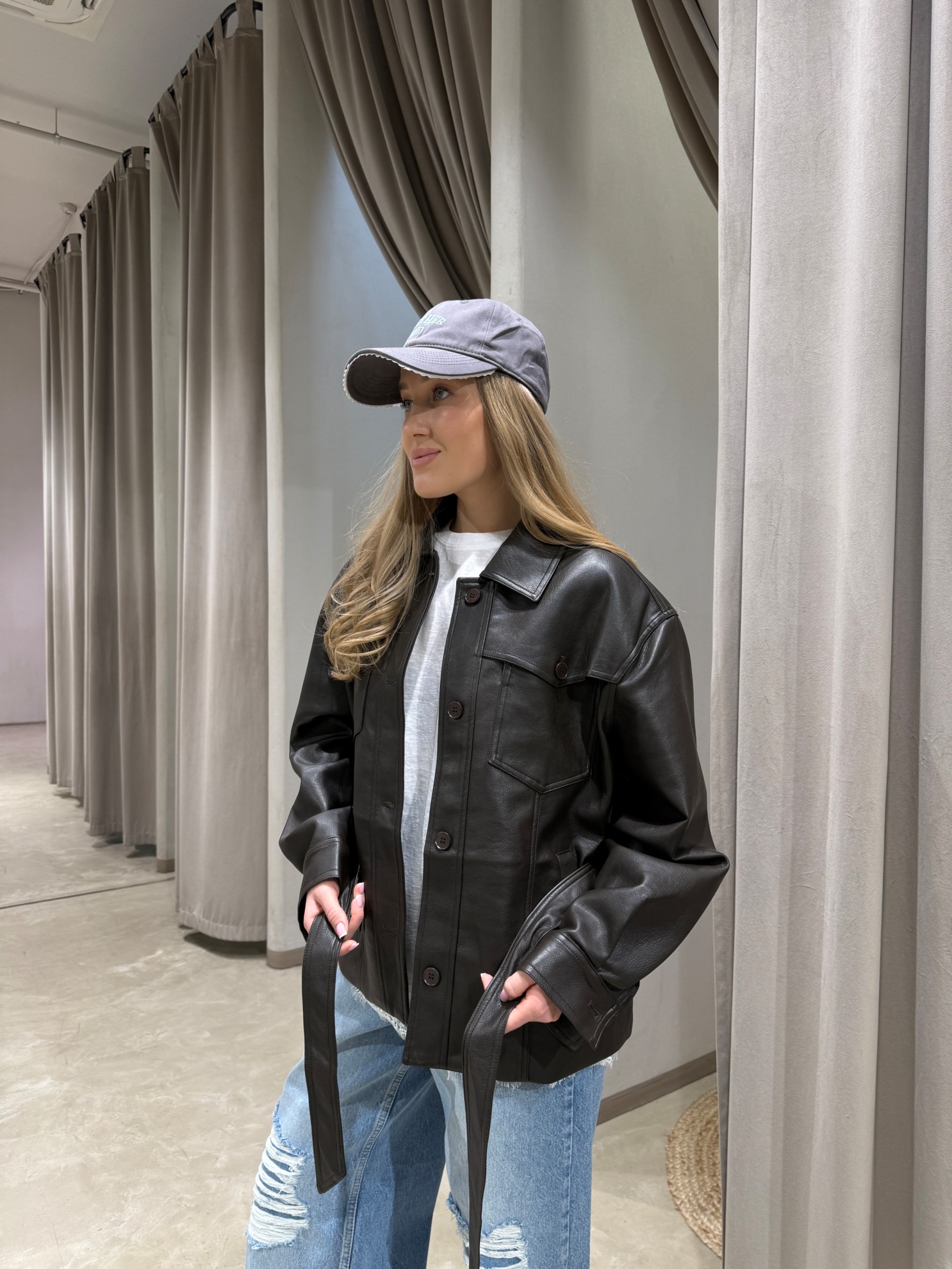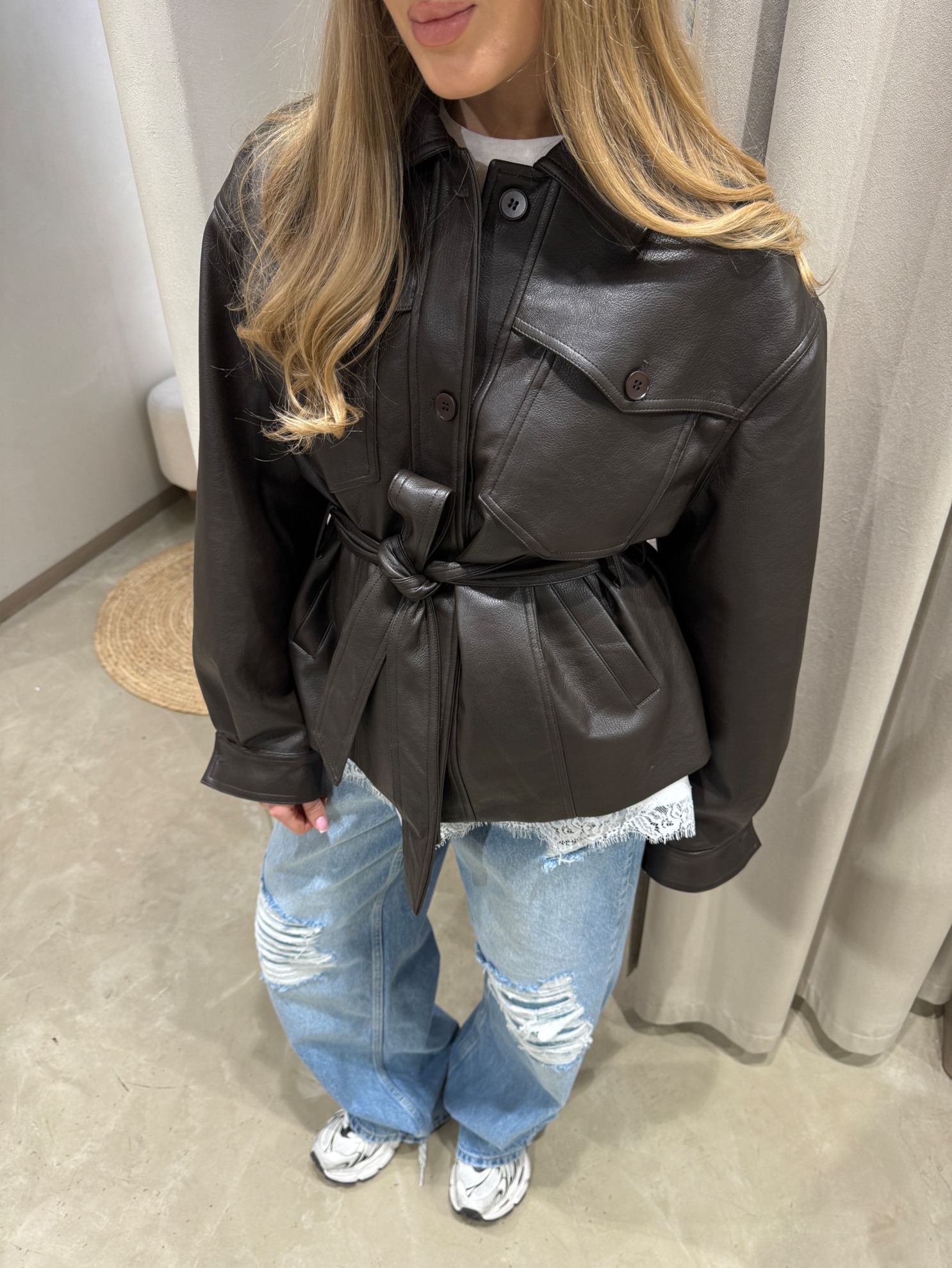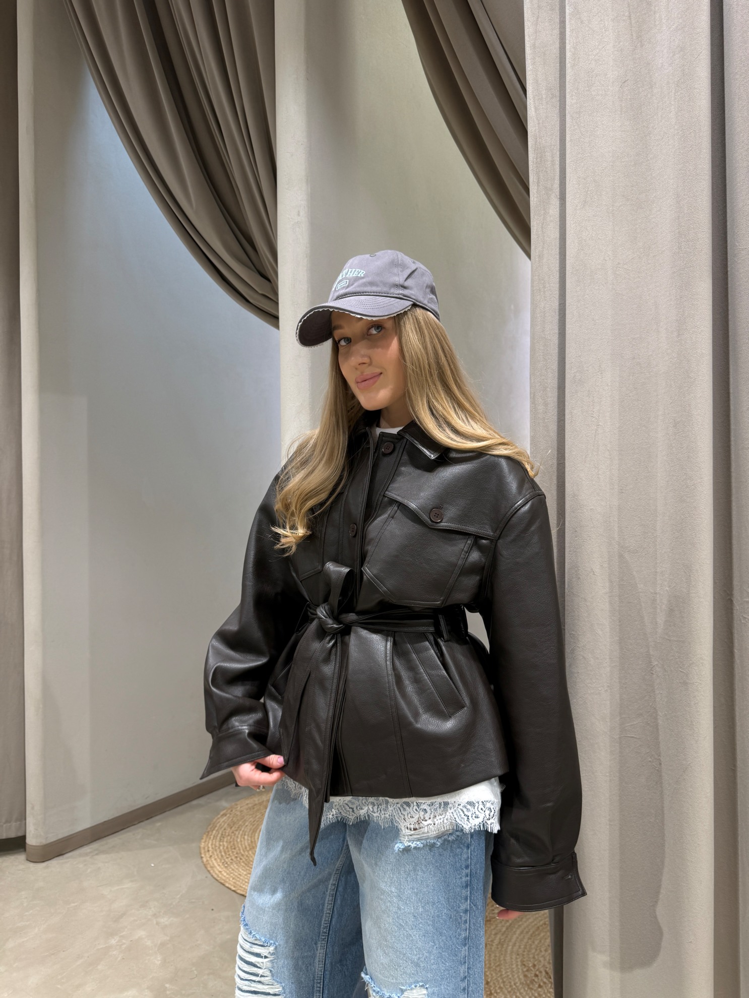 Куртка-рубашка из эко-кожи прямого кроя. Отложной воротник, накладные нагрудные карманы с клапанами, застежка на пуговицы спереди. Съемный пояс из того же материала для регулировки объема по талии. Длинные рукава с манжетами на пуговицах и разрезом у запястья.