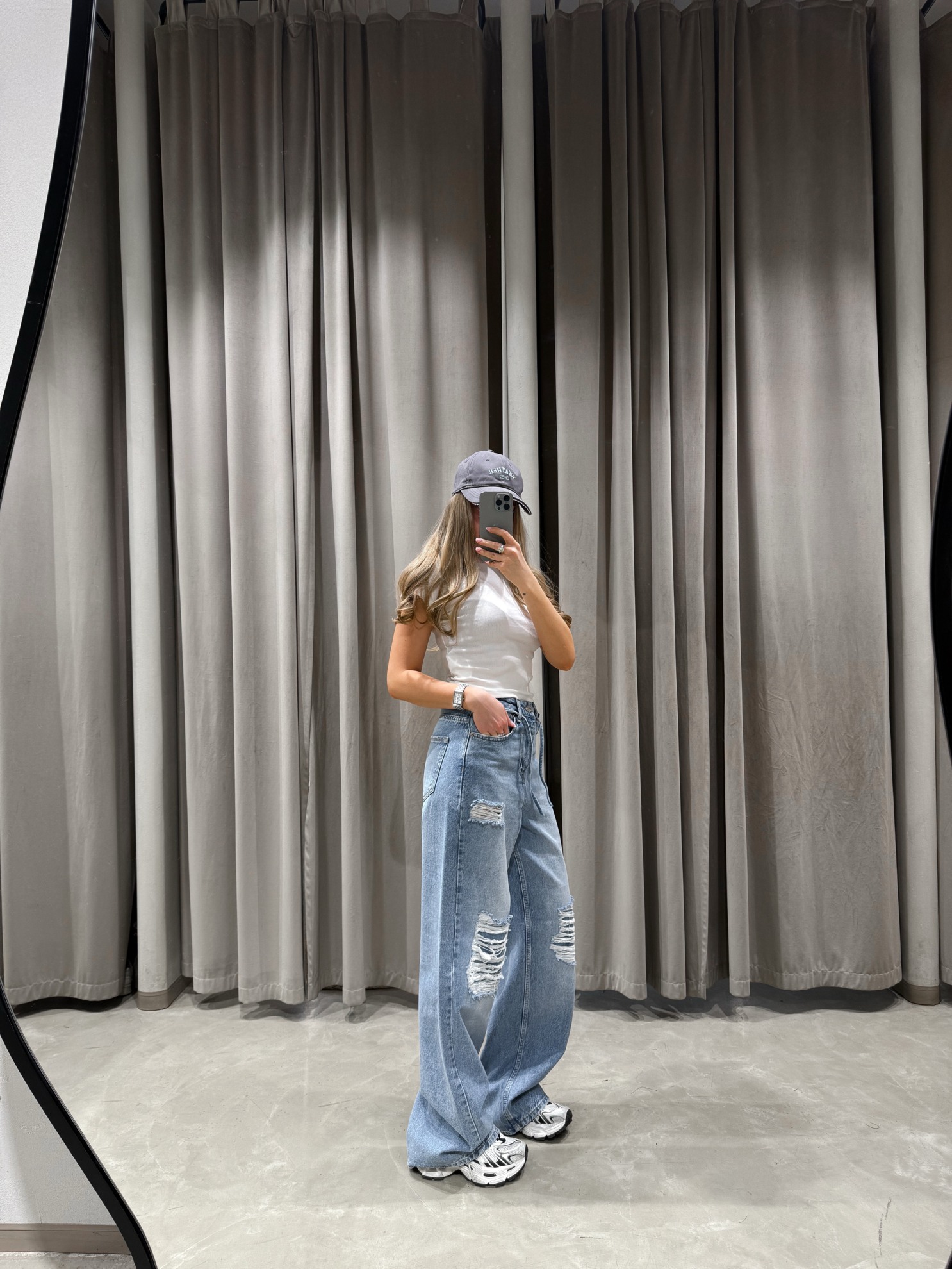 Джинсы свободного прямого кроя с высокой посадкой и удлиненной штаниной. Светлый хлопковый деним с рваными деталями и эффектом потертости спереди. Классический пятикарманный крой. Застежка на молнию и пуговицу.